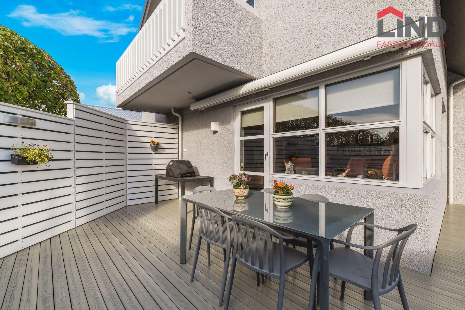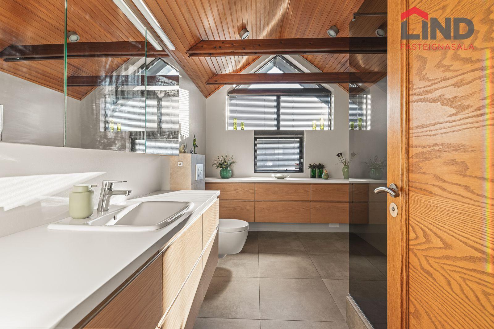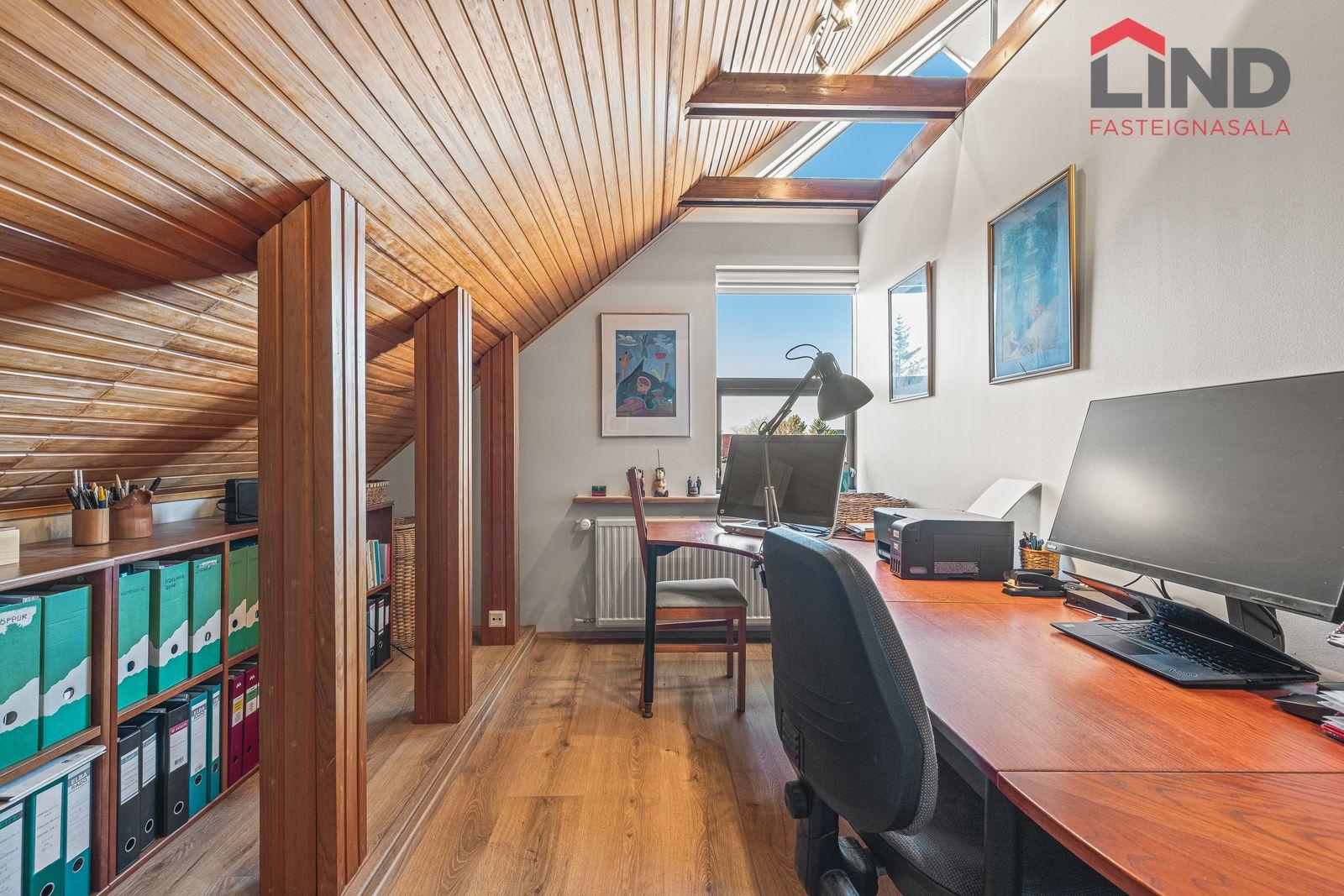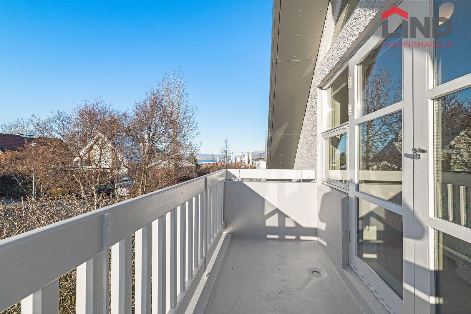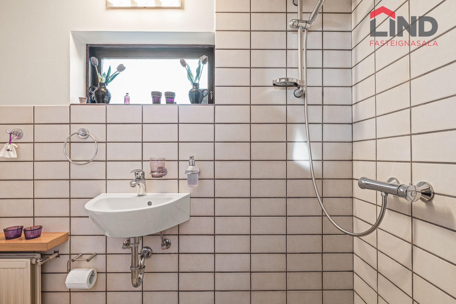 Efri hæð: Gengið upp fallegan teppalagðan stiga með glugga til norðurs. Sjónvarpsstofa (hægt að loka af og bæta við svefnherbergi): Með harðparketi á gólfi og aukinni lofthæð. Gluggar til austurs og góð lokuð súðageymsla. Svefnherbergi II (hjónaherbergi): Er stórt með aukinni lofthæð, harðparketi á gólfi og góðum skápum. Lokuð súðageymsla og glugga til vesturs. Útgengi á svalir. Svalir: Svalir snúa inn í bakgarð hússins til vesturs. Baðherbergi II: Var endurnýjað árið 2020 á afar fallegan máta. Stórt með flísum á gólfi og gólfhita. Flísalögð sturta með innb. Hansa blöndunartækjum. Mikið skápapláss er á baðherbergi og falleg innrétting við vask með speglaskáp fyrir ofan. Upphengt salerni, handklæðaofn og gluggi til suðurs. Svefnherbergi III: Er stórt með harðparketi á gólfi og skápum. Aukin lofthæð og gluggar til austurs. Svefnherbergi IV: Með harðparketi á gólfi, aukinni lofthæð og glugga til vesturs.