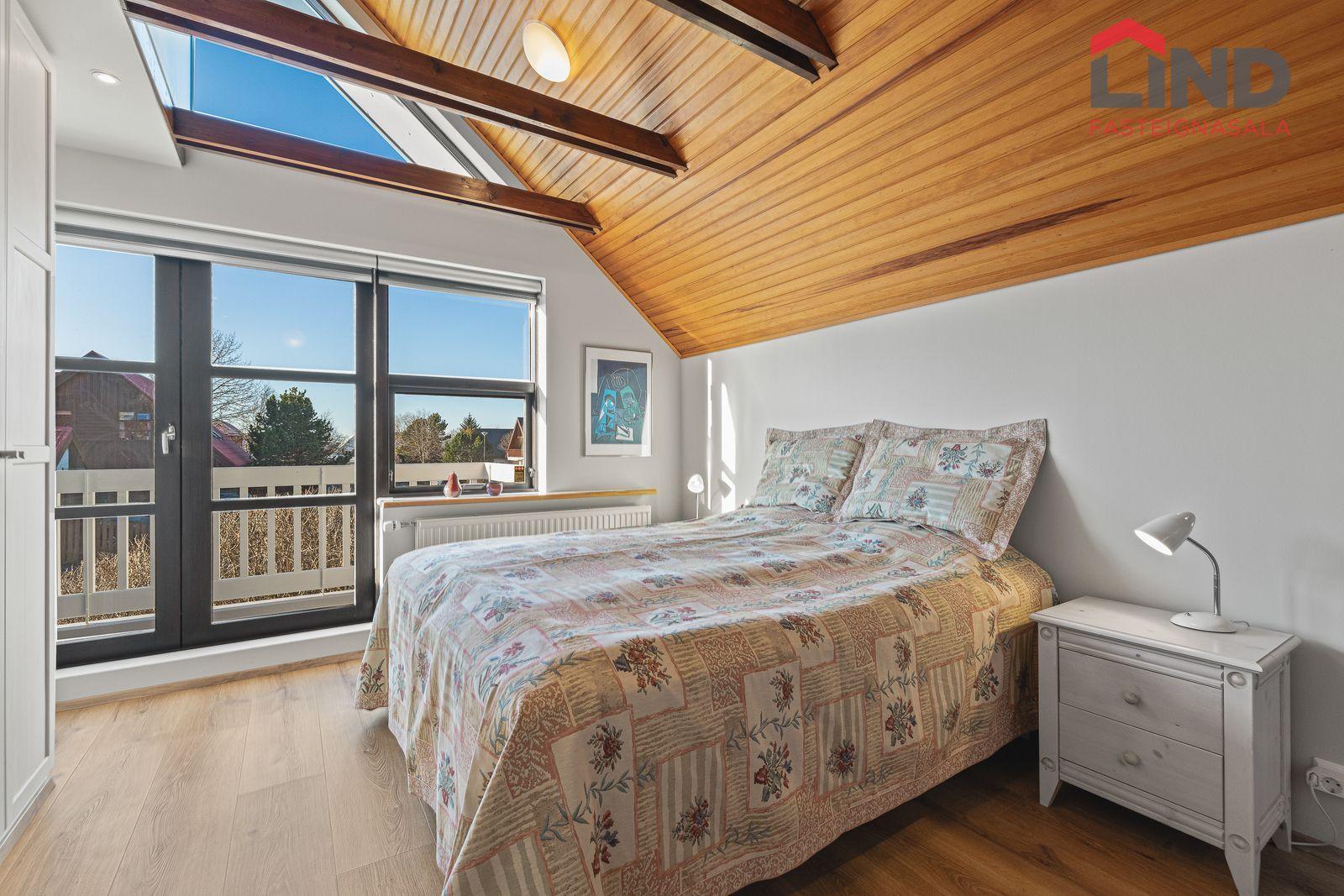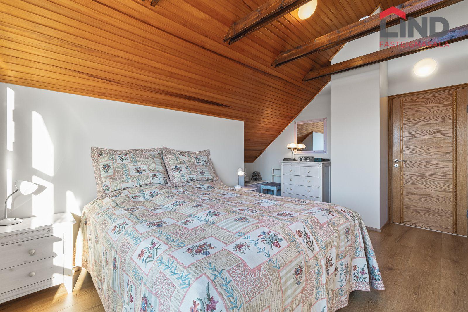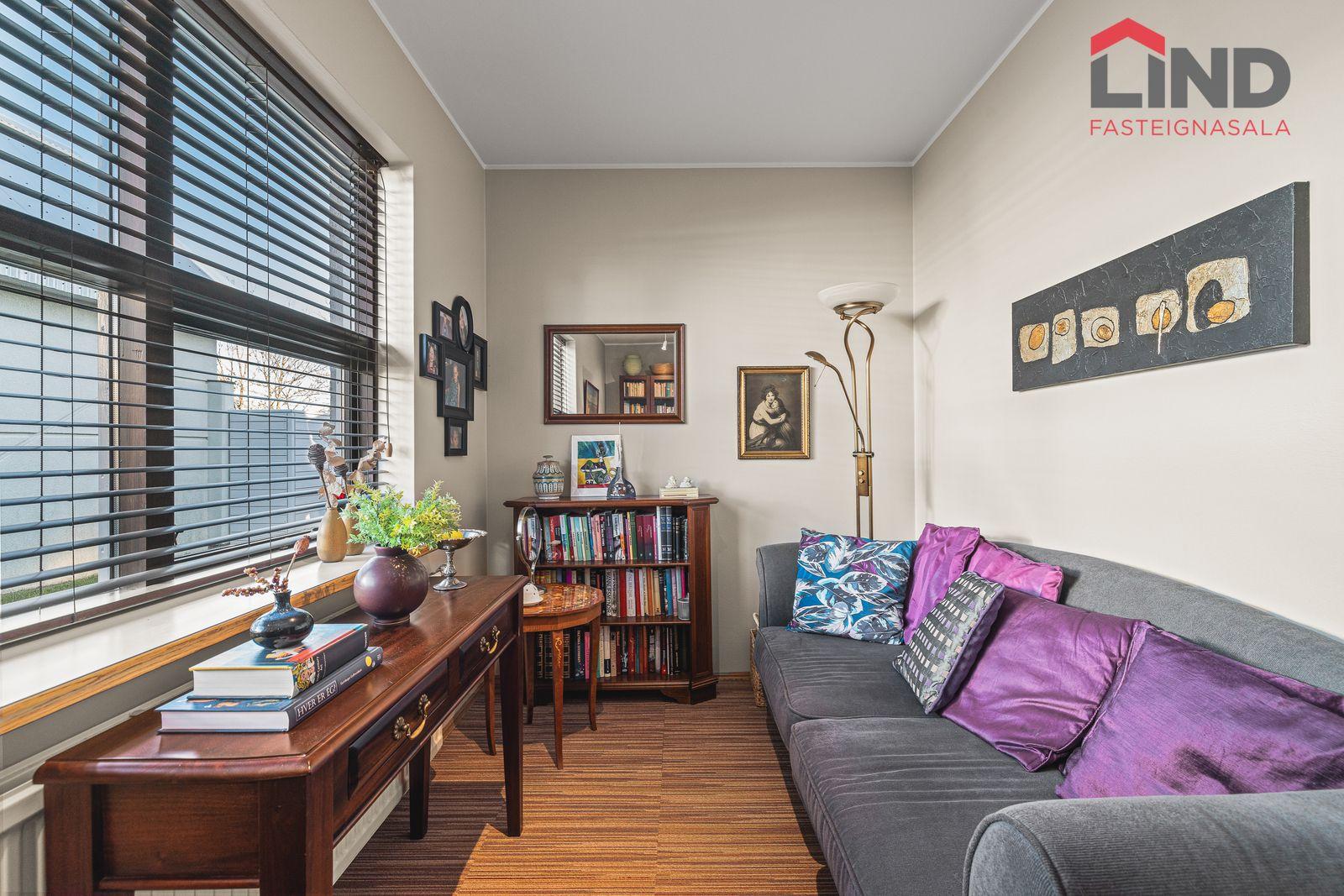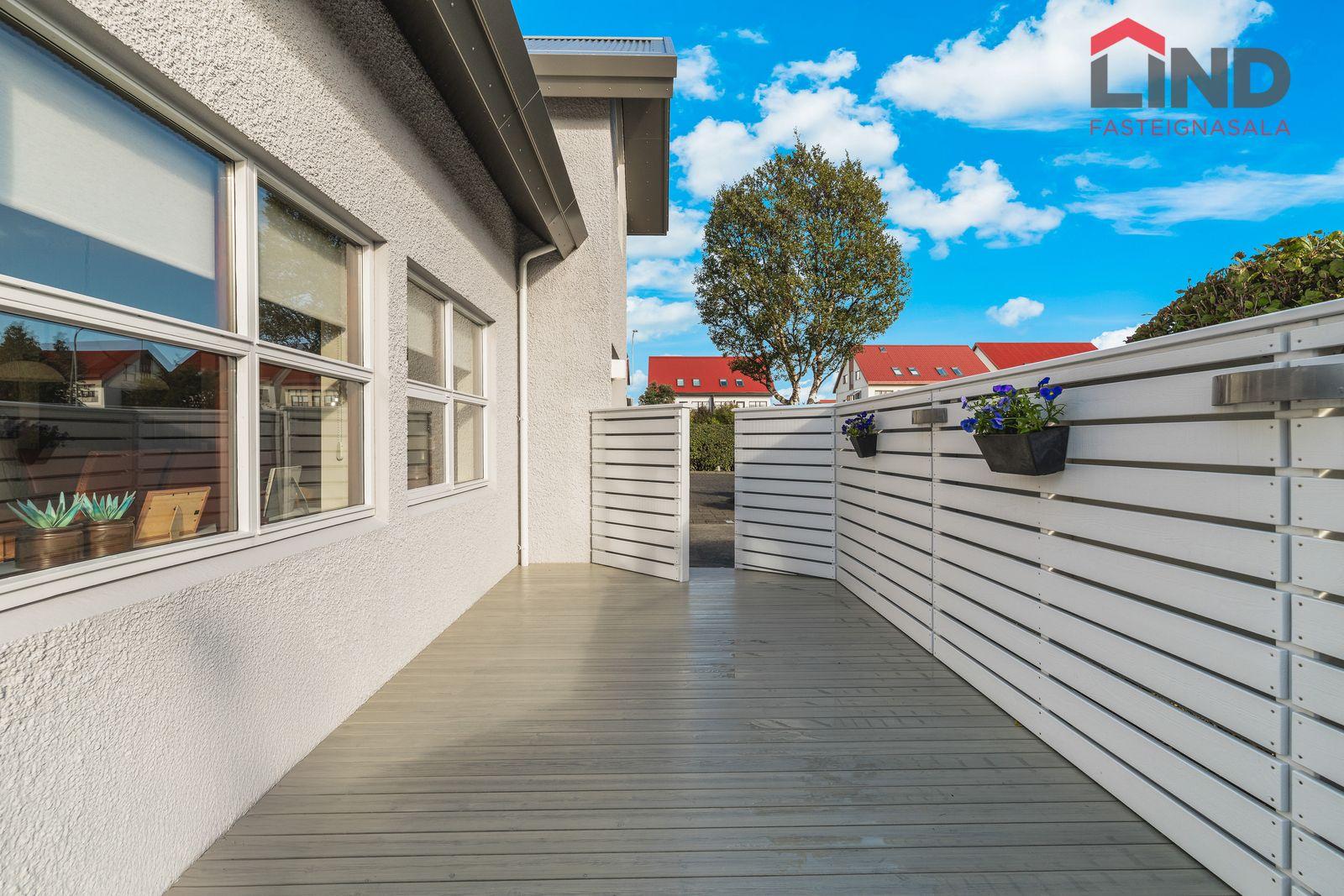 Efri hæð: Gengið upp fallegan teppalagðan stiga með glugga til norðurs. Sjónvarpsstofa (hægt að loka af og bæta við svefnherbergi): Með harðparketi á gólfi og aukinni lofthæð. Gluggar til austurs og góð lokuð súðageymsla. Svefnherbergi II (hjónaherbergi): Er stórt með aukinni lofthæð, harðparketi á gólfi og góðum skápum. Lokuð súðageymsla og glugga til vesturs. Útgengi á svalir. Svalir: Svalir snúa inn í bakgarð hússins til vesturs. Baðherbergi II: Var endurnýjað árið 2020 á afar fallegan máta. Stórt með flísum á gólfi og gólfhita. Flísalögð sturta með innb. Hansa blöndunartækjum. Mikið skápapláss er á baðherbergi og falleg innrétting við vask með speglaskáp fyrir ofan. Upphengt salerni, handklæðaofn og gluggi til suðurs. Svefnherbergi III: Er stórt með harðparketi á gólfi og skápum. Aukin lofthæð og gluggar til austurs. Svefnherbergi IV: Með harðparketi á gólfi, aukinni lofthæð og glugga til vesturs.