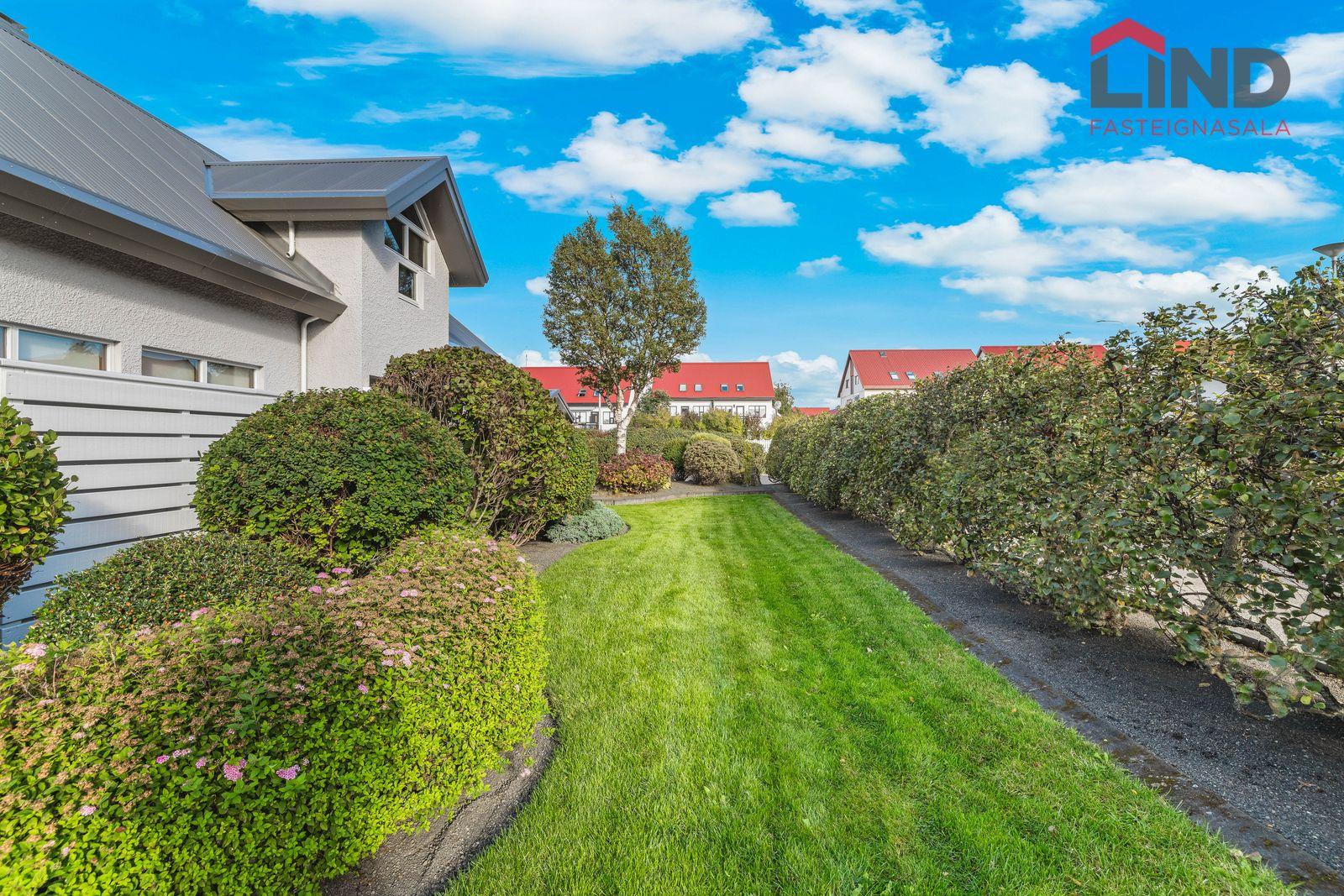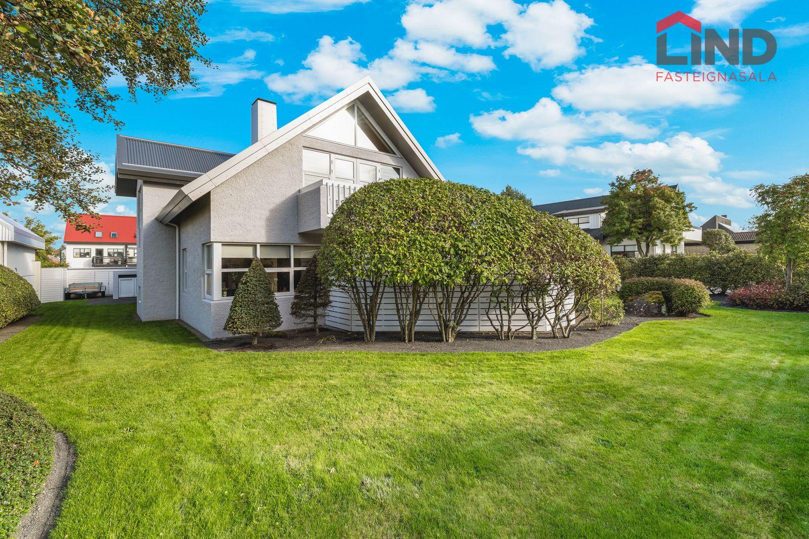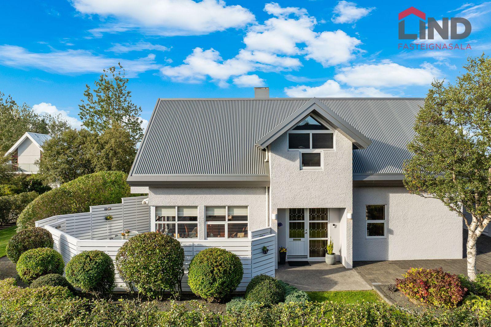 Falleg 691,0 fermetra gróin lóð með hellulögðum bílastæðum með snjóbræðslu að hluta. Lóðin er falleg með tyrfðum flötum og fallegum gróðri. Rúmgóð verönd sem snýr til suðurs og vesturs þar sem sólar nýtur allan daginn. Húsið er staðsett í rólegum botnlanga í námunda við afar fallegar göngu- og hjólaleiðir í næsta nágrenni við Elliðaárdalinn.