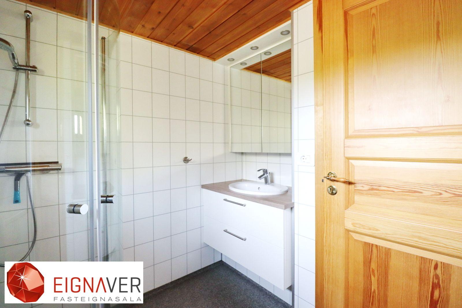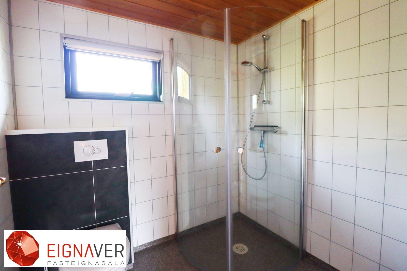 Baðherbergi er nýlega endurnýjað. Sturta, dúkur á gólfi og plötur á veggjum frá Þ. Þorgrímssyni, gluggi með opnanlegu fagi.