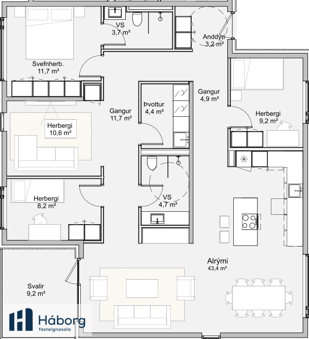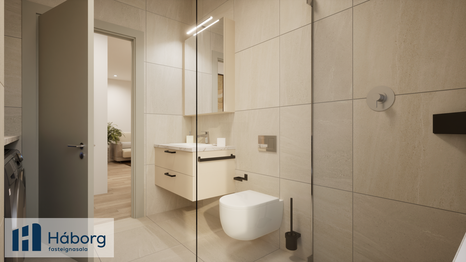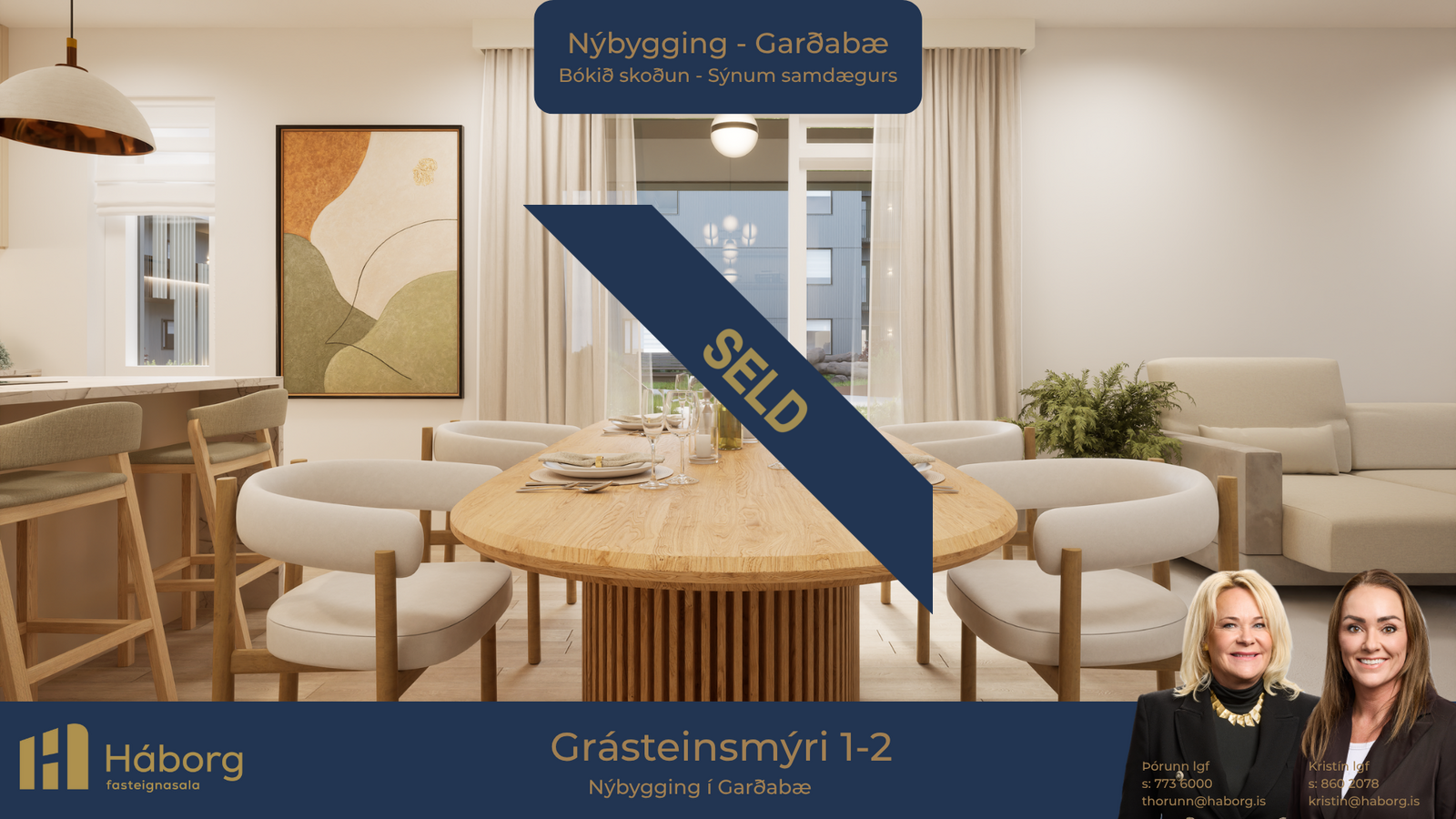Háborg fasteignasala kynnir Grásteinsmýri 1, Garðabæ. Nýbyggingin er staðsteypt, einangruð að utan og klædd með ál- og bambus klæðningu. Góðar 2ja, 3ja 4ra og 5 herbergja íbúðir í litlu fjölbýli með lyftu. Útsýni er úr flestum íbúðum og timbur-verönd fylgir íbúðum á 1. hæð. Íbúðirnar afhendast án megin gólfefna en baðherbergi eru flísalögð að hluta. Næg bílastæði á lóð. Áætluð afhending íbúða er í mars-apríl 2026.Sölusíða GrásteinsmýriNýr valkostur í fjármögnun. Kaupendur geta nýtt sér nýjan sjóð Öxar 20 sem styður þá með því að fjárfesta með þeim allt að 20% af kaupverði. Kynntu þér málið hér Öxar.isNánari lýsing á íbúð 301, 5. herbergja: Stærð 144,8 fm. Sérinngangur af svölum. Þegar komið er í forstofu eru góðir fataskápar. Barnaherbergin tvö eru rúmgóð og björt með góðum fataskápum. Hjónasvítan er einnig rúmgott og bjart með góðum fataskápum og baðherbergi innaf. Baðherbergi nr.2 er með og góðri snyrtiaðstöðu. Einnig er sér þvottahús í íbúðinni með góðri vinnuaðstöðu. Alrými er mjög rúmgott og bjart með opið eldhús, hannað í L, með eyju sem hægt er að sitja við. Stofur eru rúmgóðar og bjartar. Úr alrými og stofu er útgengt á útsýnis svalir 9,2 fm að stærð. Einnig er sjónvarpshol í íbúðinni. Eigninni fylgir stæði í bílakjallara merkt B30 og geymsla að stærð 8,3 fm.Nýjar, bjartar og vandaðar íbúðir með góðri lofthæð, þar sem náttúra, ró og nútímaleg hönnun mætast.Innréttingar í íbúðum: AXIS innréttingar í litnum CashmereGrey. AEG innbyggð heimilistæki, ísskápur, uppþvottavél, helluborð og bakarofn. Baðherbergi eru flísalögð að hluta með 60×60 Patch Beige flísum (Ragno). Grohe blöndunartæki eða sambærileg. Egill Árnason hurðir, lamir og hurðabúnaður.