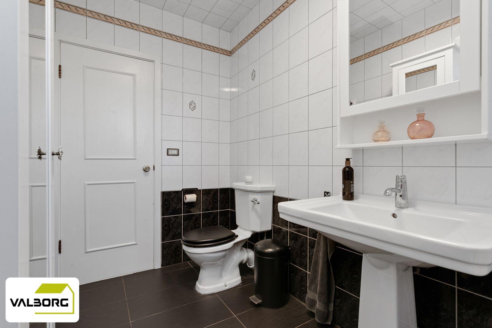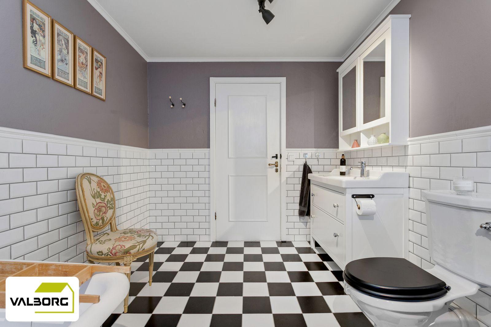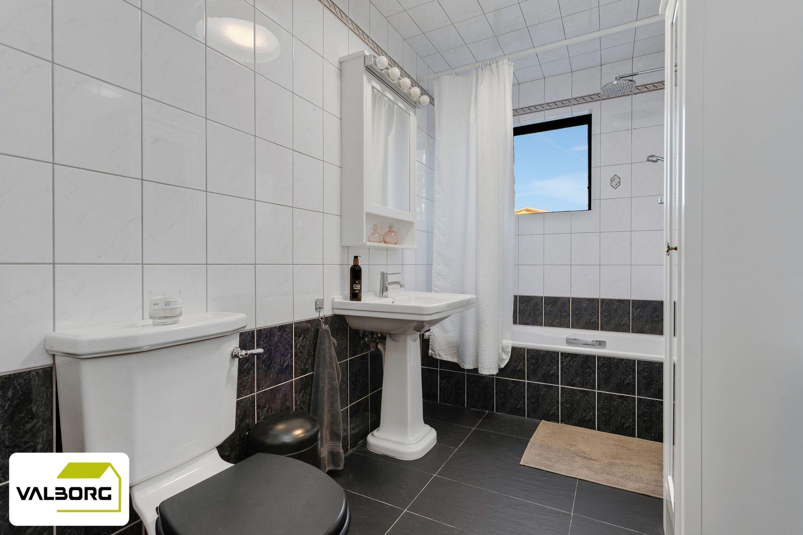 Baðherbergi er með flísalagt gólf og flísar upp á vegg, frítt standandi baðkar, aðstaða fyrir þvottavél og þurrkara. Inn af baðherbergi er hitakompa.