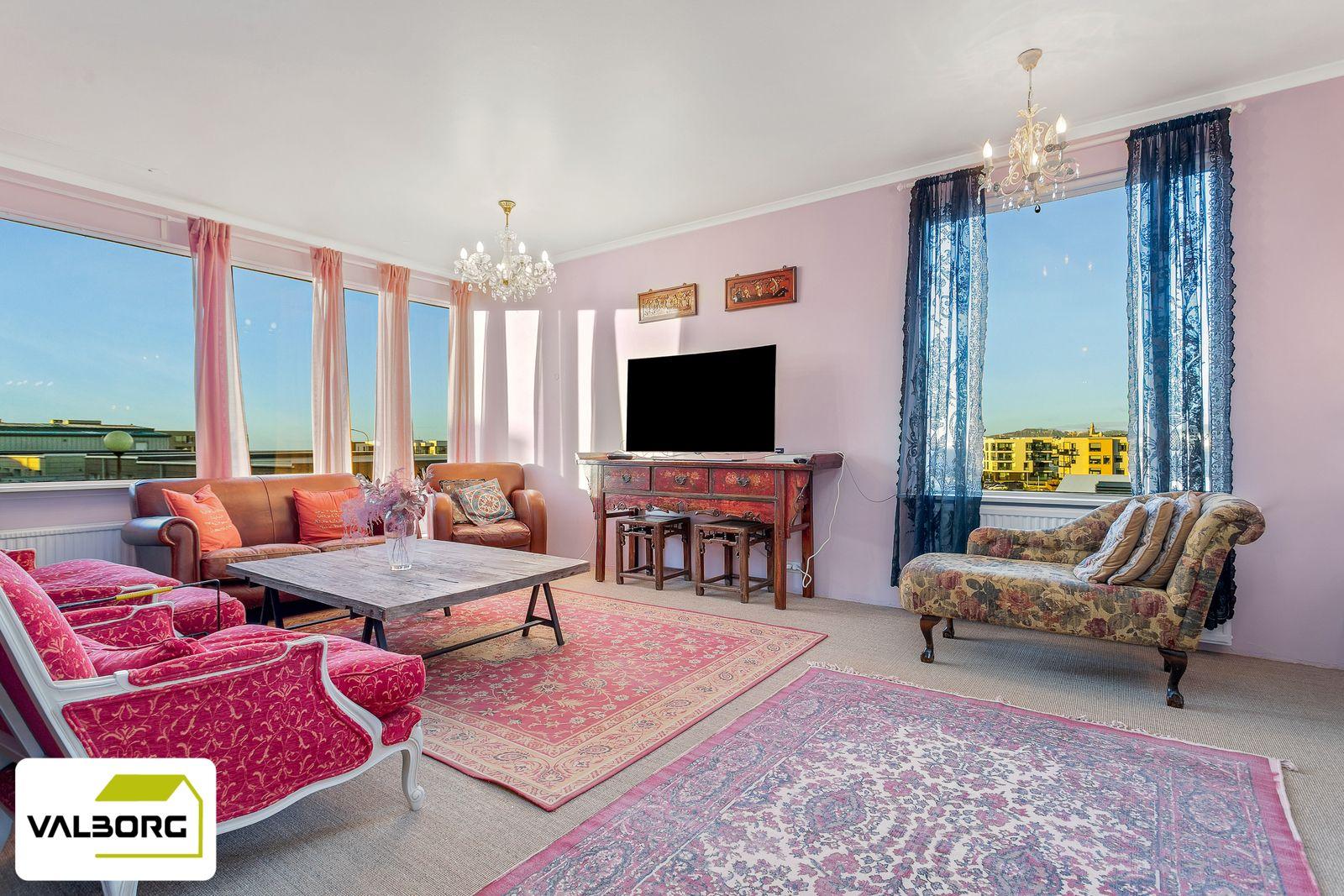 Stofa stór og björt með útsýni á tvo vegu. Parket á gólfi.
