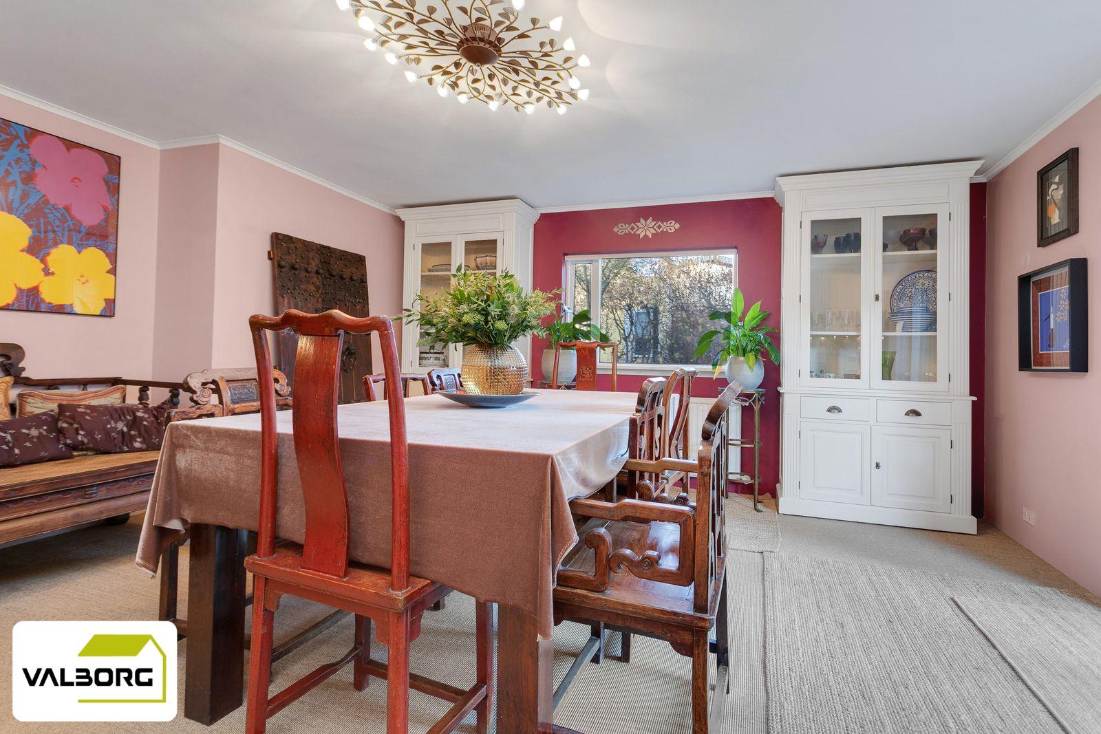Borðstofa, útgengt á pall og þaðan út í garð. Á gólfi er sisal teppi.