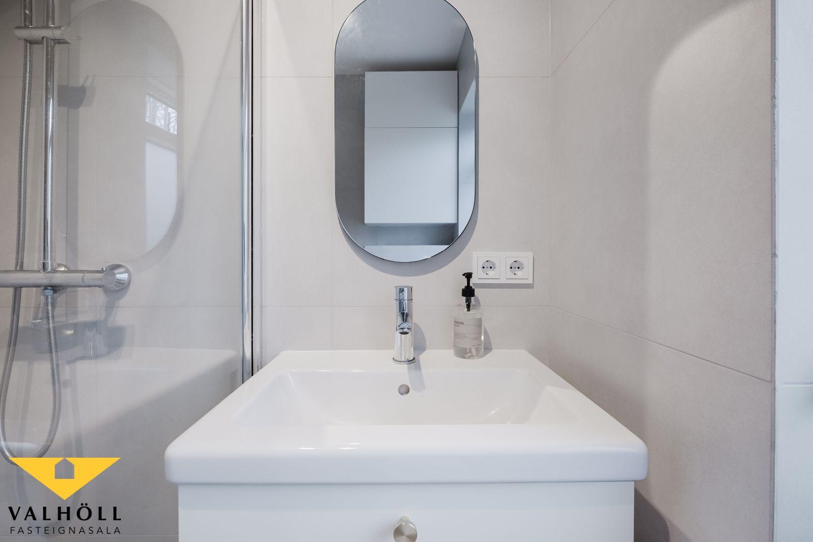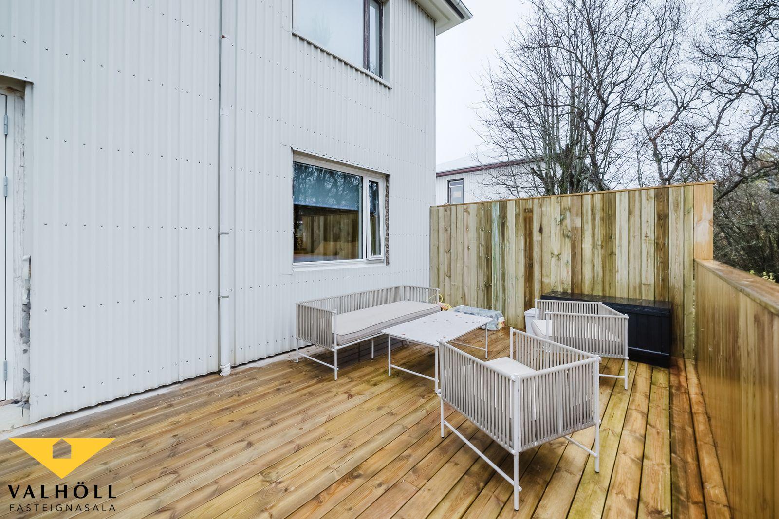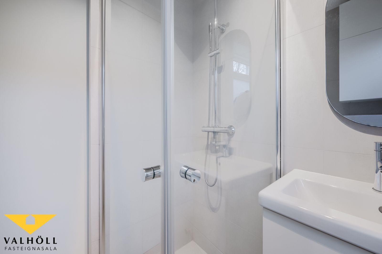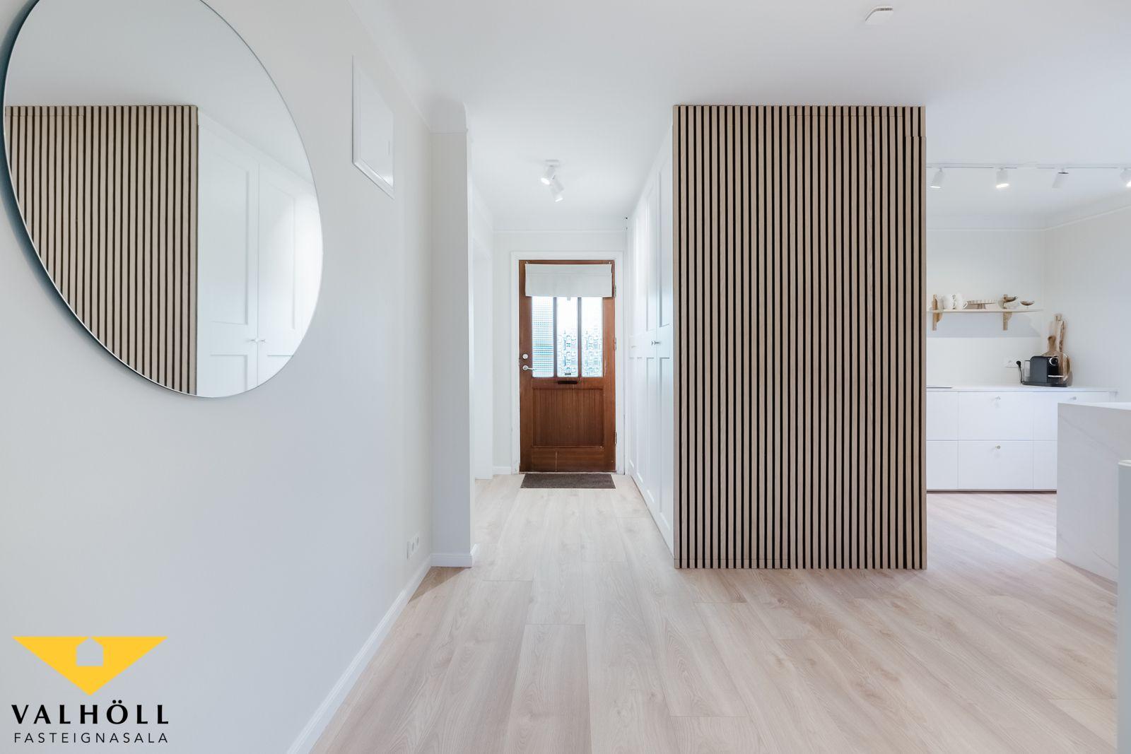 Gengið er inn um sérinngang og komið inn í parketlagt anddyri með góðum skápum. Hol með harðparketi á gólfi, þaðan er opið inn í stofu sem er nokkuð rúmgóð með harðparketi á gólfi, úr stofu er útgengi út á nýjan viðarpall með skjólgirðingum.  Eldhús með harðparketi á gólfi og nýrri innrétingu og tækjum, innbyggður ískápur og uppþvottarvél fylgja. Baðherbergi er allt endurnýjað með vaski, salerni, og sturtuklefa, flísar á veggjum og gólfi, og innfeldur handklæðaofn. Herbergi með harðparketi, og góðum fataskápum.  Úr anddyri er gengið inn í þvottarhús sem er deilt með íbúðinni fyrir ofan. Þar eru stæði fyrir þvottarvél og þurrkara, snúrur og lítil geymsla undir stigarými í þvottarhúsi.