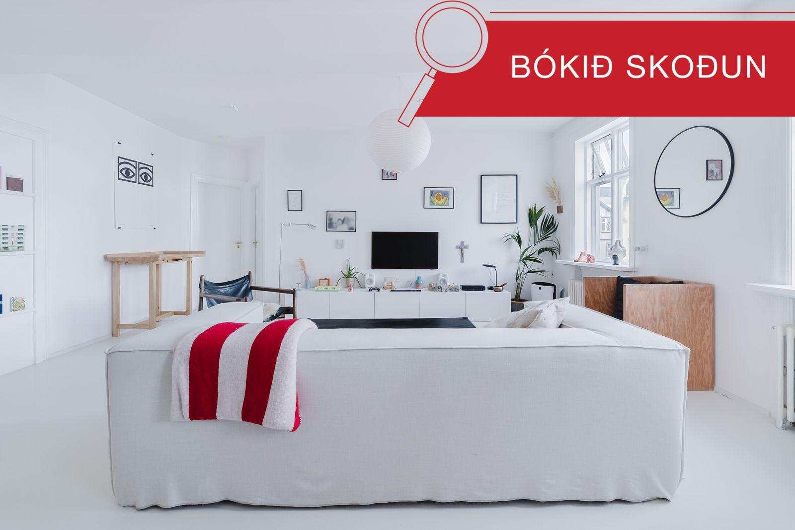 Þaðan er gengið inn í alrými íbúðar þar sem er eldhús með snyrtilegri innréttingu sem hefur verið lökkuð hvít.