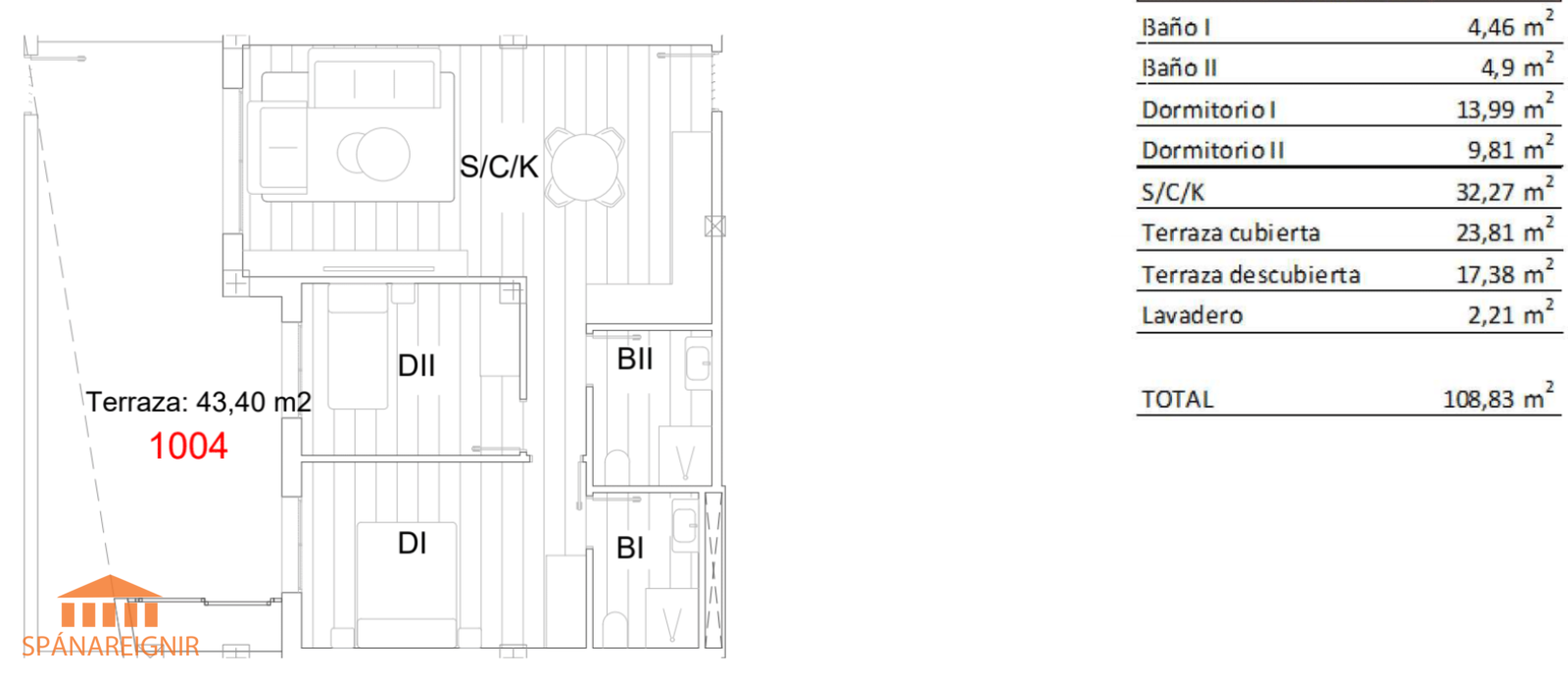 3 svefnh. + 2 baðh. verð frá 274.900 evrur (39.300.000 ISK) 10% skattur og ca. 3% kostn. við kaupin.Íbúðin er 96 fm + 27fm. svalir, samtals 123fm. sérafnotafm.