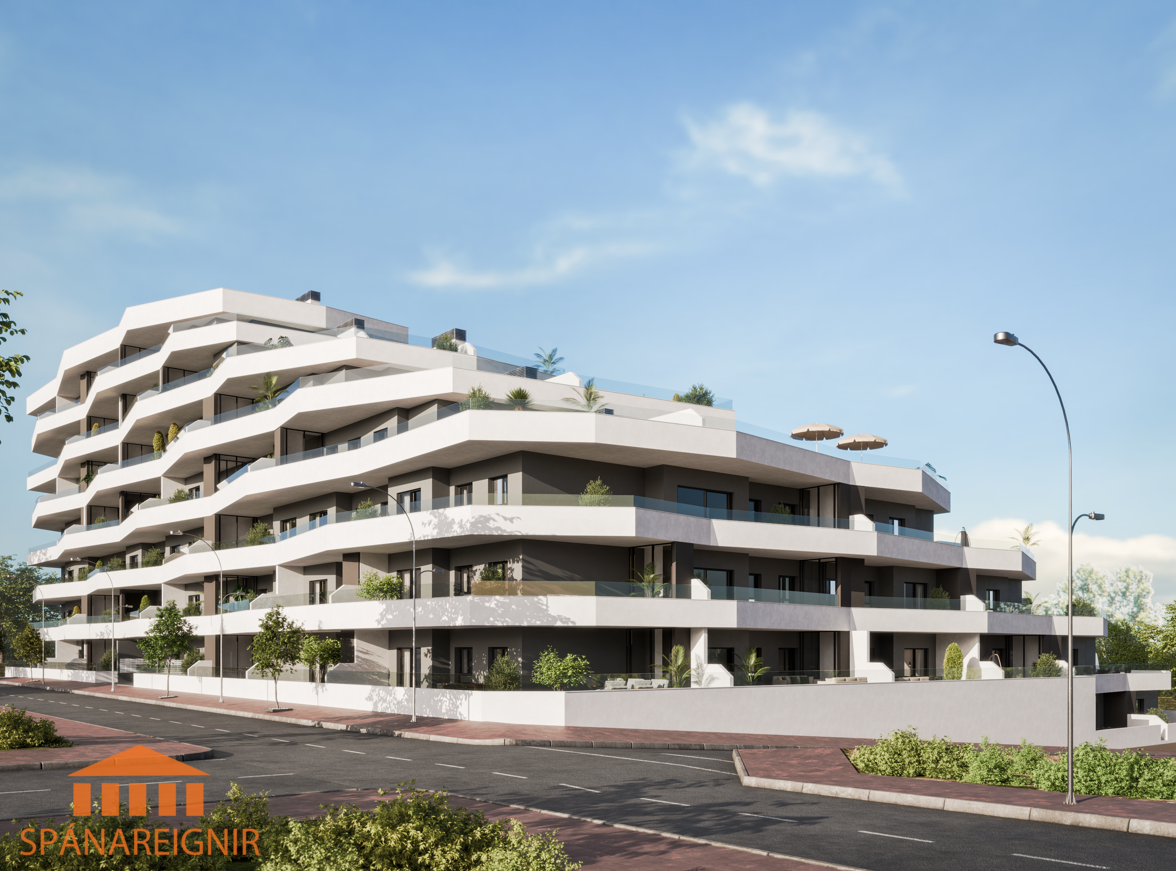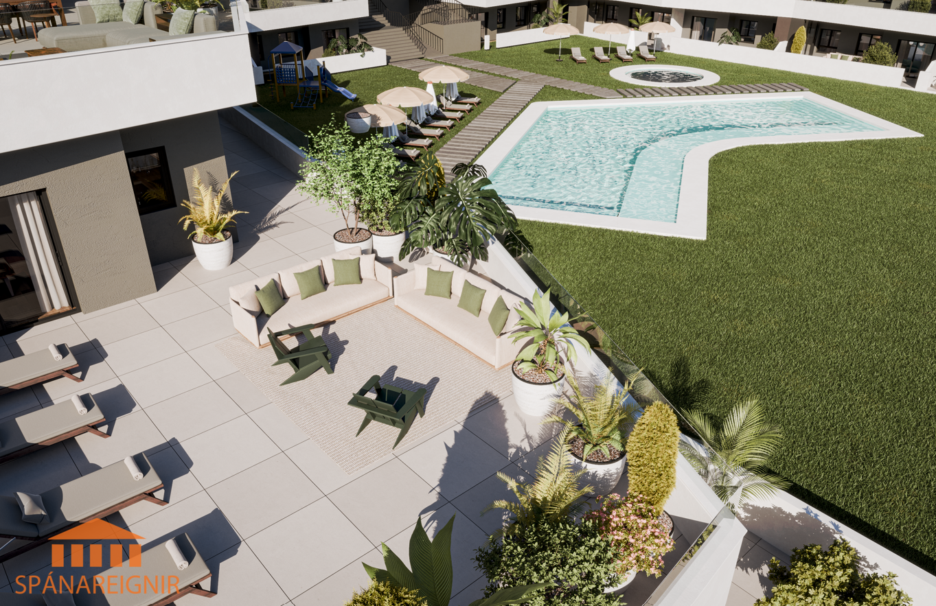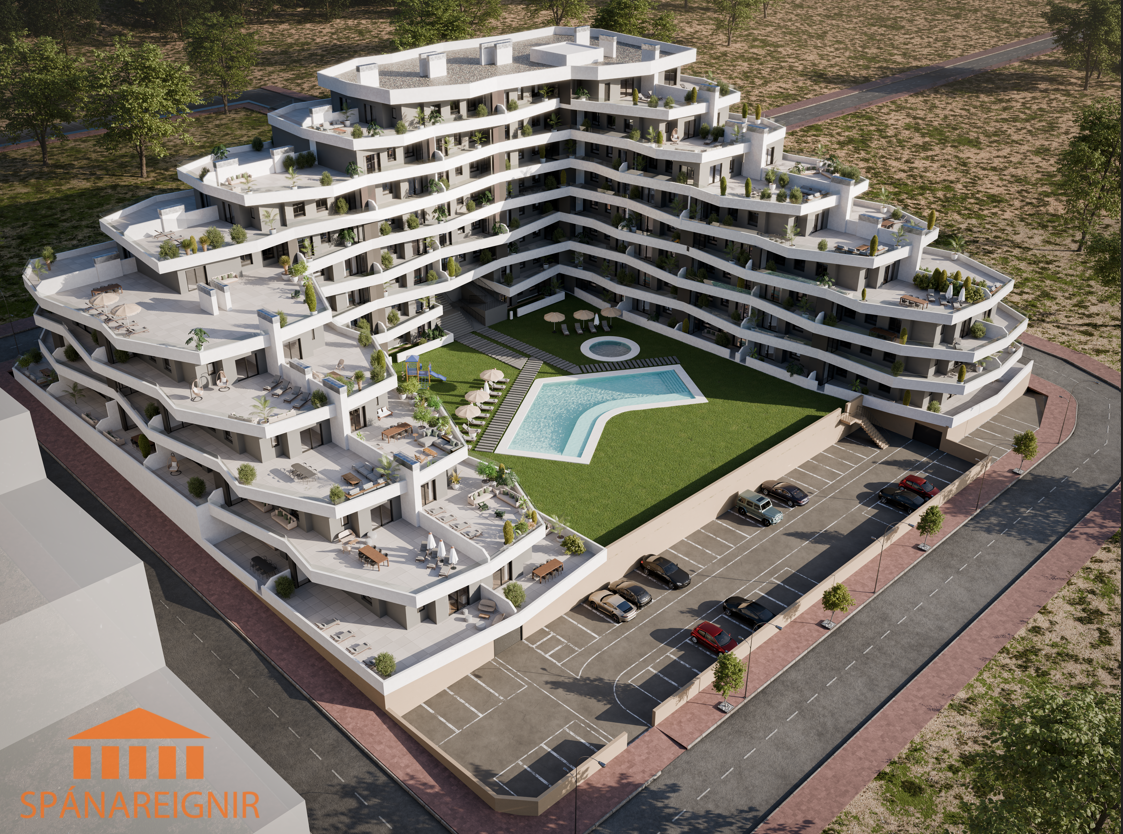 Berta Hawkins, löggiltur fasteignasali, berta@spanareignir.is, 0034 615 112 869,Fallegar og vel hannaðar nýjar íbúðir á frábæru verði á góðum stað í San Miguel de Salinas, rótgrónum spænskum smábæ rétt hjá fjölmörgum góðum golfvöllum og í örstuttu göngufæri frá verslunum, veitingastöðum, skóla, götumarkaði ofl. sem gerir lífið á Spáni skemmtilegt. Um 40-50 mín akstur suður af Alicante. Tvö eða þrjú svefnherbergi og tvö baðherbergi, góð stofa, borðstofa og eldhús í opnu rými. Verönd og sér garður eða góðar svalir og auk þess aðgengi að glæsilegum sameiginlegum sundlaugargarði.