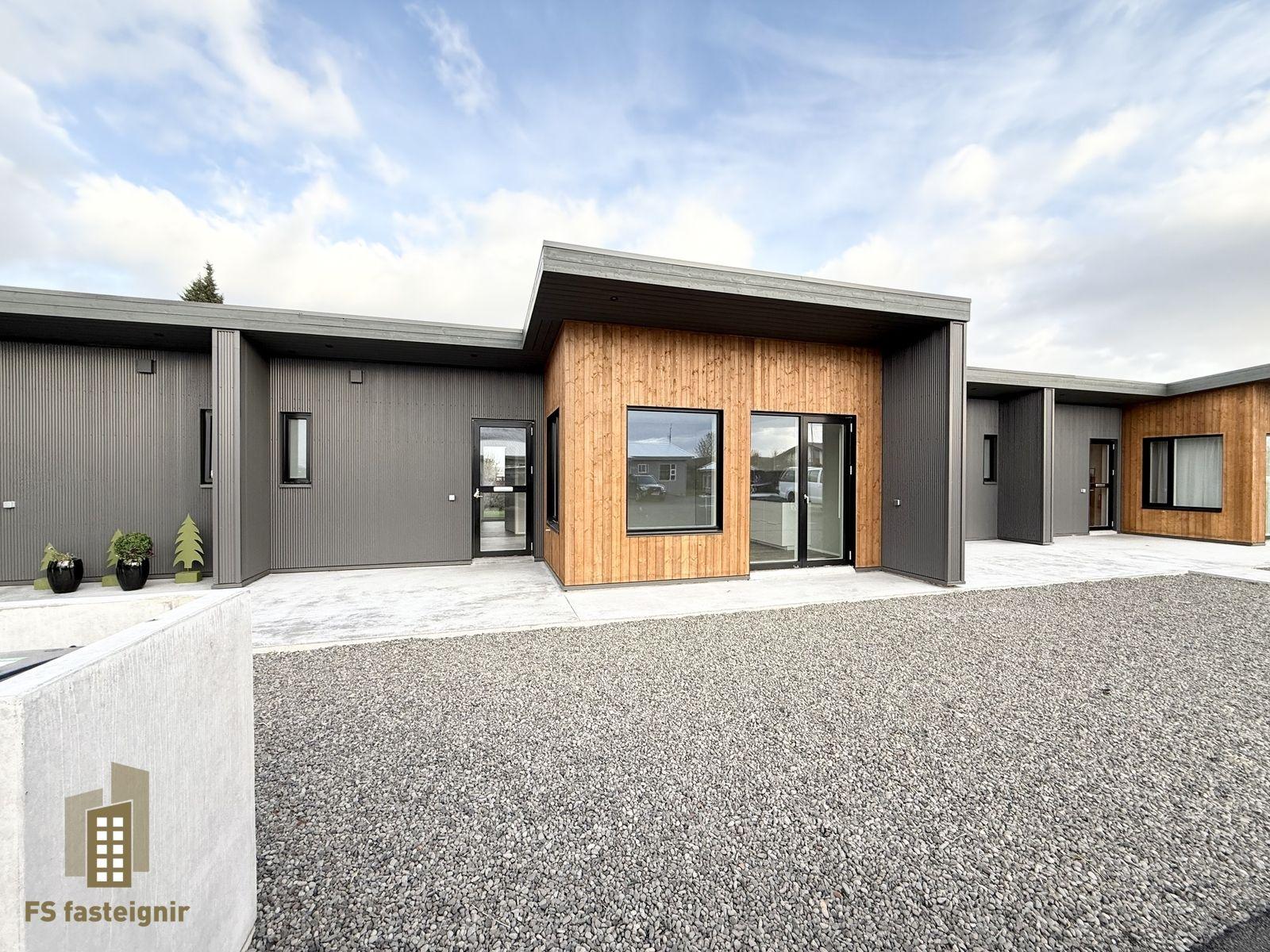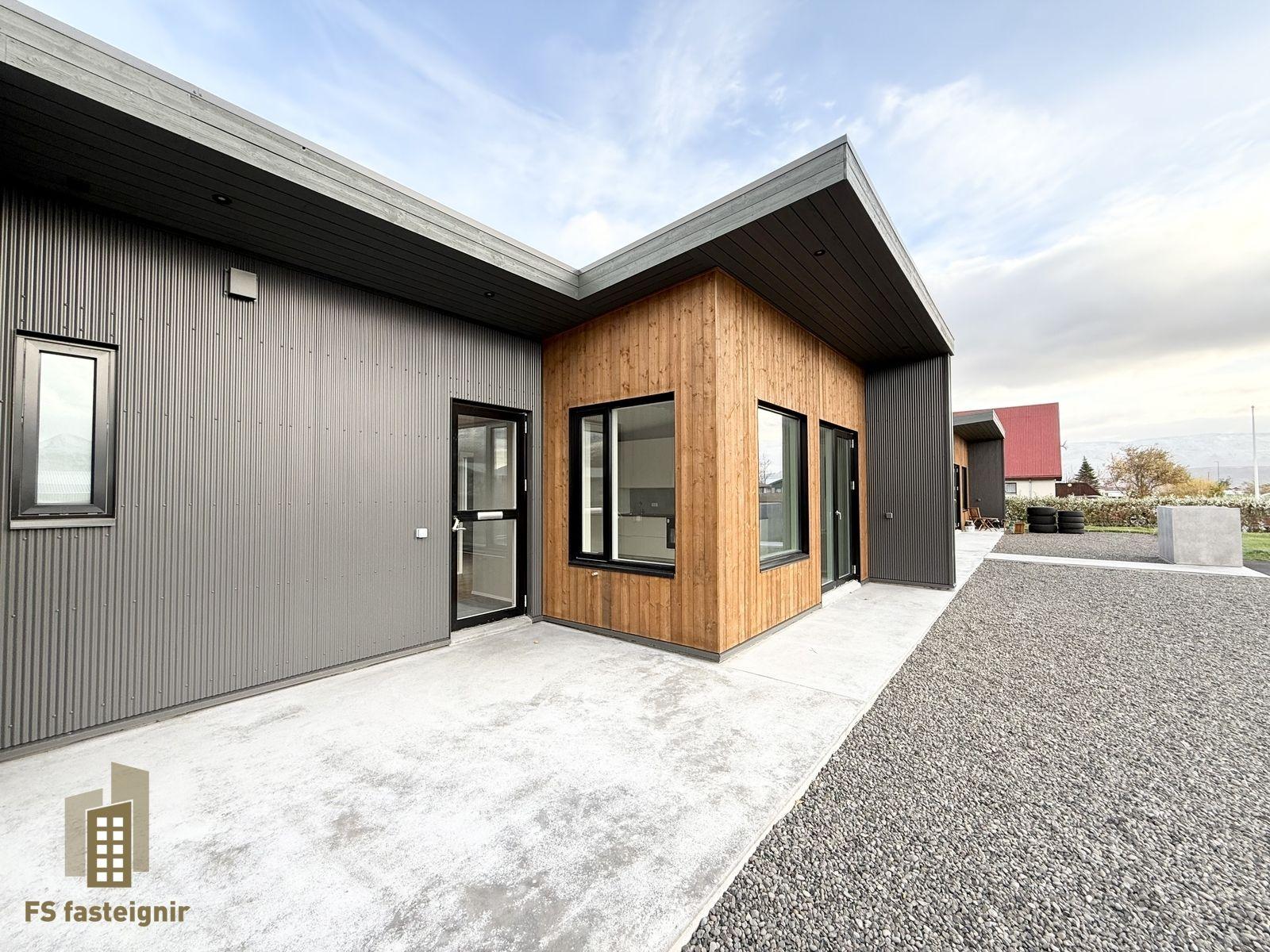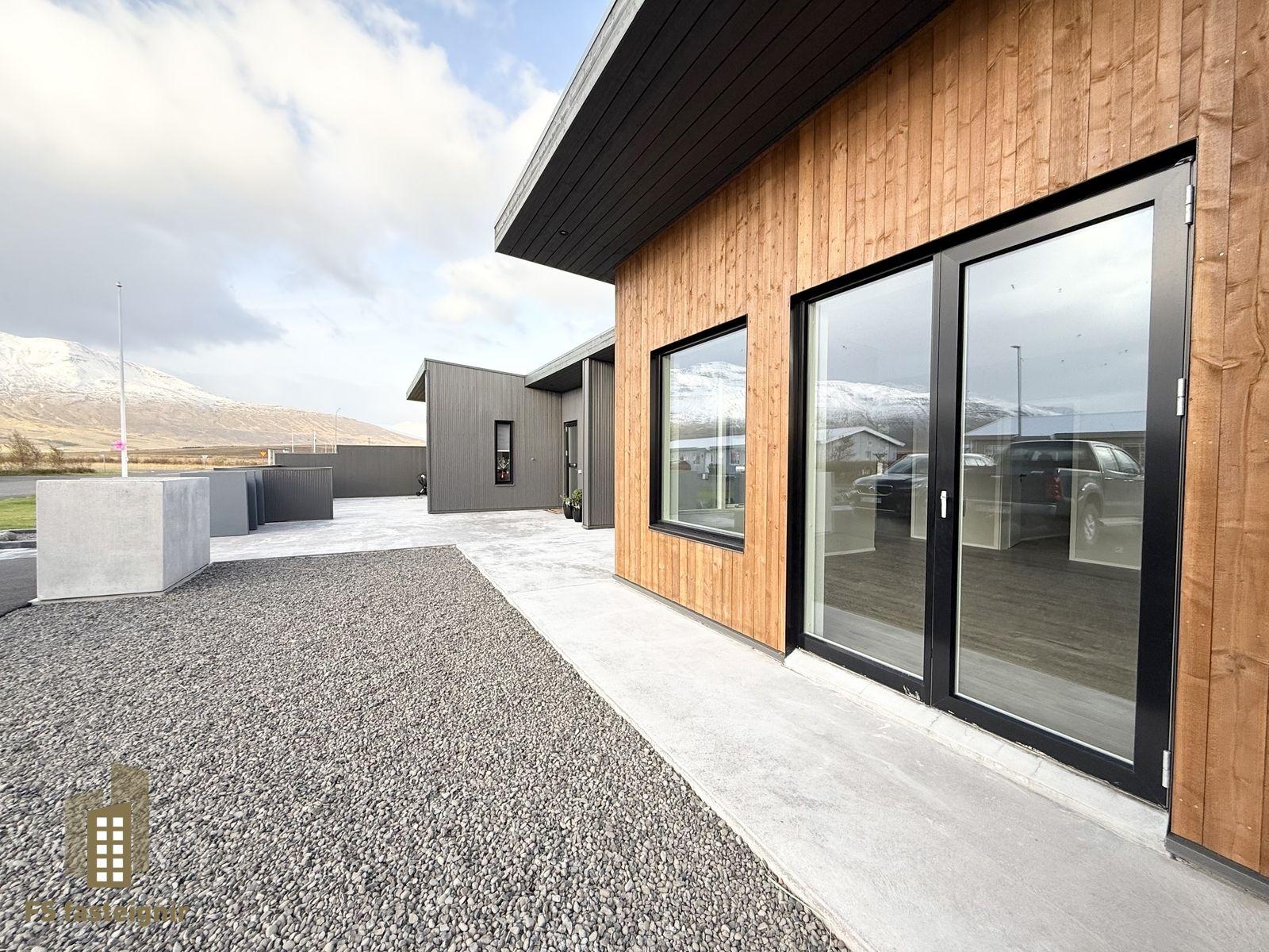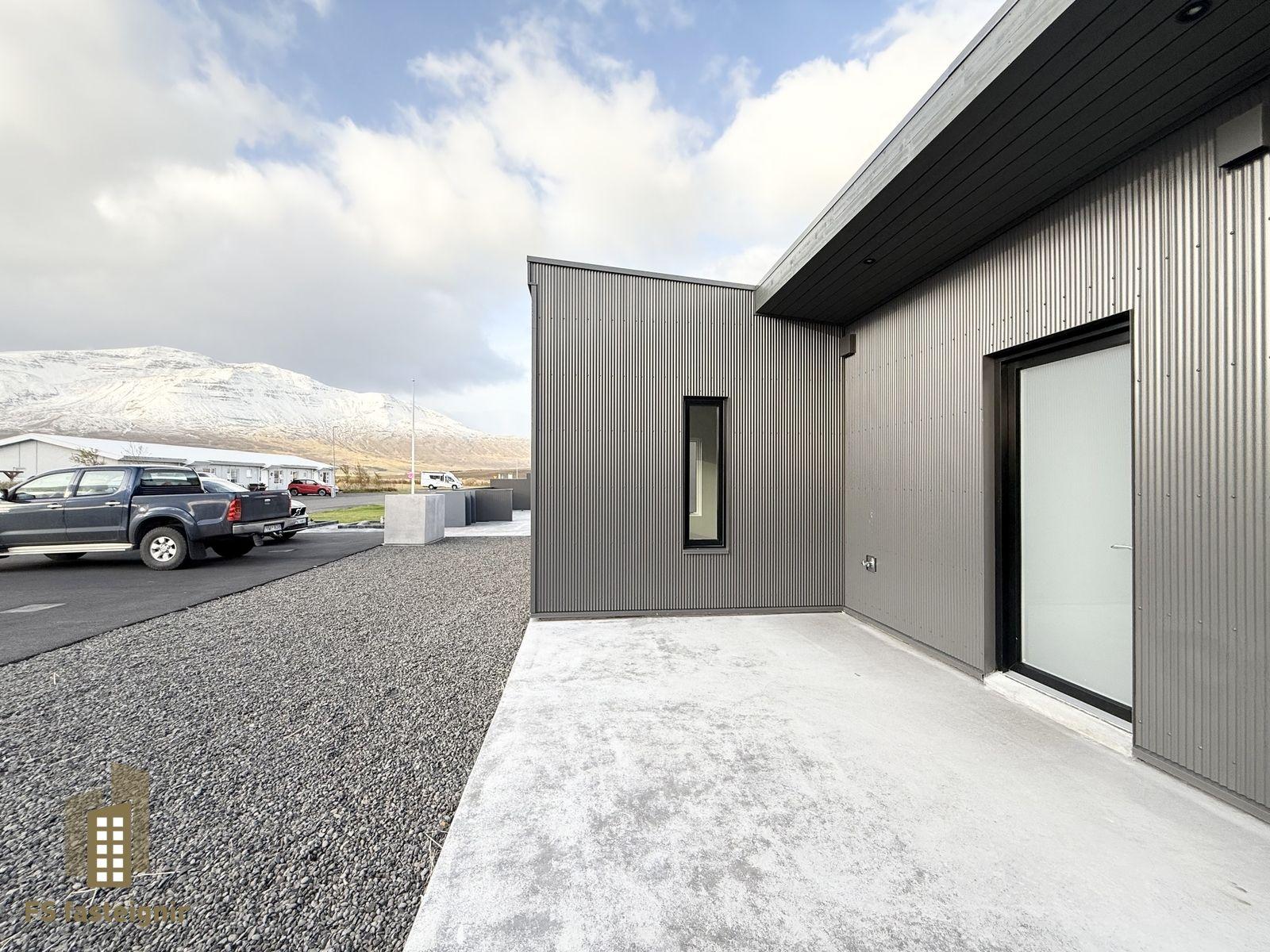Skilalýsing eignar, Húsið er þriggja íbúða raðhús á einni hæð ásamt sameign. Í sameign eru sérgeymsla fyrir hverja íbúð, ásamt vagna og hjólageymslu. Húsið er timbureiningahús, einangrað með 145 mm steinull í útveggjum. Undirstöður eru steyptar í plast einangrunarkubba. Undir gólfplötu er einangrað með 4” plasteinangrun. Gólfplata er steypt, pússuð með flotbretti og rétt af með flotmúr. Þak er einhalla til norðurs, burðarvirki úr timbri, einangrað með 250mm steinull (reglugerð 220mm). Þak er með 2 lögum af asfalt dúk. Innveggir eru klæddir einu lagi af viðarplötum (festa fyrir skrúfur) og gips þar yfir. Allir veggir og loft verða sandspörsluð þar sem við á og fullmáluð í ljósum lit samkvæmt vali hönnuðar. Loft upptekin loft í alrými með innfeldum ljósum og hljóðdempunardúk. Önnur loft niðurtekin. Gólfefni gólf í forstofu og baðherbergi verða flísalögð. Önnur gólf íbúðar verð með vönduðu vínyl parketi. Innihurðir verða yfirfelldar með stálhandföngum. Í eldhúsi verða hvítar sprautulakkaðar og/eða plastlagðar. Á milli bekkja og efri skápa í eldhúsi verða flísar eða fiber plötur með t.d. steypuáferð. Bekkjarplötur verða harðplast plötur. Spanhelluborð og viftar. Bakaraofn með blæstri. Innbyggð uppþvottavél og innbyggður ísskápur og frystir fylgja með við sölu eignar. Ábyrgð raftækja er 5 ár. Fataskápar framhliðar fataskápar verða hvítar. Allar skúffur og skápahurðir verða með ljúflokum af viðurkenndri gerð. Baðherbergi verður með sturtu, vegghengdu salerni og handklæðaofni. Stórt (aflangt) niðurfall í gólfi og glerhlið niður í gólf. Í kringum sturtu koma flísar. Innrétting og skápar verða hvít hálfmatt. Hreinlætis-og blöndunartæki í húsinu verða af viðurkenndri gerð. Varmaskiptir fyrir neysluvatn verður uppsettur og tengdur. Gólfhitakerfi er í öllum gólfum, lagt í hvert rými fyrir sig og stýring fyrir hvert rými. Neysluvatnslagnir (rör í rör) verða lagðar í gólf að tengistað með tilheyrandi búnaði. Fráveitu- og drenlagnir lagðar samkvæmt teikningu og tengdar við fráveitukerfi. Ídráttarrör verða fyrir mögulegan heitan pott. Rafmagn röralagnir ásamt tilheyrandi dósum fyrir rafmagn og síma/internet lagt í veggi og loft samkvæmt teikningu. Raf og síma-/netlagnir verða fullfrágengnar. Rafmagnstafla verður fullfrágengin. Rör verður lagt frá aðaltöflu að bílastæði fyrir rafhleðslu á bifreiðum. Öll ljós íbúðarverða fullfrágengin ásamt lýsingu undir efri skápum í eldhússinnréttingu. Upptekin loft í alrými með innfeldum ljósum. Útiljós samkvæmt teikningu verða uppsett og frágengin. Útveggir verða klæddir að utan með litaðri álklæðningu og timburklæðningu að hluta samkvæmt vali hönnuða. Hurðir og gluggar eru úr timbri og klætt lituðu áli að utan. Tvöfalt gler. Lóðin verður jöfnuð og sáð í grasifræi. Stéttar og verandir verða steyptar, en bílaplön malbikuð. Snjóbræðslukerfi verður í stéttum og veröndum. Snjóbræðslukerfi verður lokað kerfi, áfyllt frostlegi og tilbúið með varmaskipti. Reykskynjari og handslökkvitæki verður sett upp í hverri íbúð. Húsið er timbureiningahús, einangrað með 145 mm steinull í útveggjum. Undirstöður eru steyptar í plast einangrunarkubba. Undir gólfplötu er einangrað með 4” plasteinangrun. Gólfplata er steypt, pússuð með flotbretti og rétt af með flotmúr. Þak er einhalla til norðurs, burðarvirki úr timbri, einangrað með 250mm steinull (reglugerð 220mm). Þak er með 2 lögum af asfalt dúk. Innveggir eru klæddir einu lagi af viðarplötum (festa fyrir skrúfur) og gips þar yfir. Allir veggir og loft verða sandspörsluð þar sem við á og fullmáluð í ljósum lit samkvæmt vali hönnuðar. Húsið verður byggt samkvæmt teikningum gerðum af Arkibygg og hönnuð af Ástríði Birnu Árnadóttur arkitekt og Stefaníu Helgu Pálmadóttur byggingafræðingi. Byggingaraðili er EGO hús ehf á Akureyri. Íbúðirnar afhendast fullfrágengnar fyrri hluta árs 2024 og lóð frágengin byggingarstigi 7 (ÍST 51:2001) í júlí 2024.