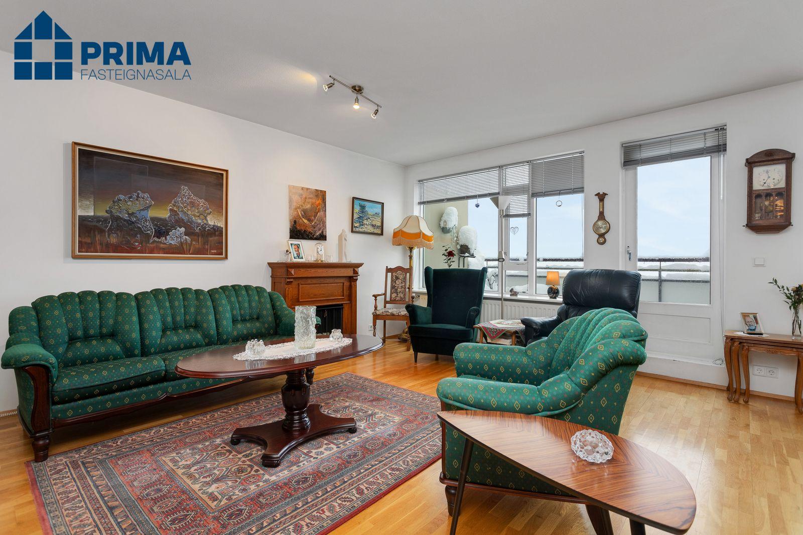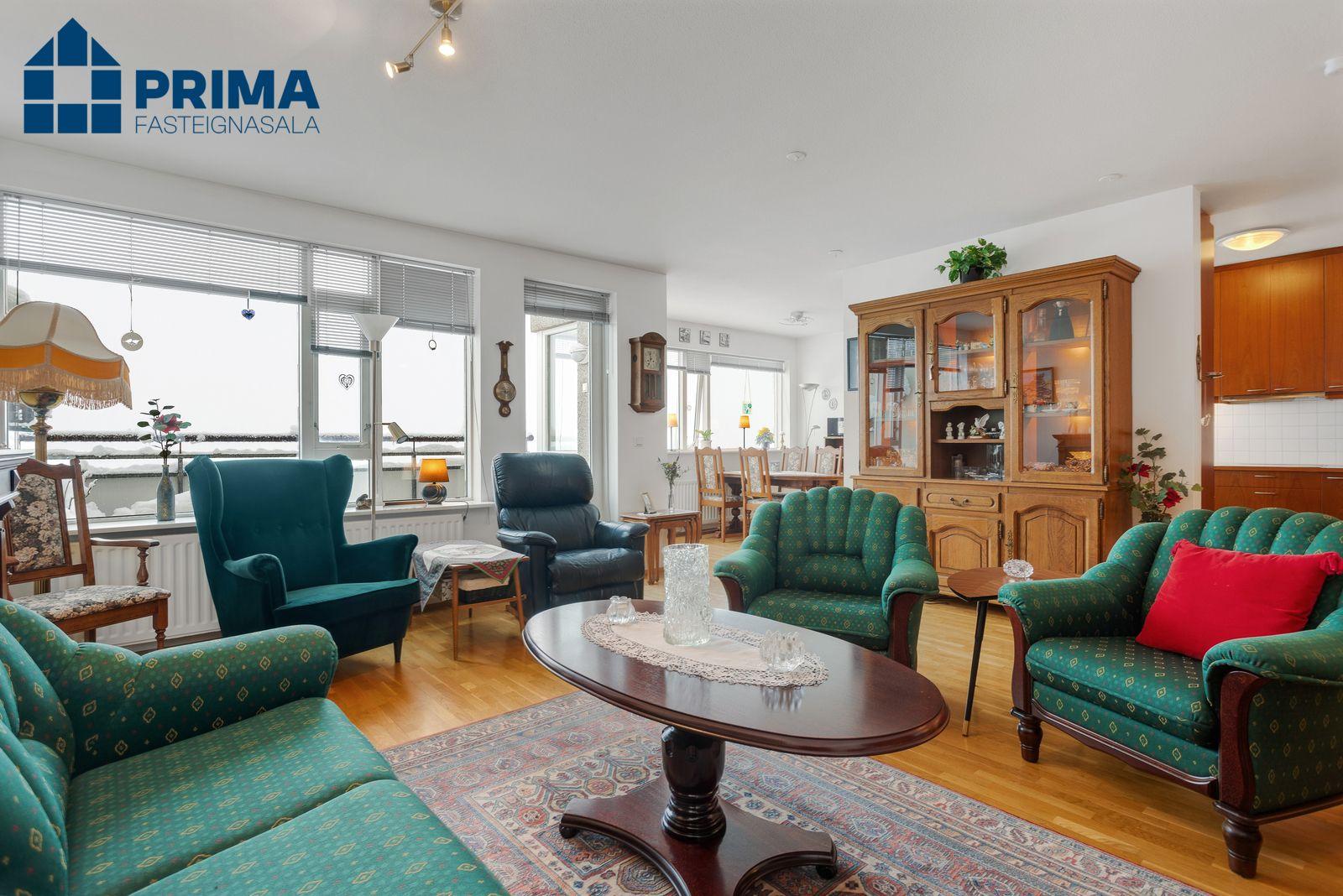 Stofa: Rúmgóð og björt stofa með opið inn í borðstofu/eldhús. Gengið er út á einstaklega rúmgóðar suðvestursvalir með fallegu útsýni úr stofu.