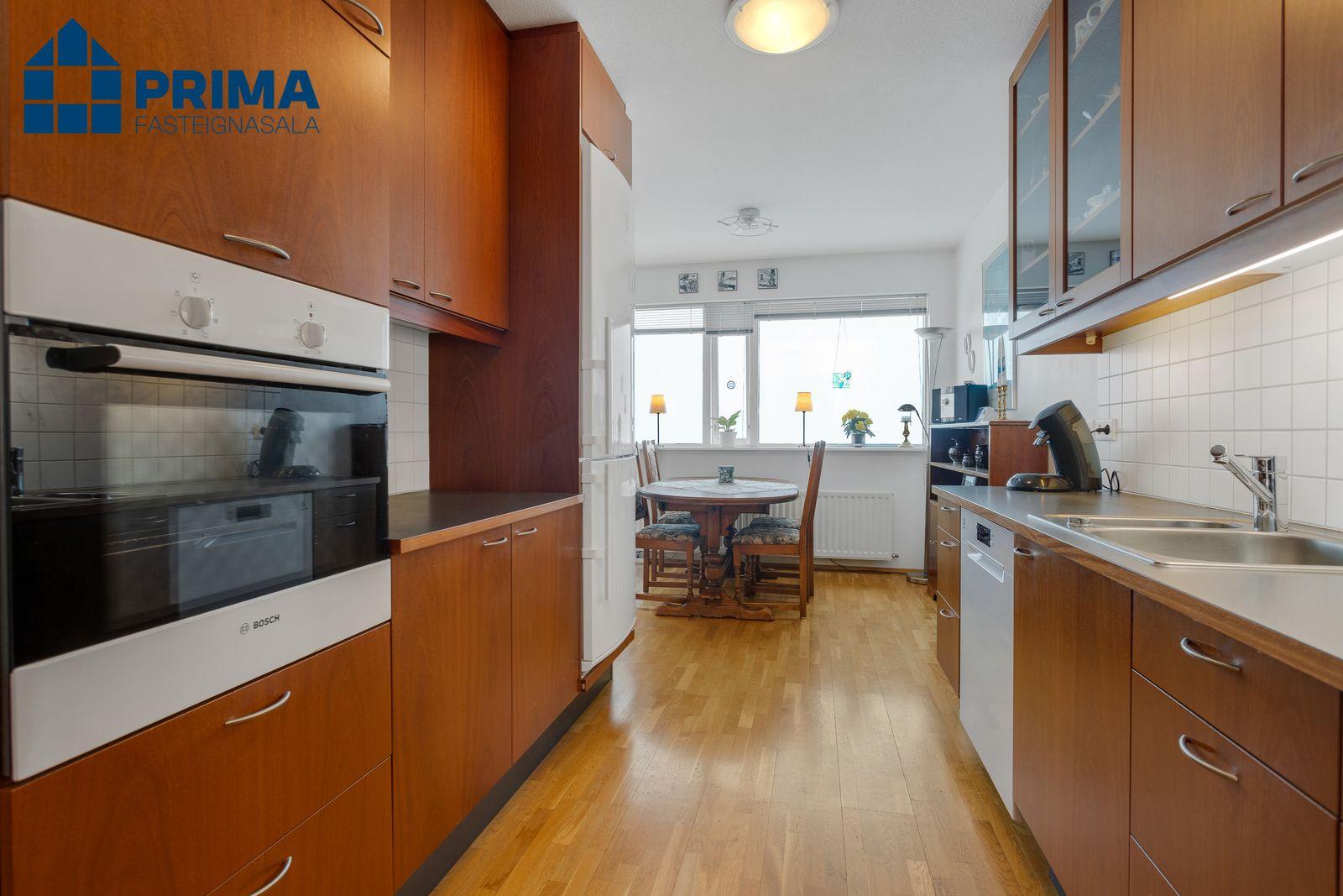 Eldhús/borðstofa: Innrétting með góðu skápa- og vinnuplássi og bakarofni í vinnuhæð. Gott pláss fyrir stórt borðstofuborð við glugga.