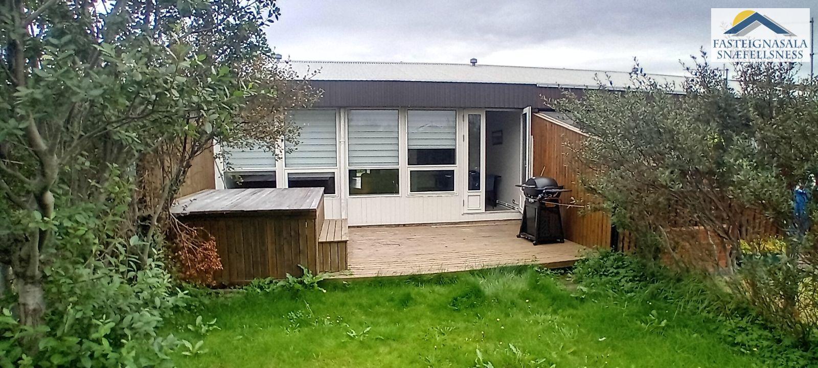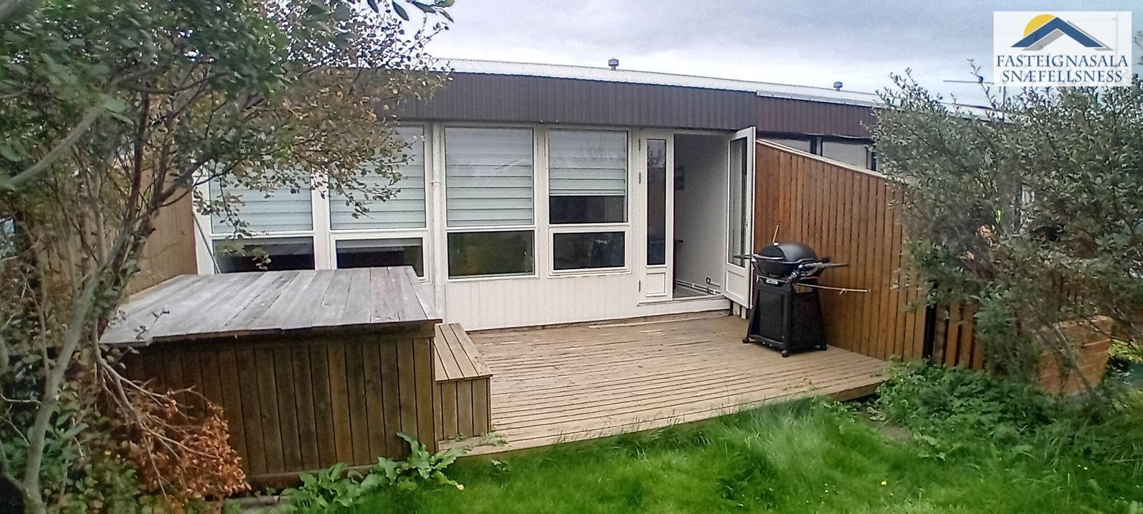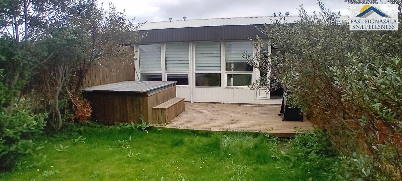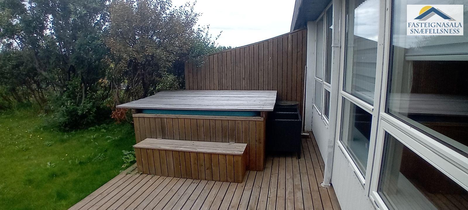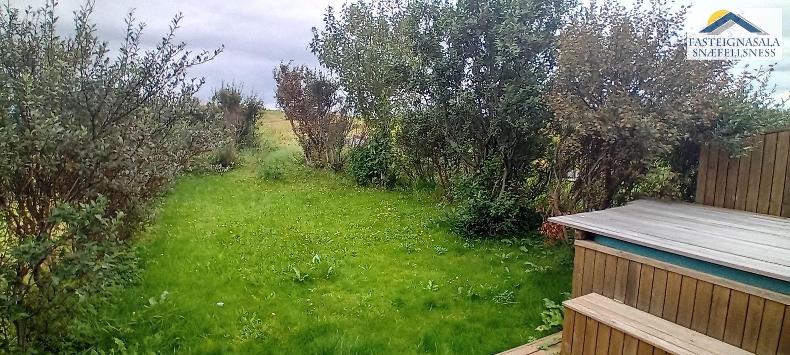 Garður er gróinn og í garði er sólpallur og heitur pottur.