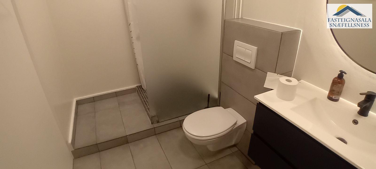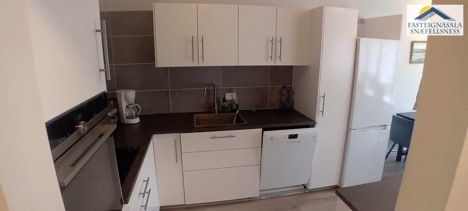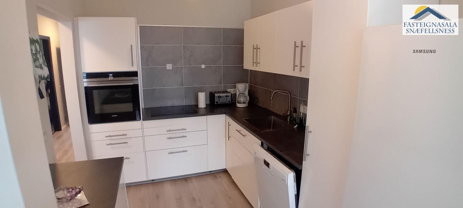 Innrétting í eldhúsi var endurnýjuð fyrir nokkrum árum og ný innrétting og tæki eru á baðherbergi.