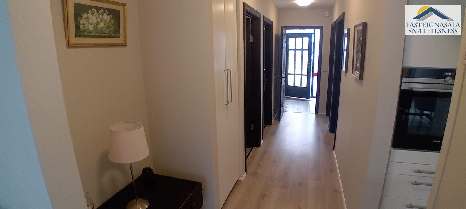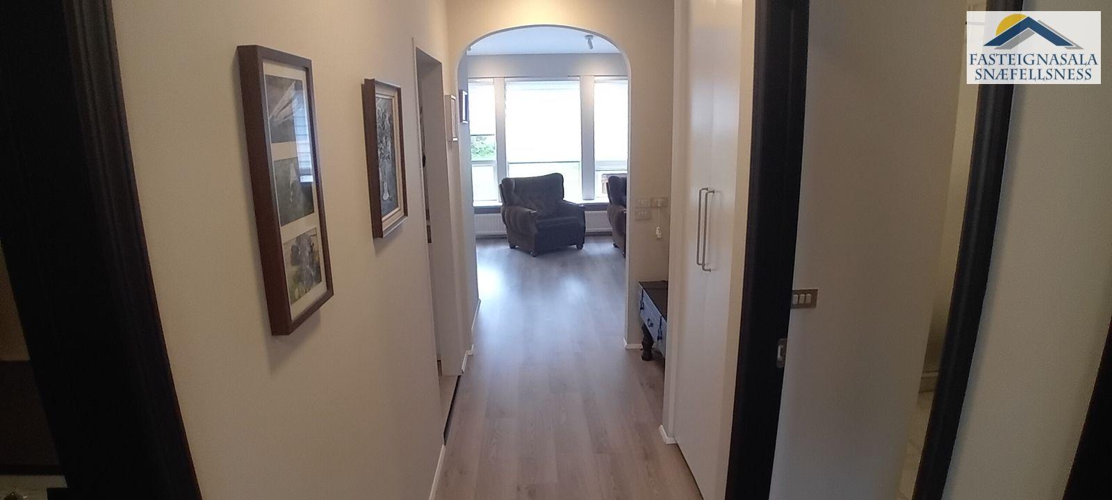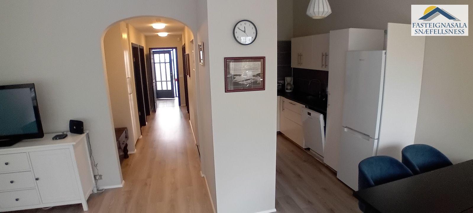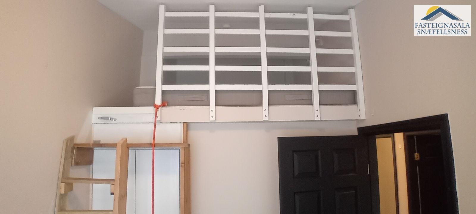 Íbúðin skiptist í forstofu, hol, tvö svefnherbergi, baðherbergi, þvottahús og samliggjandi stofu og eldhús. Þá er svefnloft/geymsla sem farið uppá úr öðru herberginu.