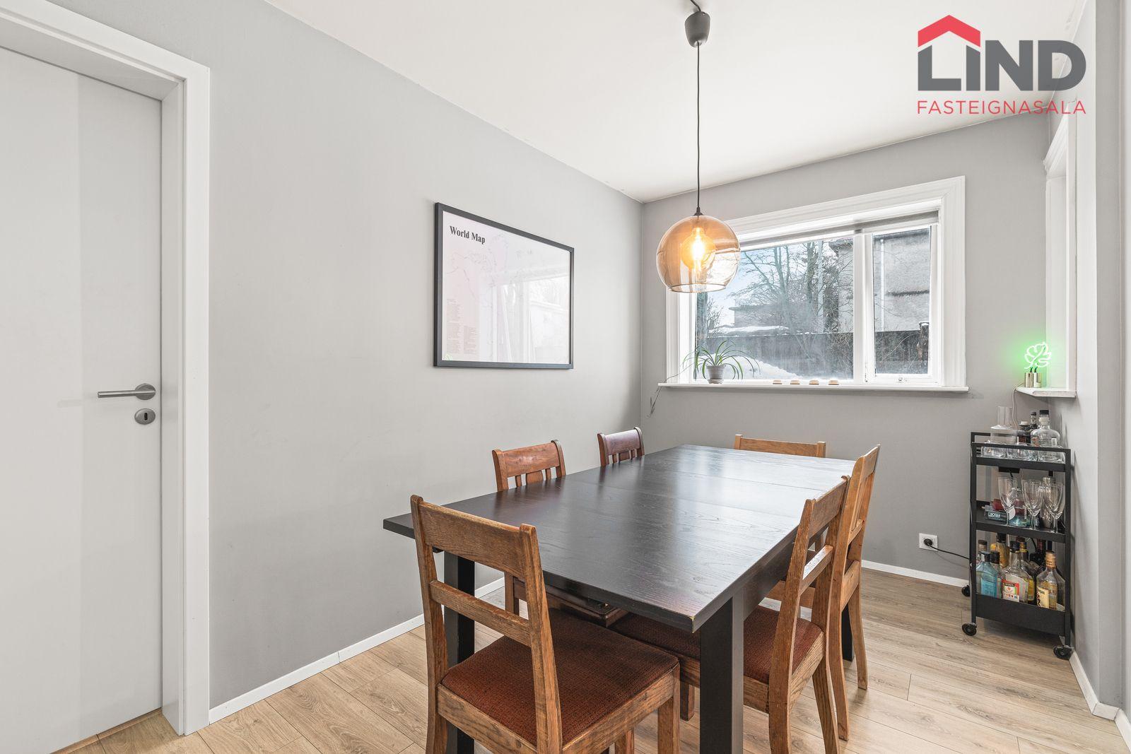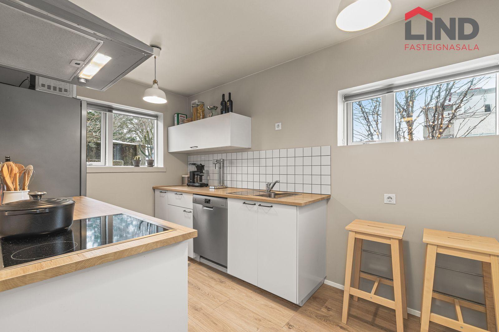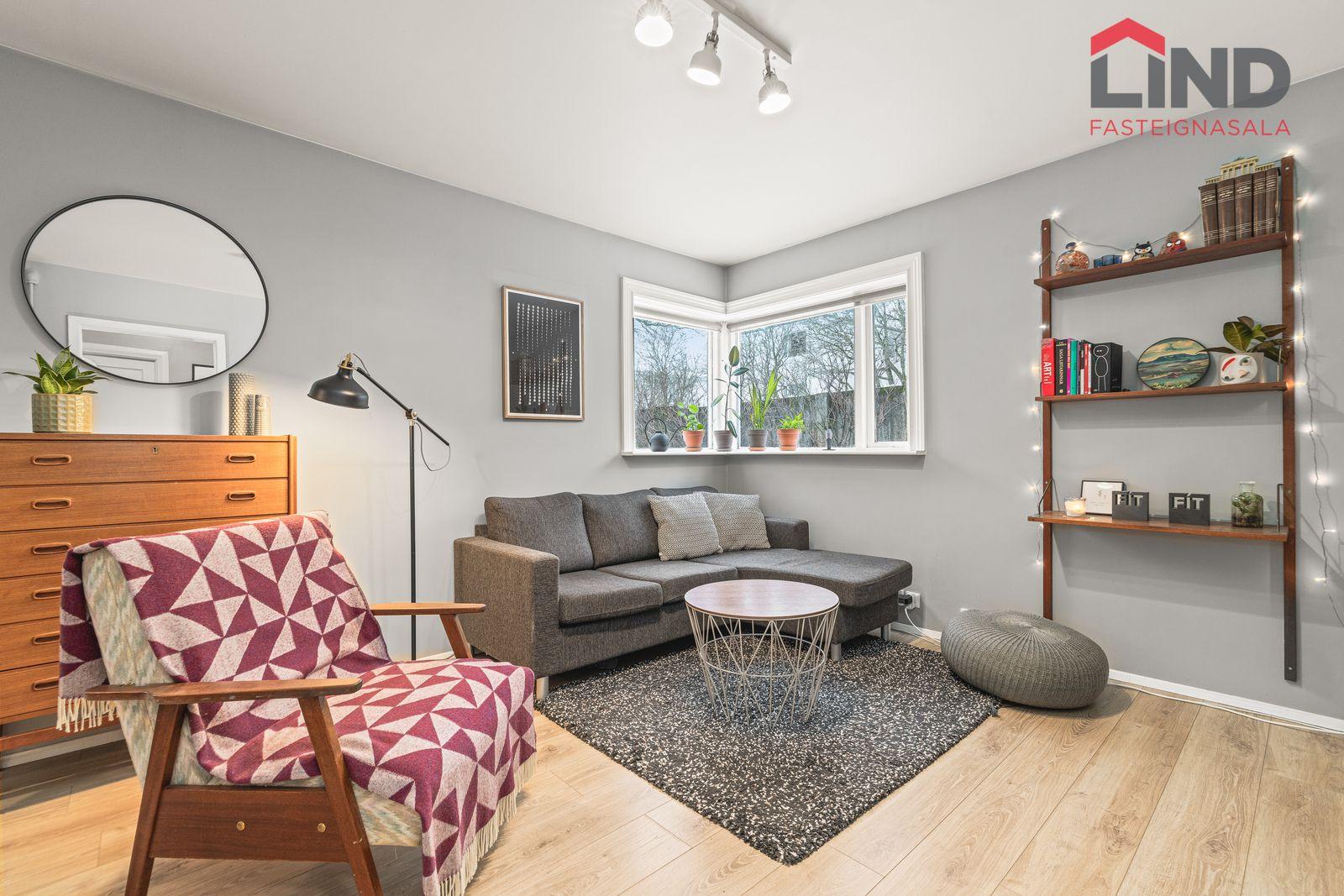 Nánari lýsing Anddyri: Rúmgóður gangur með tveimur fatahengjum. Baðherbergi: Endurnýjað 2023. Baðkar með sturtuaðstöðu. Eldhús: Snyrtileg hvít innrétting með góðu borð,- og skápaplássi. Stofa og borðstofa: Rúmgott með parketi á gólfi. Hjónaherbergi: Rúmgott með parketi á gólfi. Þvottahús: Er í sameign hússins. Geymsla: 2,6 fermetrar, auk sameiginlegrar geymslu.