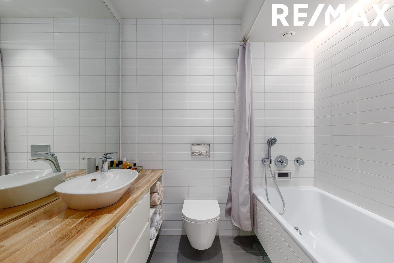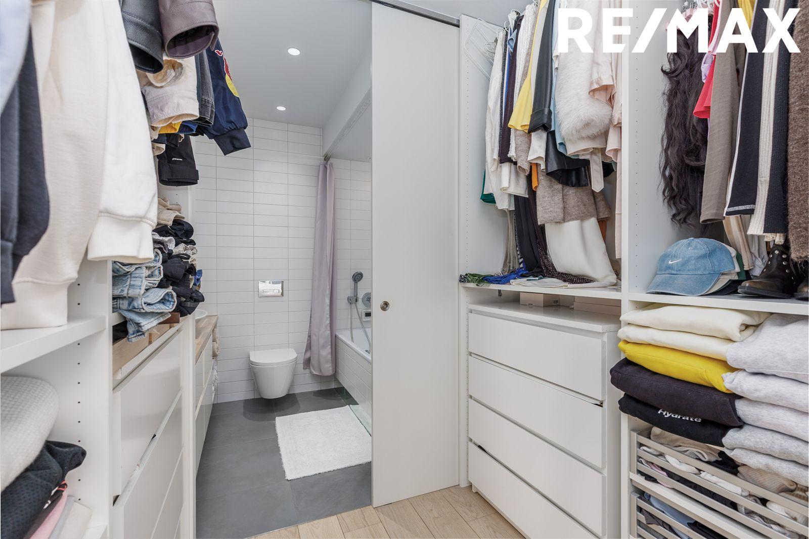 Baðherbergi er innan af fataherbergi með upphengdu salerni, baðkari og flísum á gólfi.