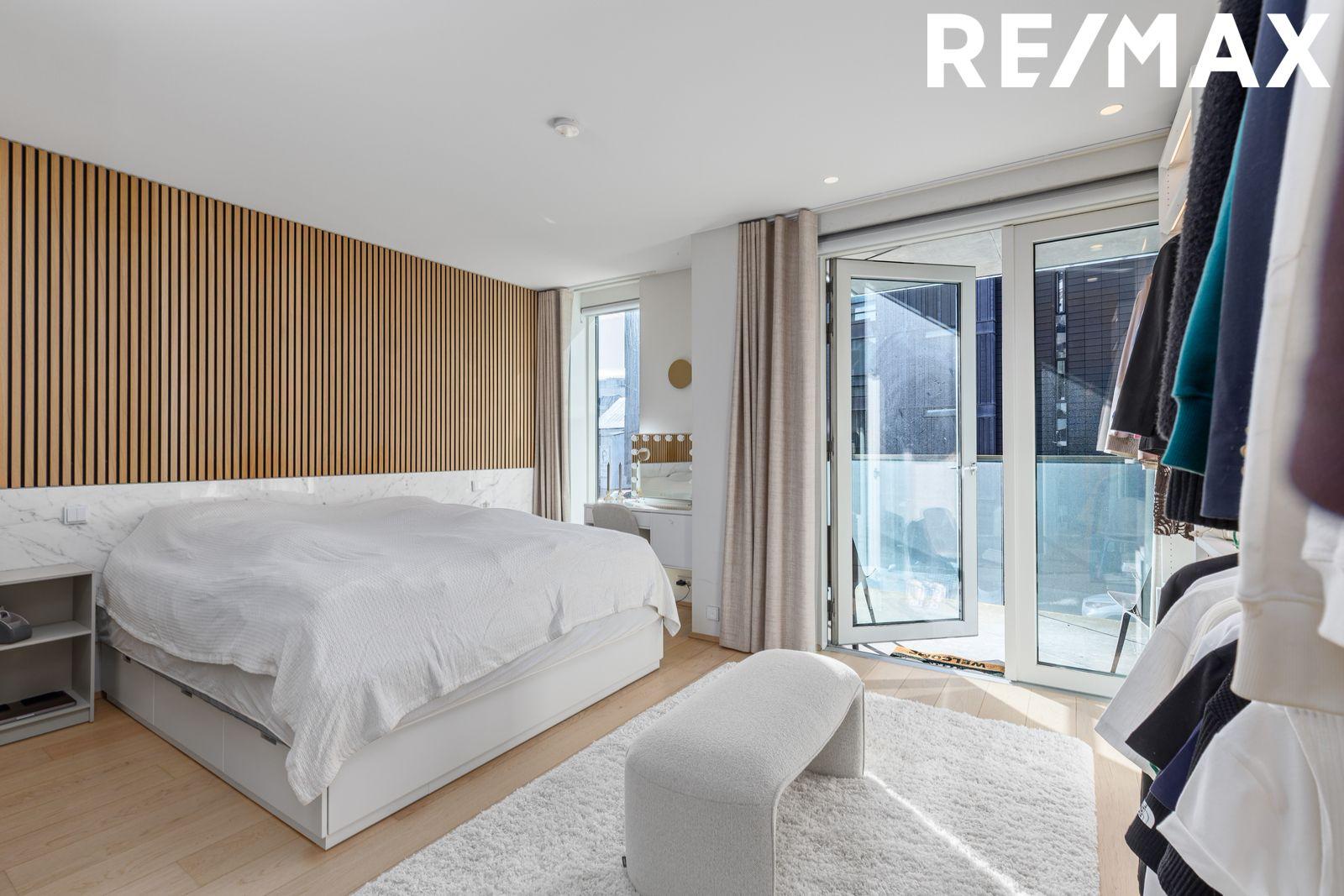 Hjónaherbergi bjart með gólfsíðum gluggum og parketi á gólfi. Útgengt á suðursvalir úr herberginu.