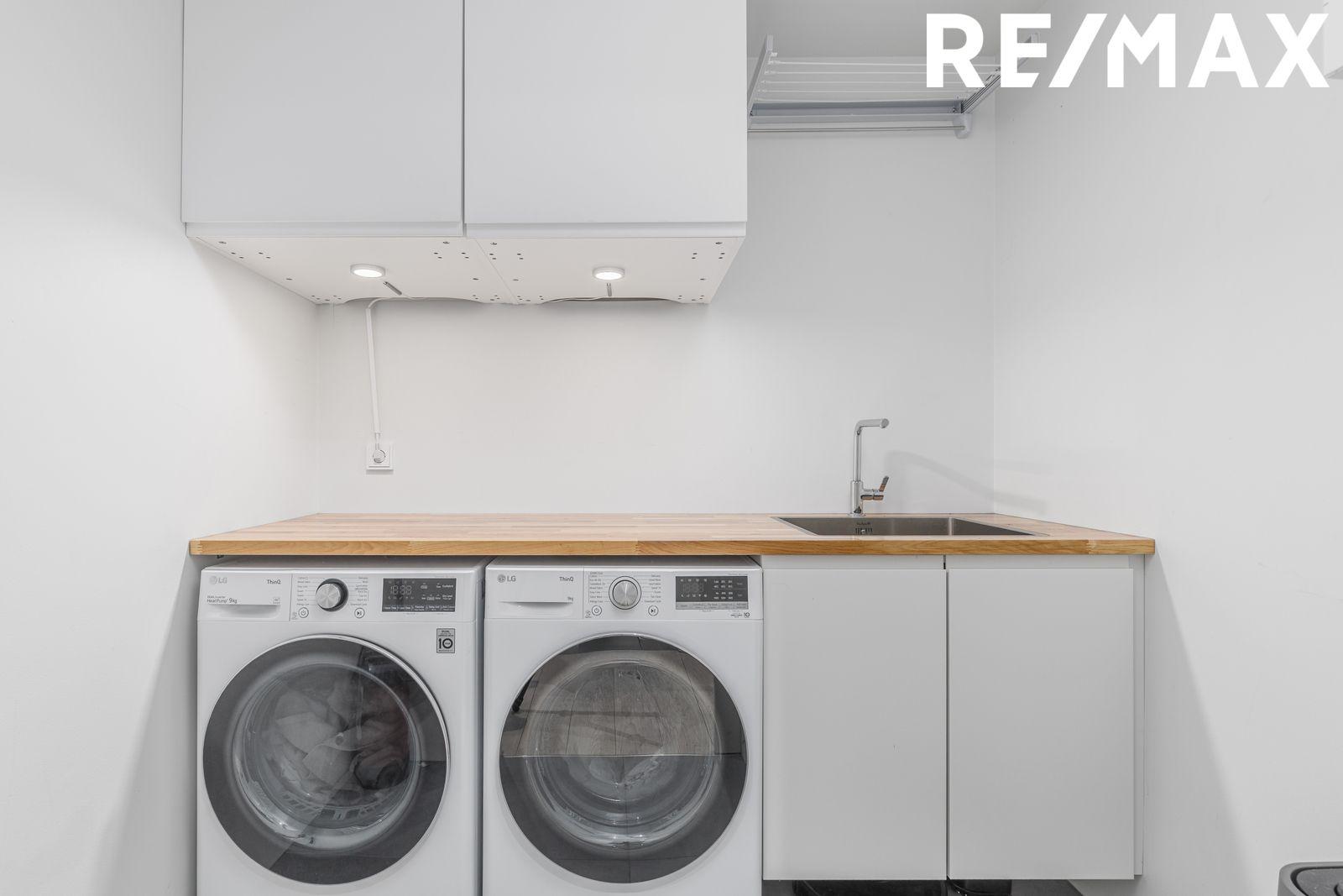 Þvottahús með flísum á gólfi og tengi fyrir þvottavél og þurrkara.