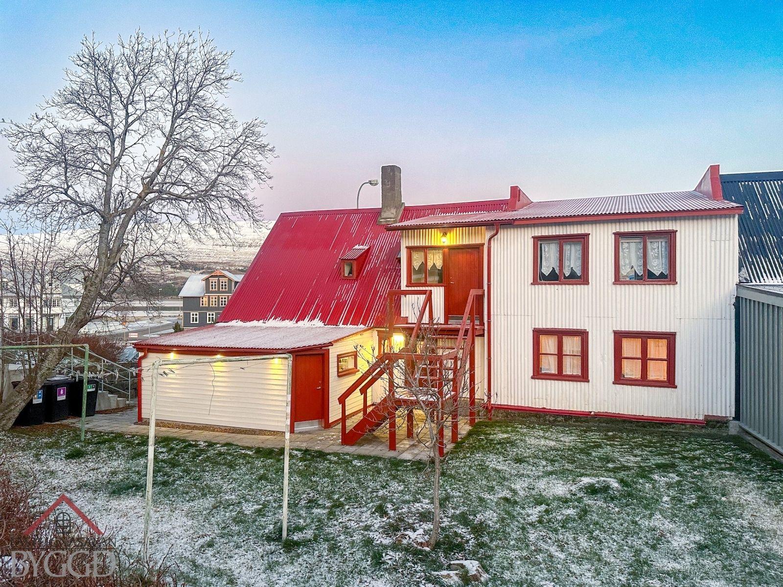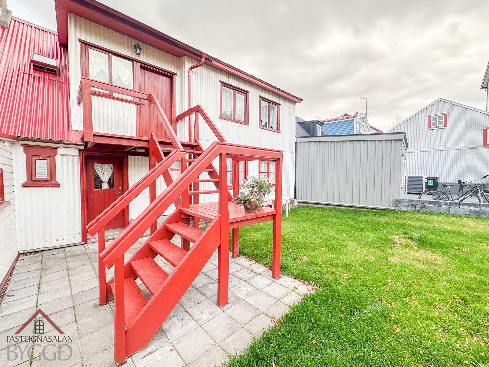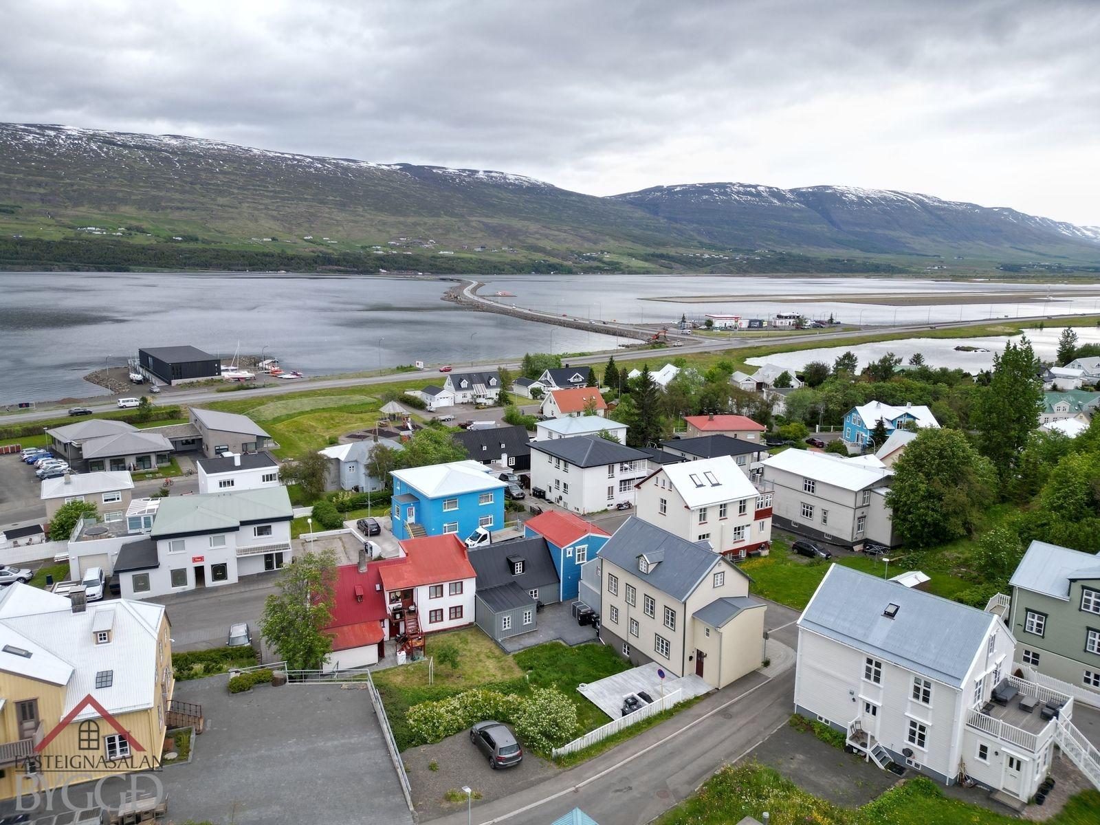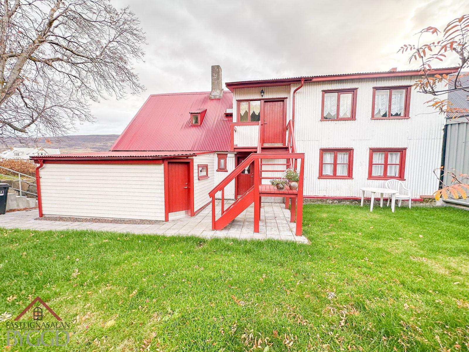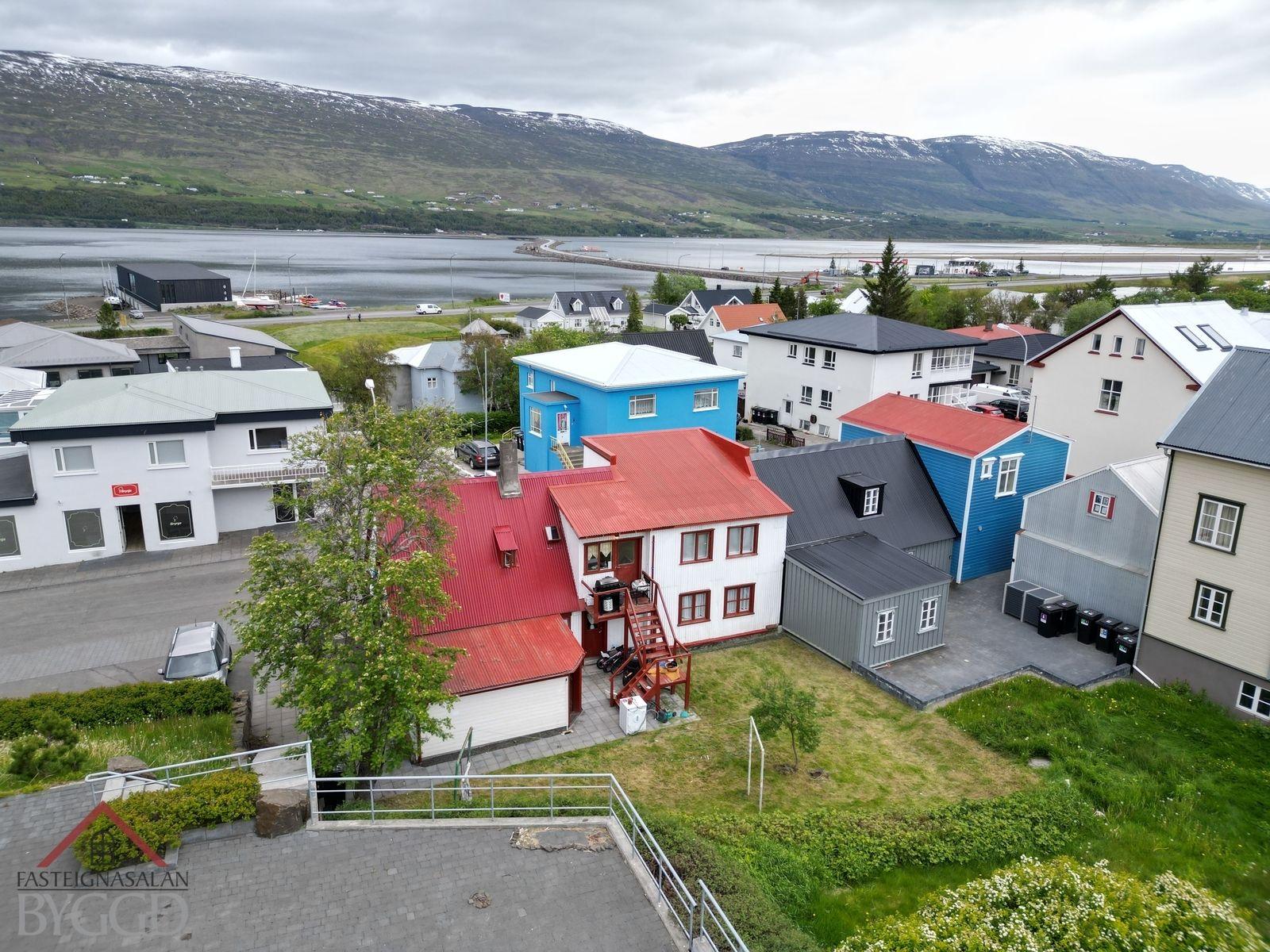 Um er að ræða tveggja íbúða hús í innbænum á Akureyri. Eignin er samtals 159,5 fm., neðri hæð er skráð 92,5 með geymslu og efri hæð skráð 67 fm. og er hún undir súð að hluta svo gólf fermetrar eru fleiri. Ekki er opið á milli íbúða og hefur efri hæð sér inngang að utan sem snýr til vesturs. Búið er að gera miklar endurbætur á eigninni.