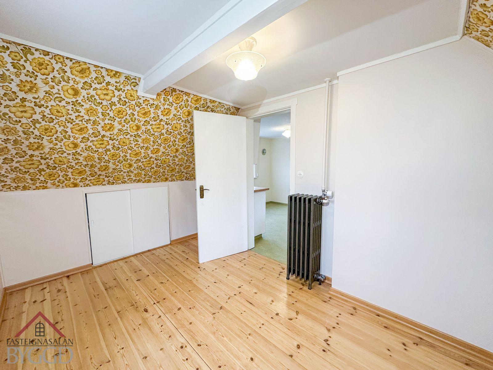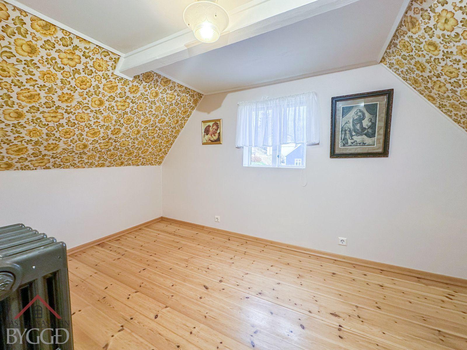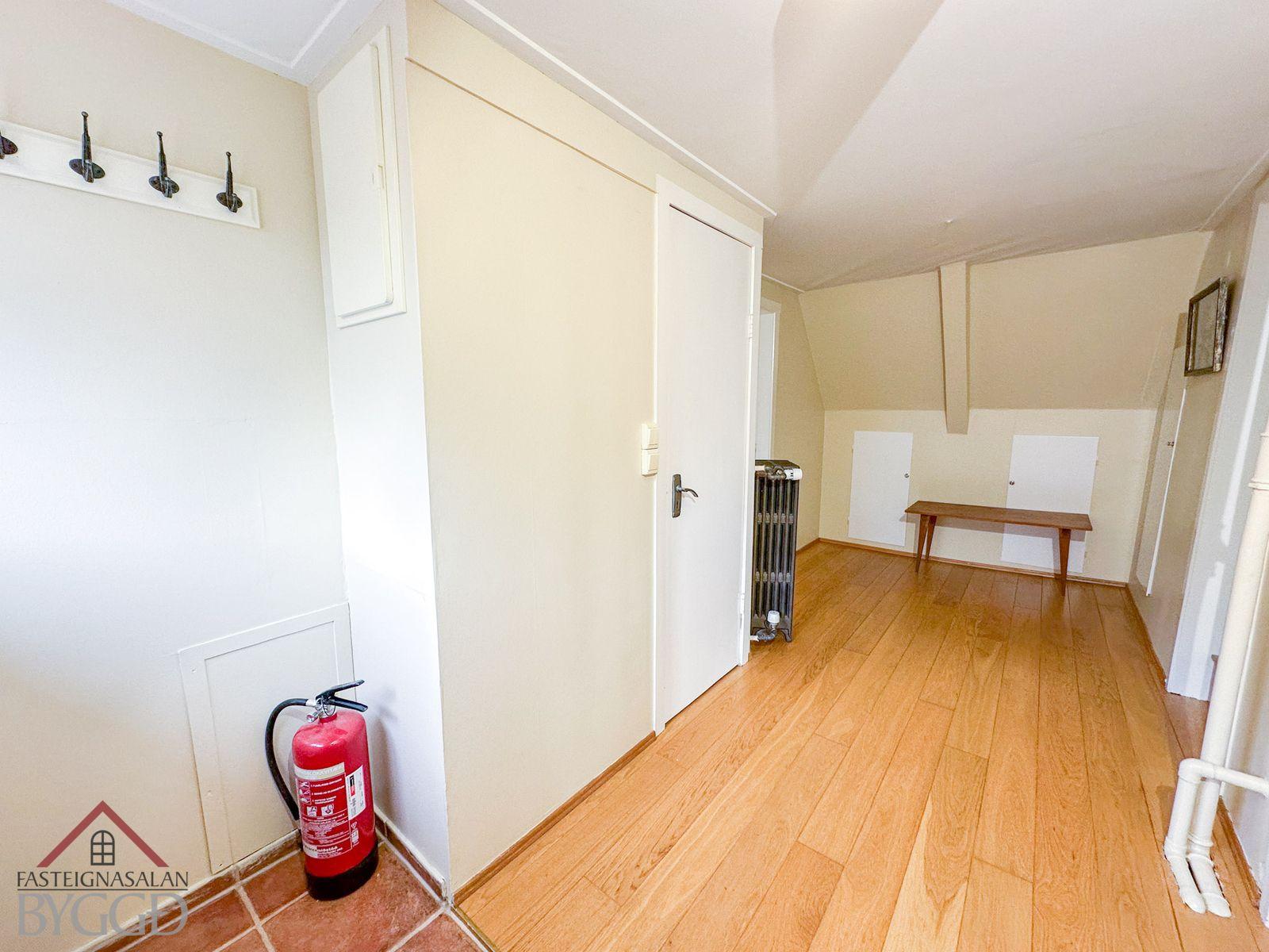 Efri hæð: Gengið er inn á efri hæð austan við hús um timburstiga. Komið er inn í anddyri með flísar á gólfi. Við hlið þess er baðherbergi með aðstöðu fyrir þvottavél, baðkar og þakglugga. Tvö svefnherbergi eru á hæðinni, annað við gang og hitt inn af eldhúsi. Stofa efri hæðar snýr til austurs og með glugga til tveggja átta. Þar er parket á gólfi. Eldhús er rúmgott með eldri innréttingu.