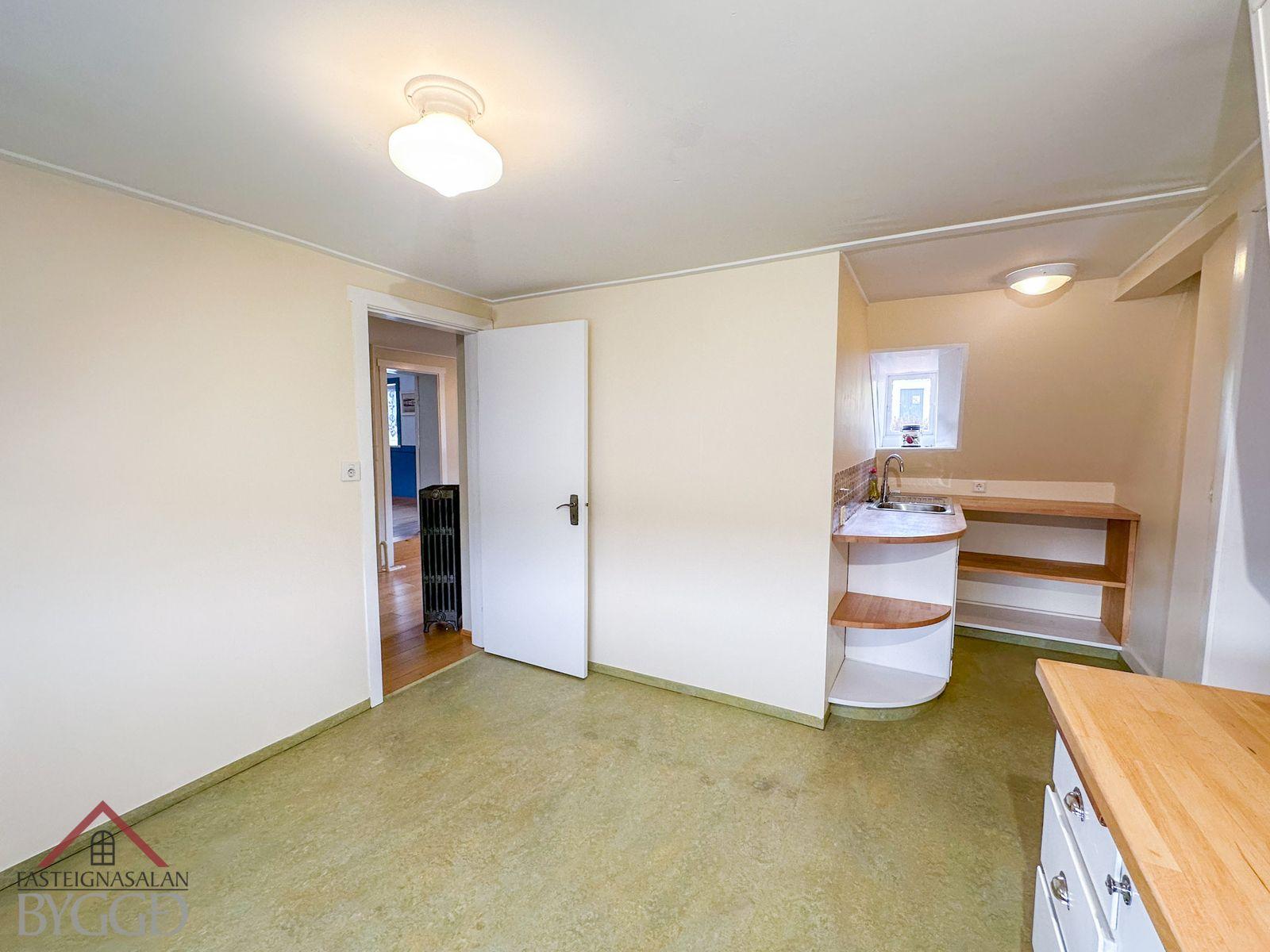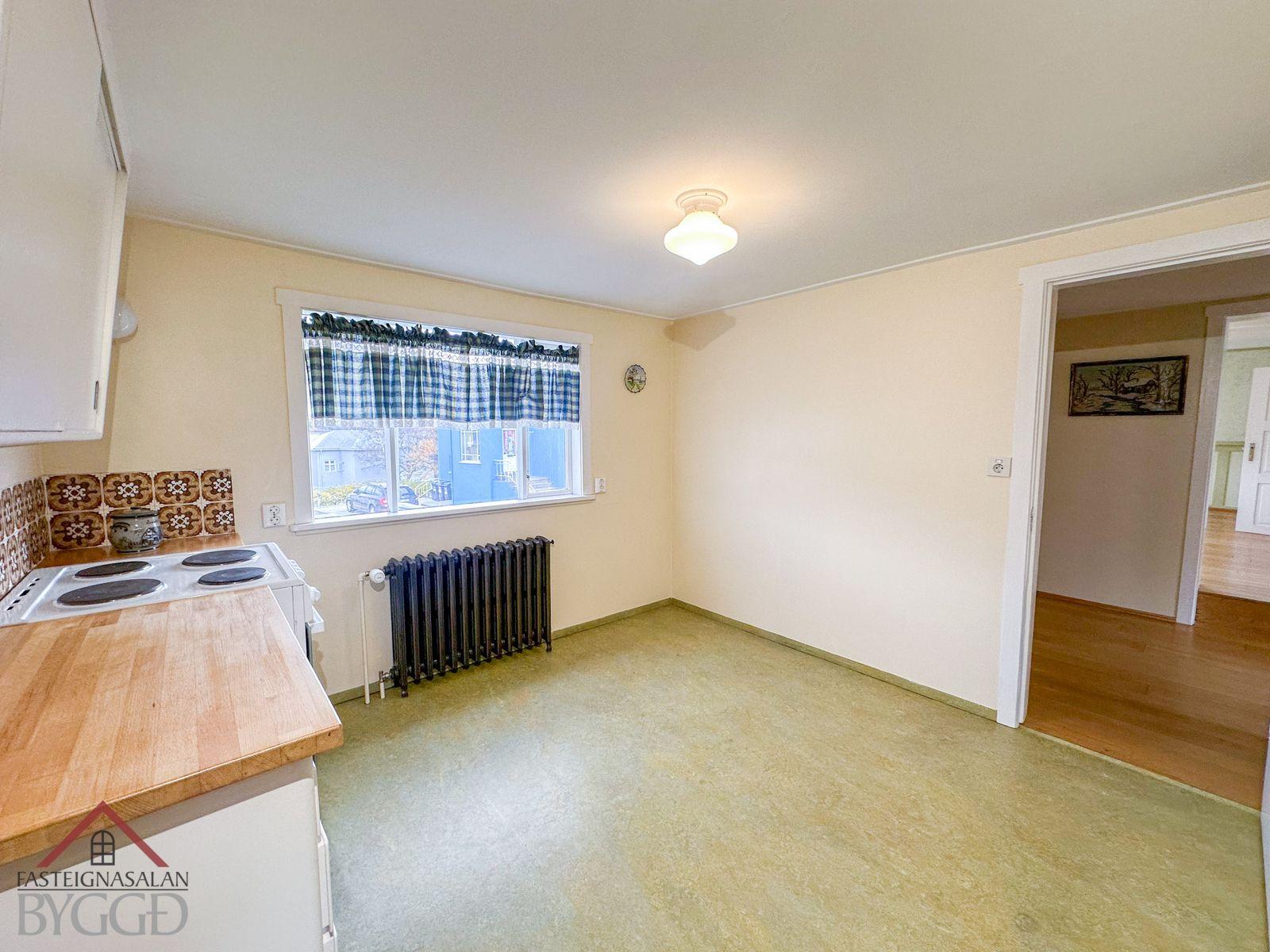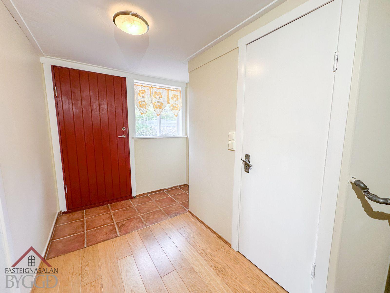 Neðri hæð: Aðalinngangur neðri hæðar snýr til austurs. Komið er inn í anddyri og þar fyrir innan er eldhús með nýrri innréttingu með innbyggðum ísskáp og uppþvottavél sem fylgir við sölu og eldhúskrók. Úr eldhúsi er hleri niður í um 4 fm. skemmtilegt panelklætt kjallararými. Borðstofa og stofa er í samliggjandi rými og með glugga til austurs. Svefnherbergi er bæði innangengt úr stofu og bakdyrainngangi. Baðherbergi er með flísar á gólfi og þar er gólfhiti, handklæðaofn, sturta og uppljúkanlegur gluggi. Bakdyrainngangur er með flísar á gólfi og gólfhita. Þá er útbygging sem er bæði innangengt úr eldhúsi og að utan. Þar er gert ráð fyrir aðstöðu fyrir þvottavél og þurrkara. Nýtist vel fyrir t.d. hjól, skíði o.fl.