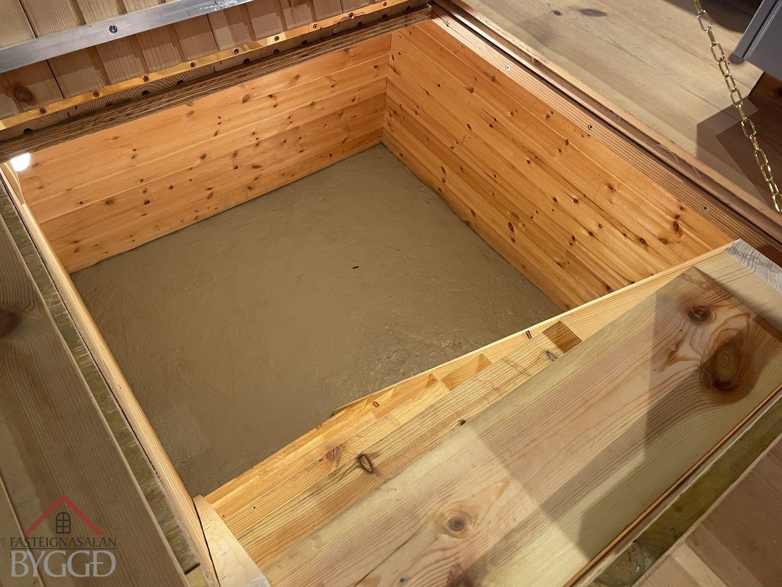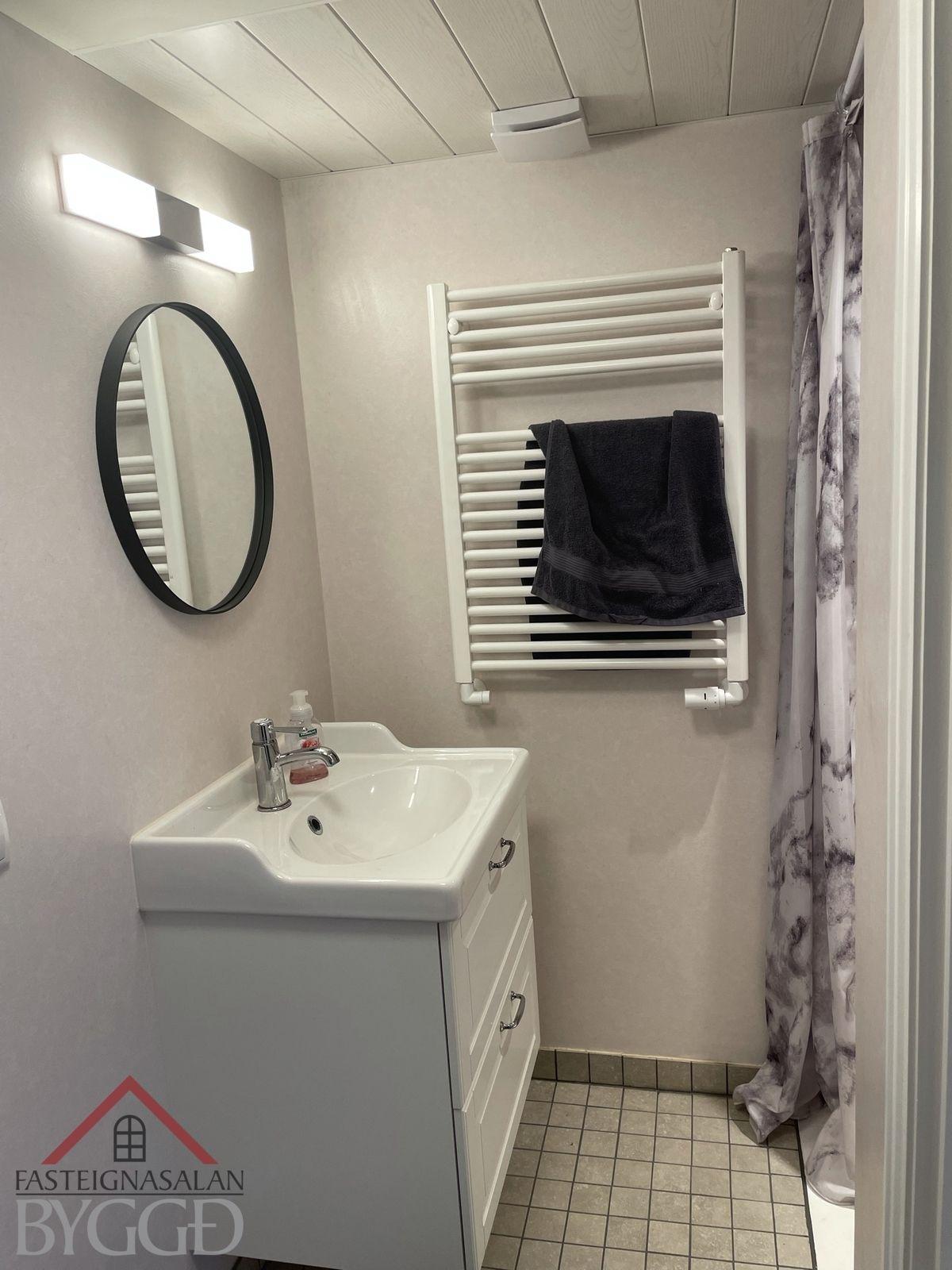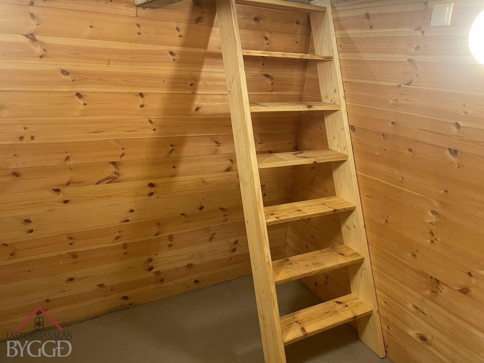 Neðri hæð: Aðalinngangur neðri hæðar snýr til austurs. Komið er inn í anddyri og þar fyrir innan er eldhús með nýrri innréttingu með innbyggðum ísskáp og uppþvottavél sem fylgir við sölu og eldhúskrók. Úr eldhúsi er hleri niður í um 4 fm. skemmtilegt panelklætt kjallararými. Borðstofa og stofa er í samliggjandi rými og með glugga til austurs. Svefnherbergi er bæði innangengt úr stofu og bakdyrainngangi. Baðherbergi er með flísar á gólfi og þar er gólfhiti, handklæðaofn, sturta og uppljúkanlegur gluggi. Bakdyrainngangur er með flísar á gólfi og gólfhita. Þá er útbygging sem er bæði innangengt úr eldhúsi og að utan. Þar er gert ráð fyrir aðstöðu fyrir þvottavél og þurrkara. Nýtist vel fyrir t.d. hjól, skíði o.fl.