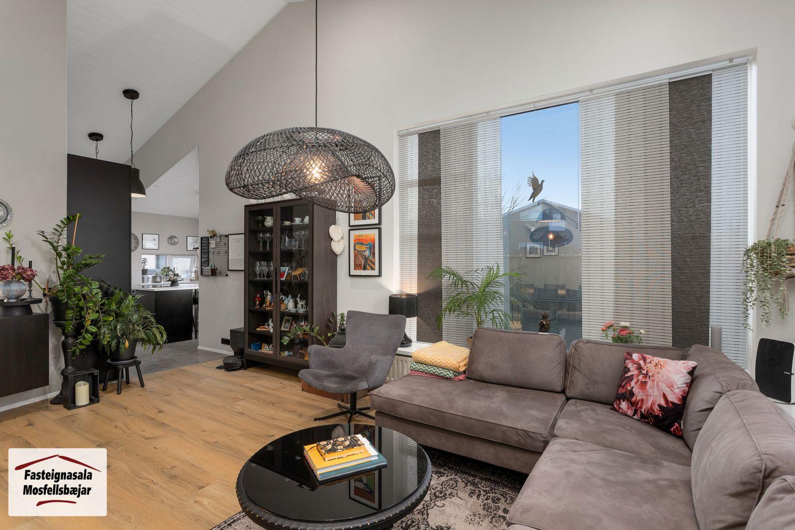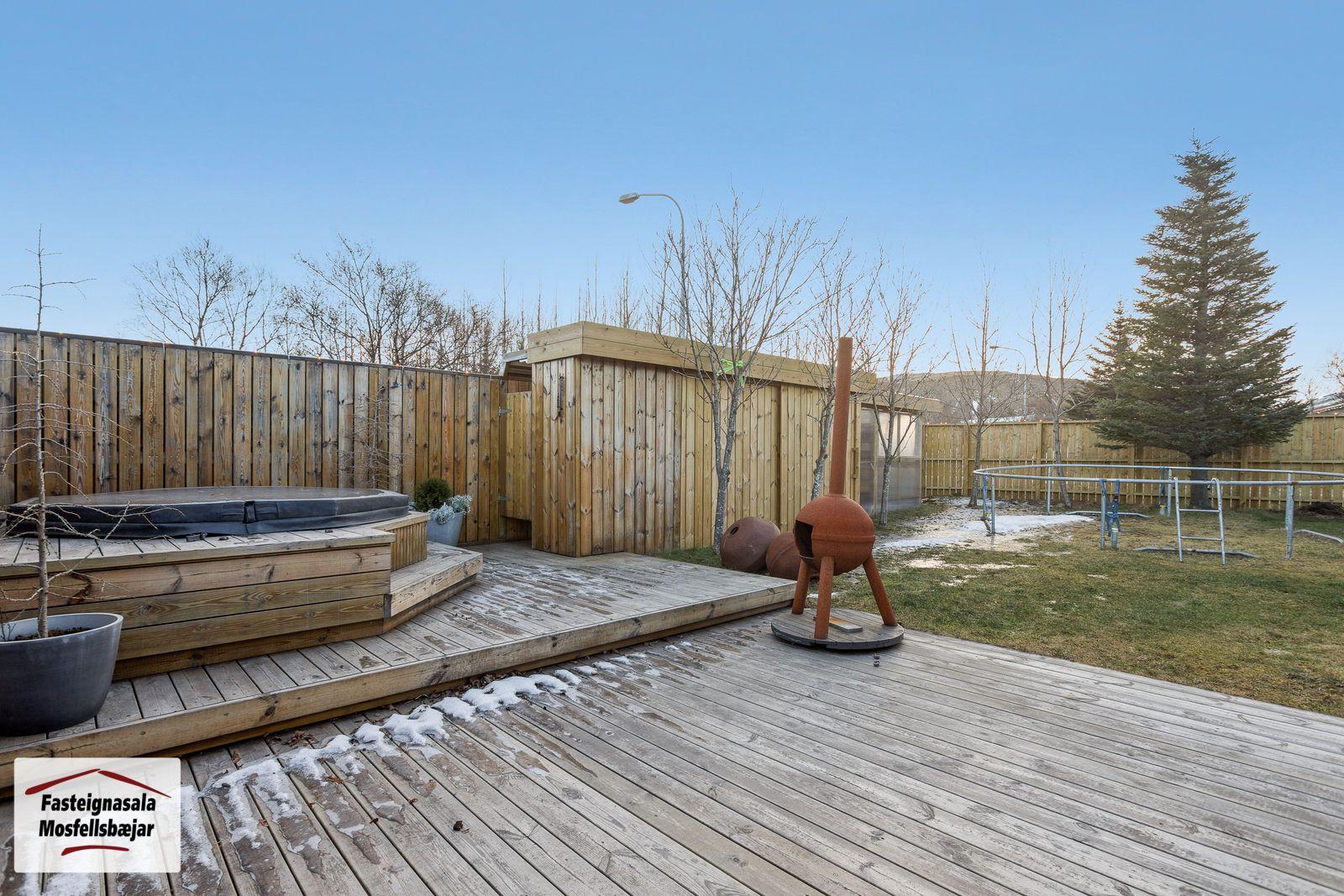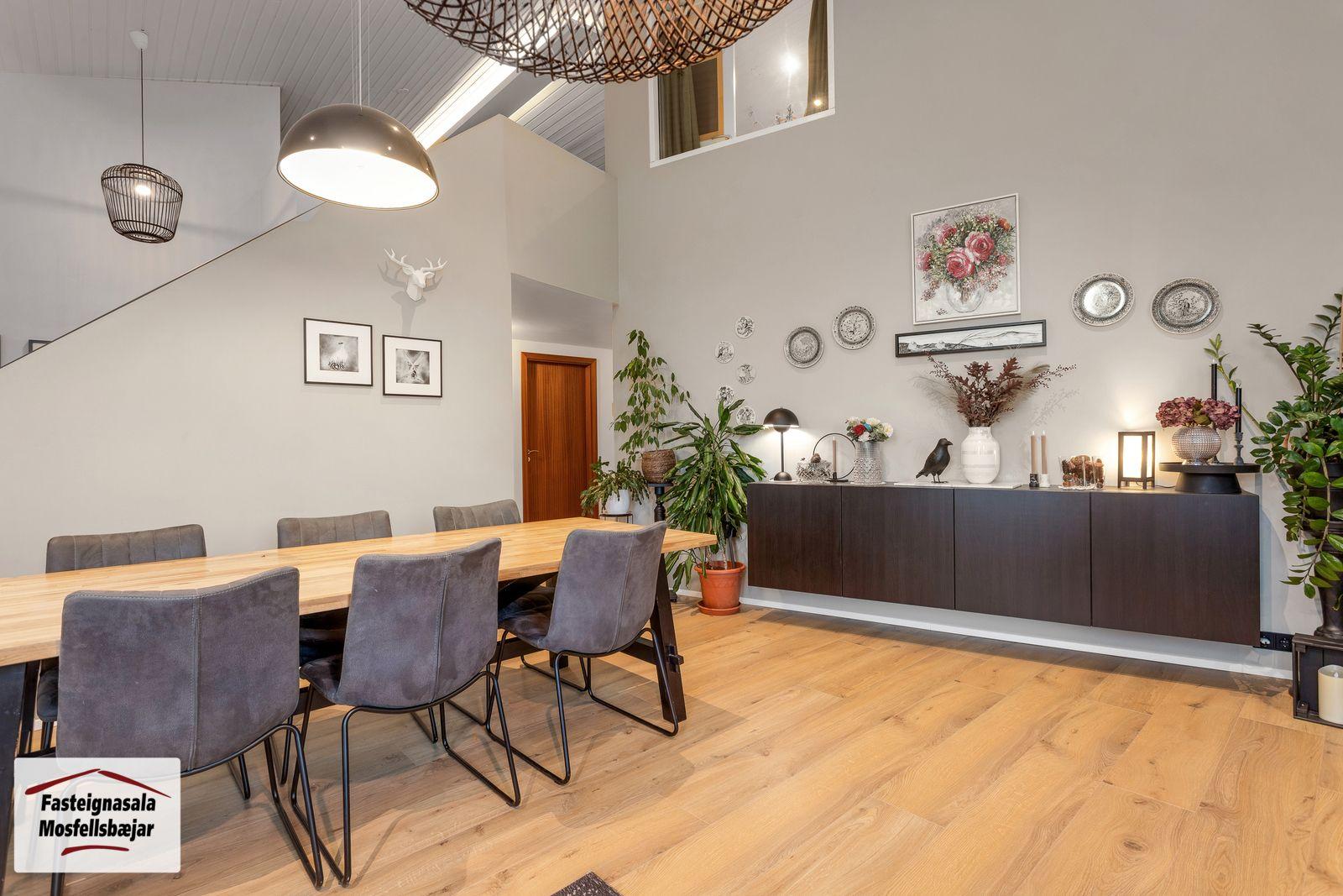** Hafðu samband og bókaðu skoðun - Svanþór Einarsson, löggiltur fasteignasali - svanthor@fastmos.is eða 698-8555 - Theodór Emil Karlsson, löggiltur fasteignasali - teddi@fastmos.is eða 690-8040 - Steingrímur Benediktsson, löggiltur fasteignasali - steingrimur@fastmos.is eða 862-9416 **Fasteignasala Mosfellsbæjar kynnir: Fallegt og vel skipulagt 179,6 m2 endaraðhús með innbyggðum bílskúr Spóahöfða 2 í Mosfellsbæ. Eignin skiptist í eldhús, stofu/borðstofu, gang, 4-5 svefnherbergi, rúmgott risloft/sjónvarpstofu, baðherbergi, forstofu, þvottahús og bílskúr með geymslulofti. Eignin er skráð 179,6 m2, þar af raðhús 150,0 m2 (þar af milliloft 19,1 m2) og bílskúr 29,6 m2. Milliloftið er mun stærra en skráðir fermetrar þar sem það er að hluta undir súð og auk þess búið að gera herbergi inn af því. Í bakgarði er garðskáli og timburverönd í suðausturátt með heitum potti, úti sturtu. Einnig er þar góð geymsla og lítið gróðurhús. Fyrir framan hús er önnur timburverönd og hellulagt bílaplan með snjóbræðslu og hleðslustöð sem fylgir. Vinsæl staðsetning, stutt í golfvöll, Lágafellskóla, leikskólann Hulduberg og Lágafellslaug. Samkvæmt upplýsingum frá seljanda hefur verið farið í framkvæmdir og endurbætur á eigninni á síðustu árum:Árið 2019-2020 var útbúin garðstofa, timburverönd með heitum potti og útisturta