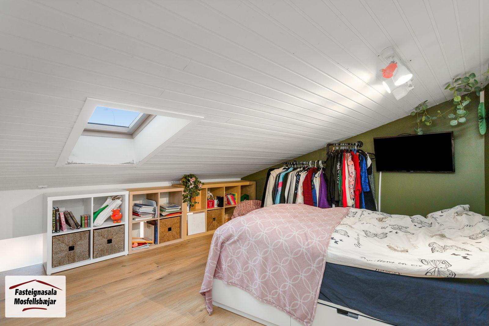 Risloft og svefnherbergi nr 5. eru með parketi á gólfi. Í svefnherbergi er þakgluggi.