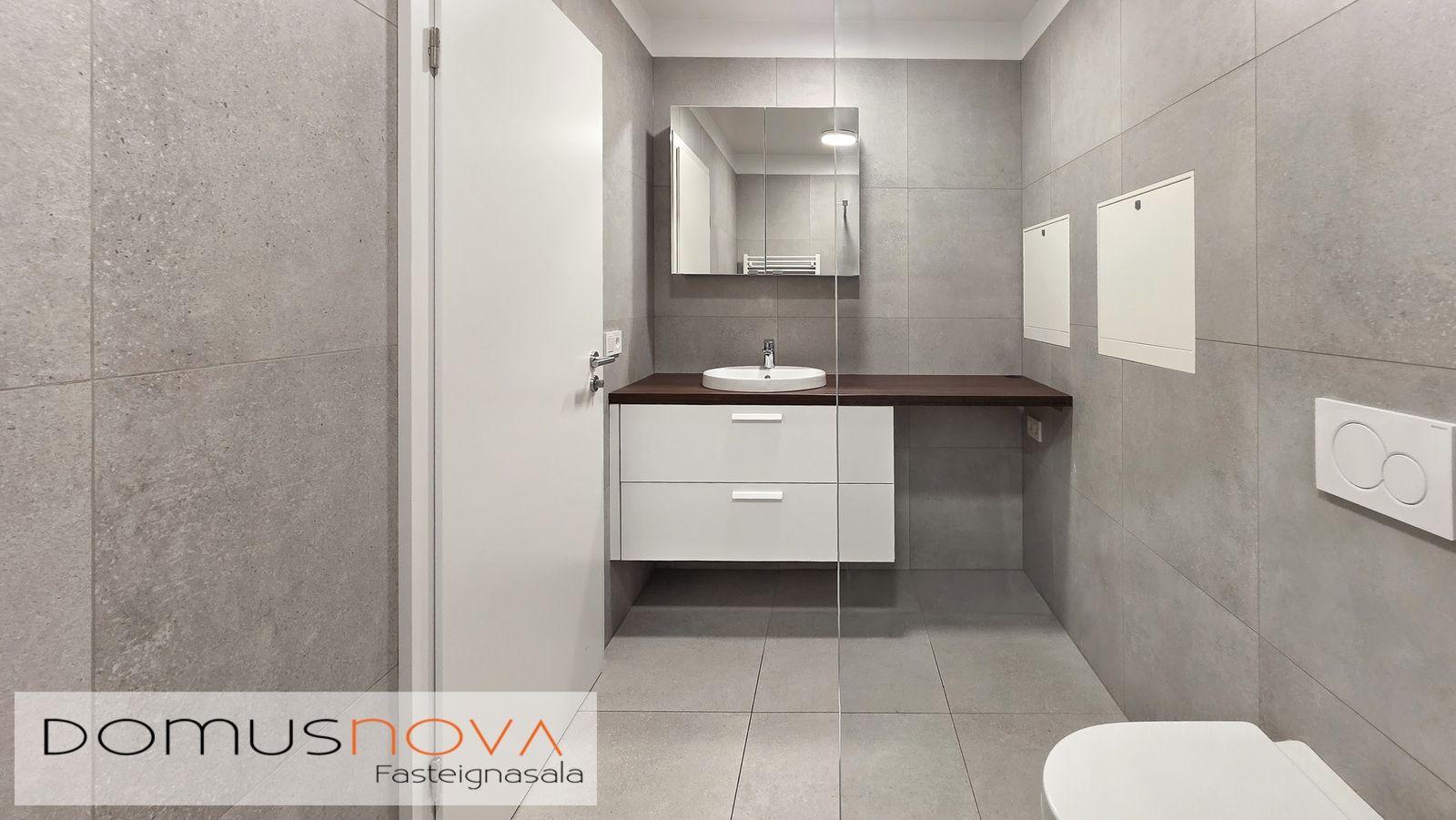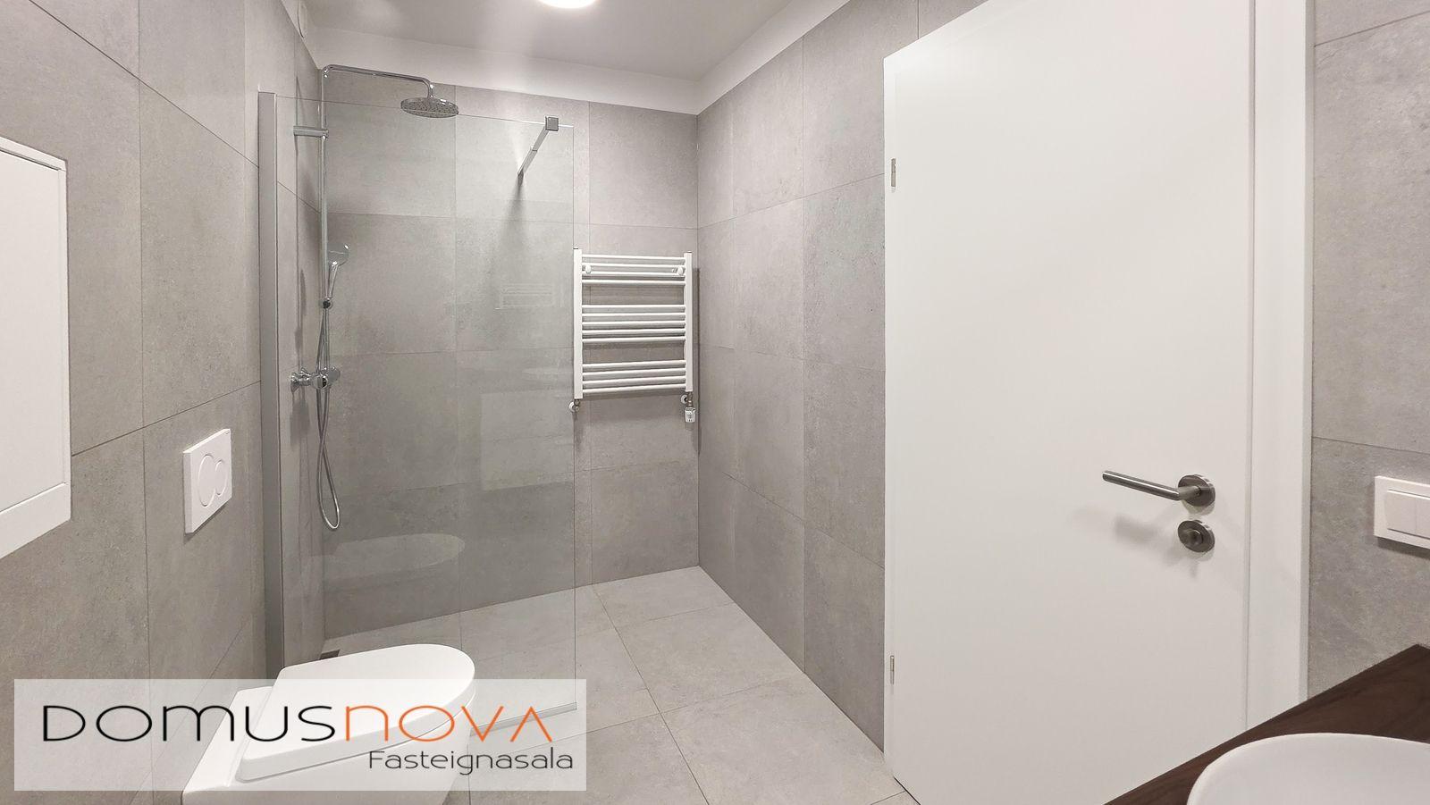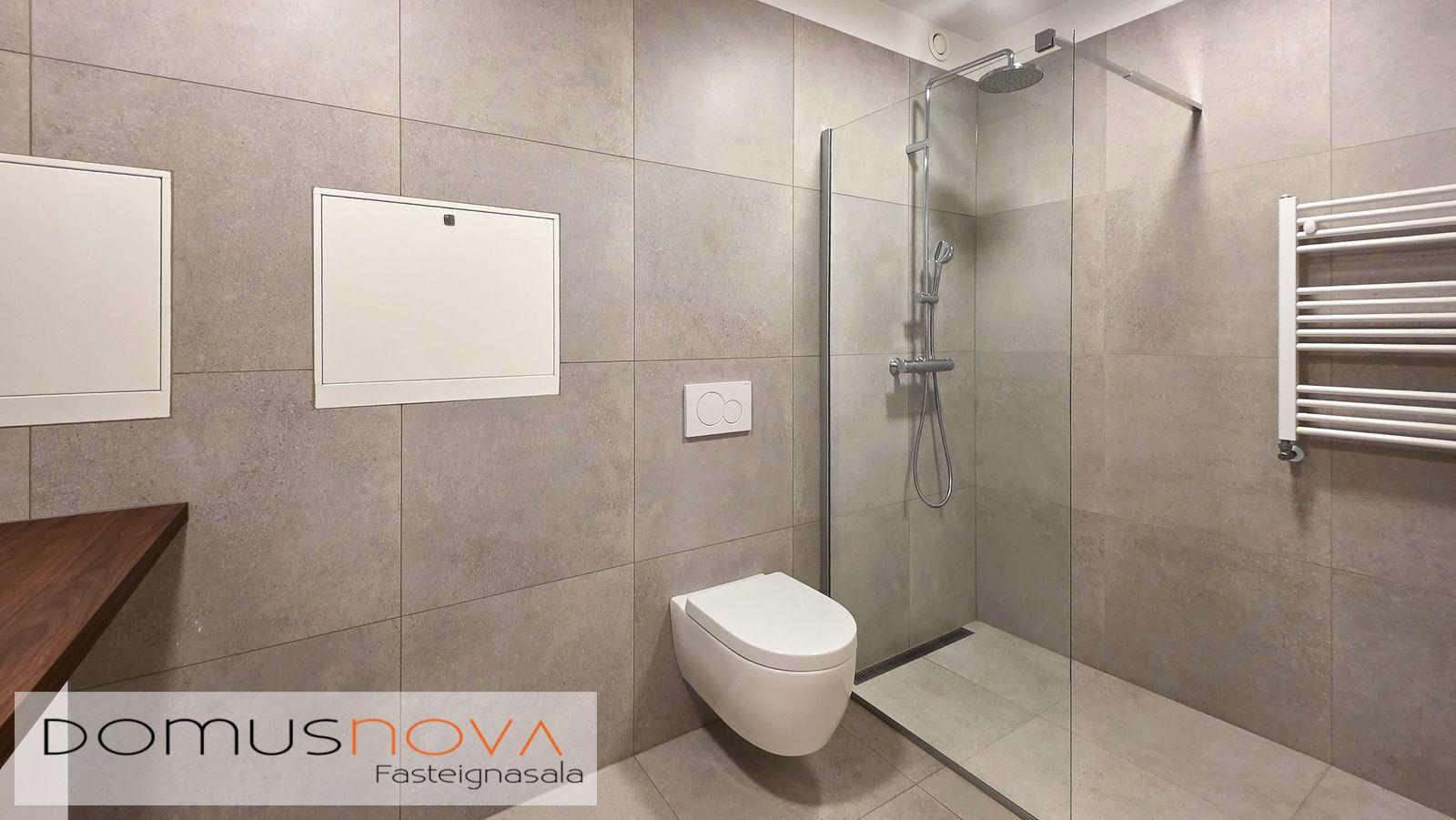 Baðherbergi: Hvít innrétting með brúnni borðplötu og hvítri handlaug. Speglaskápur yfir handlaug. Upphengt salerni með hæglokandi setu, WALK IN sturta og handklæðaofn. Hitastýrð blöndunartækin frá Tengi. Veggflísar og gegnheilar flísar á gólfi. Þvottaaðstaða er í sér skáp í miðrými eignar.