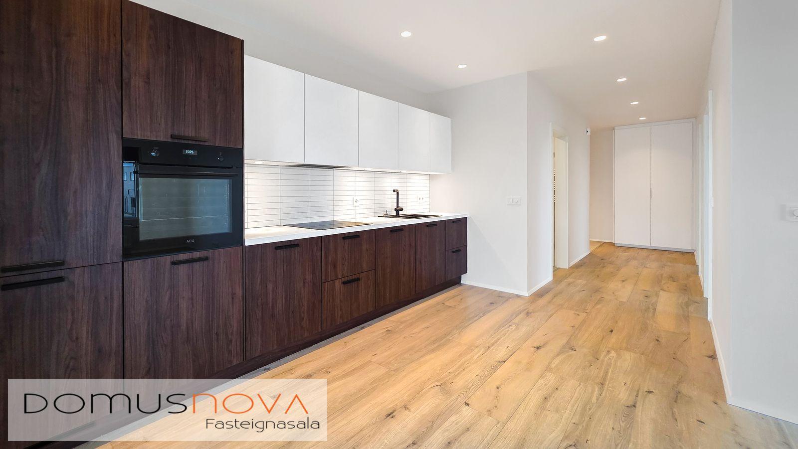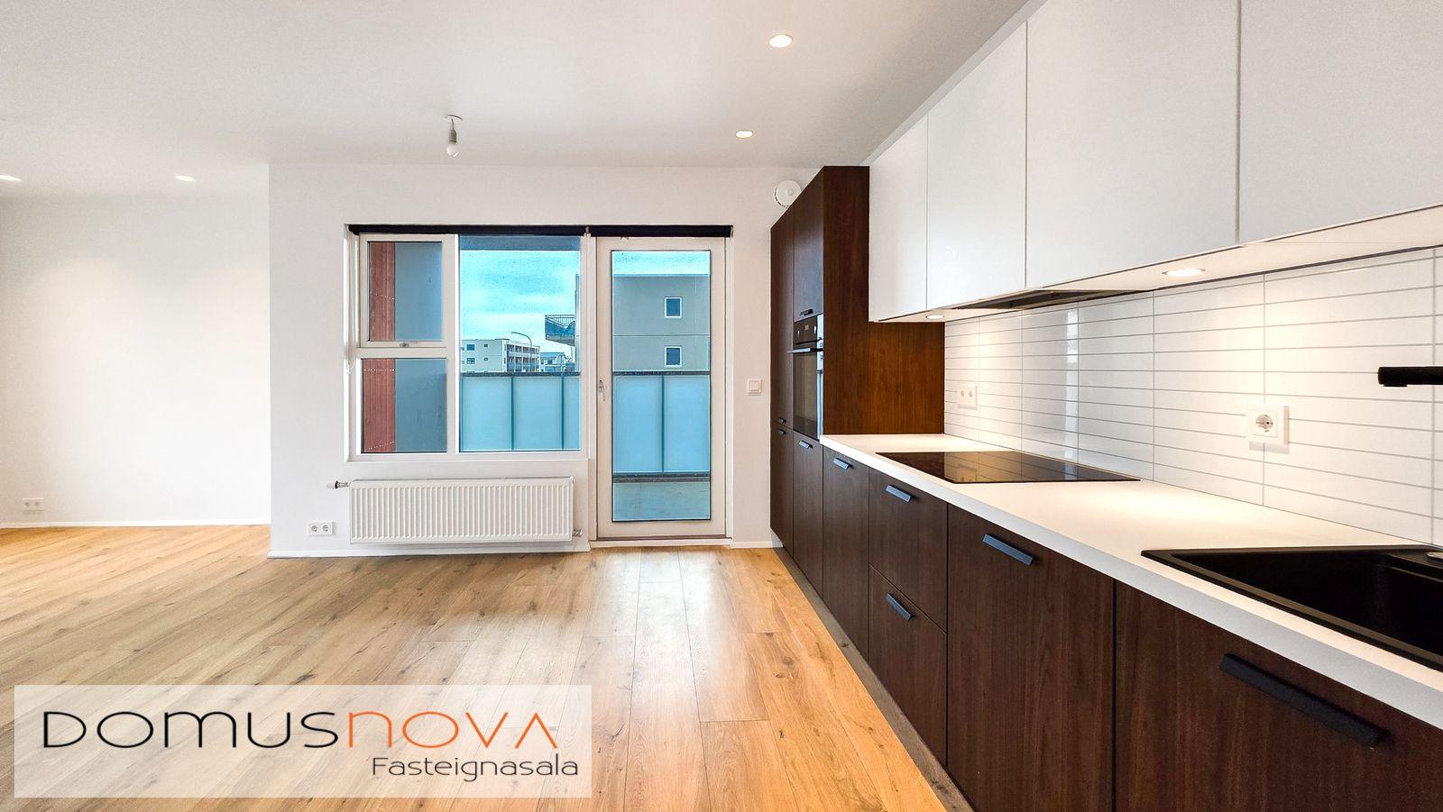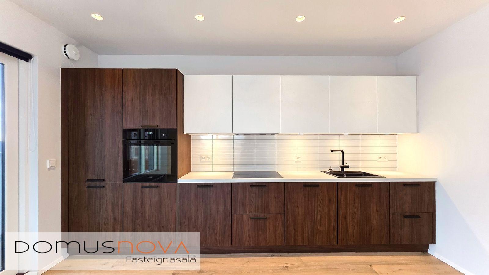 Eldhús: Vönduð brún Nobilia innrétting með hvítum efri skápum frá GKS innréttingar. Raftæki frá AEG, veggofn, spanhelluborð, innbyggð uppþvottavél og innbyggður kæliskápur með frysti. Vifta er frá Elica. Eldhúsvaskur og blöndunartæki er svart að lit og er frá Tengi. Harðparket á gólfi.