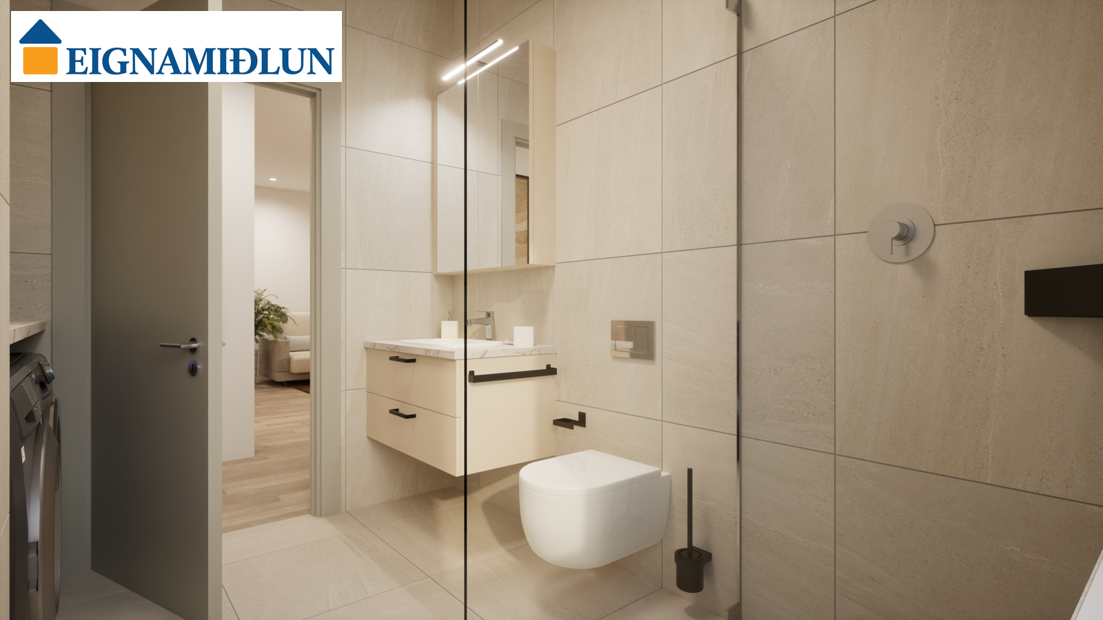 Baðherbergi: Baðherbergi með sturtuklefa. Handlaug, handklæðaofn og upphengt salerni. Flísar á gólfum og veggjum. Aðstaða fyrir þvottavél og þurrkara inn á baðherbergi.