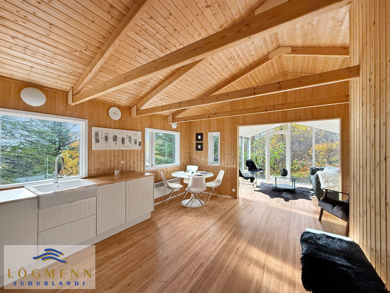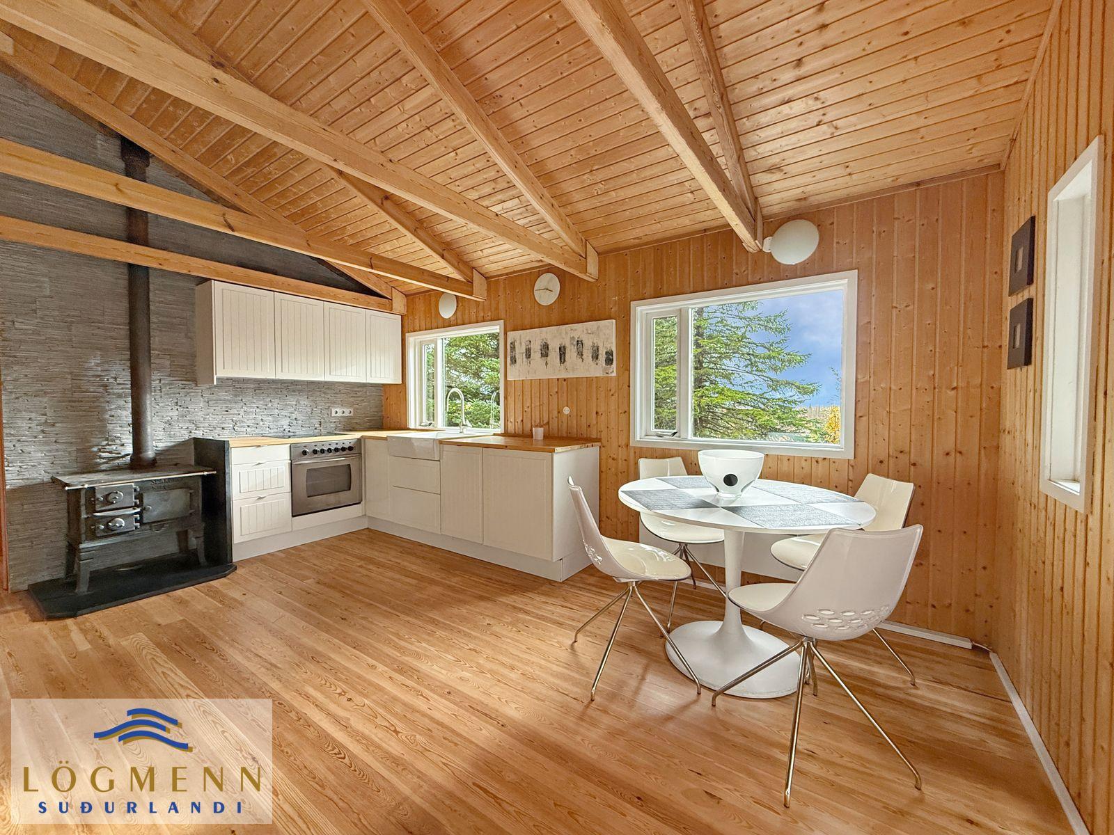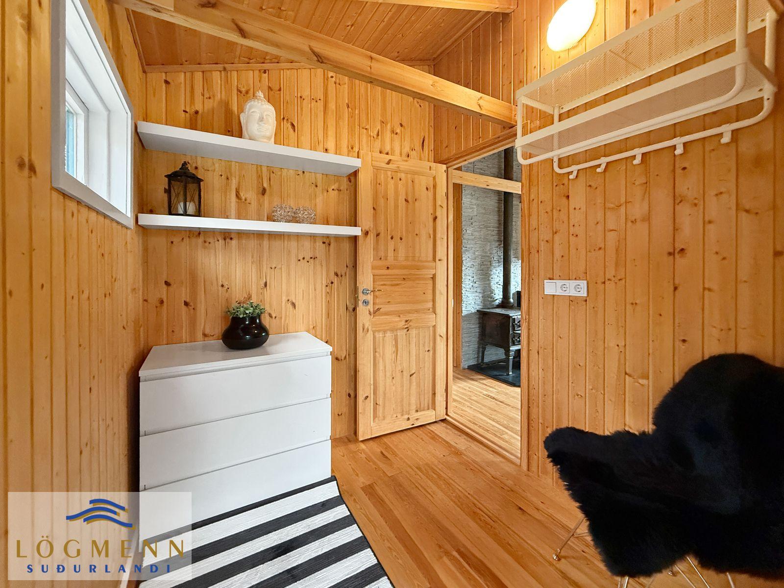 Skipulag hússins: Forstofa: Með furugólffjölum. Tvö svefnherbergi: Bæði með furugólffjölum. Eldhús: Hvít snyrtileg innrétting, kamína og furugólffjalir. Stofa: Björt og opin stofa með furugólffjölum og útgengi á verönd. Á veröndinni er nýr Soft Tub pottur. Baðherbergi: Innrétting með vask, salerni og sturtuklefa.