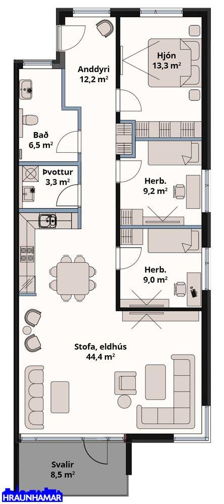 Stofa/borðstofa er björt, þaðan er útgengt svalir.