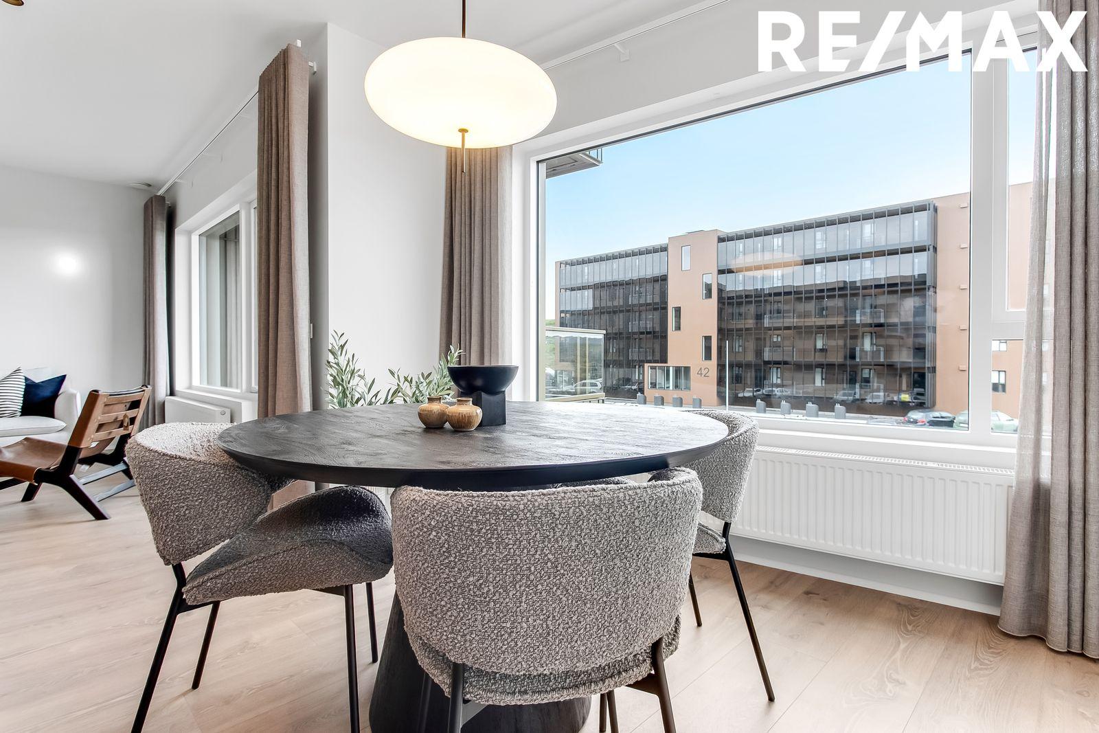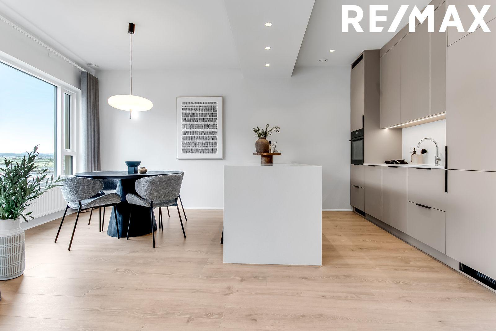 Eldhús: Parket á gólfi, gott skápa- og borðpláss, innréttingin er frá Selós, framhliðar eru matt beige, grábrúnar að lit, borðplötur eru úr 20mm Quartz steini með undirlímdum vaski úr stáli. Eldhústæki eru frá AEG. Innbyggður ísskápur, frystir og uppþvottavél fylgir. Skúffur eru með mjúklokunarbúnaði, og LED lýsing undir efri skápum. Höldur eru svartar grip höldur frá Selós.