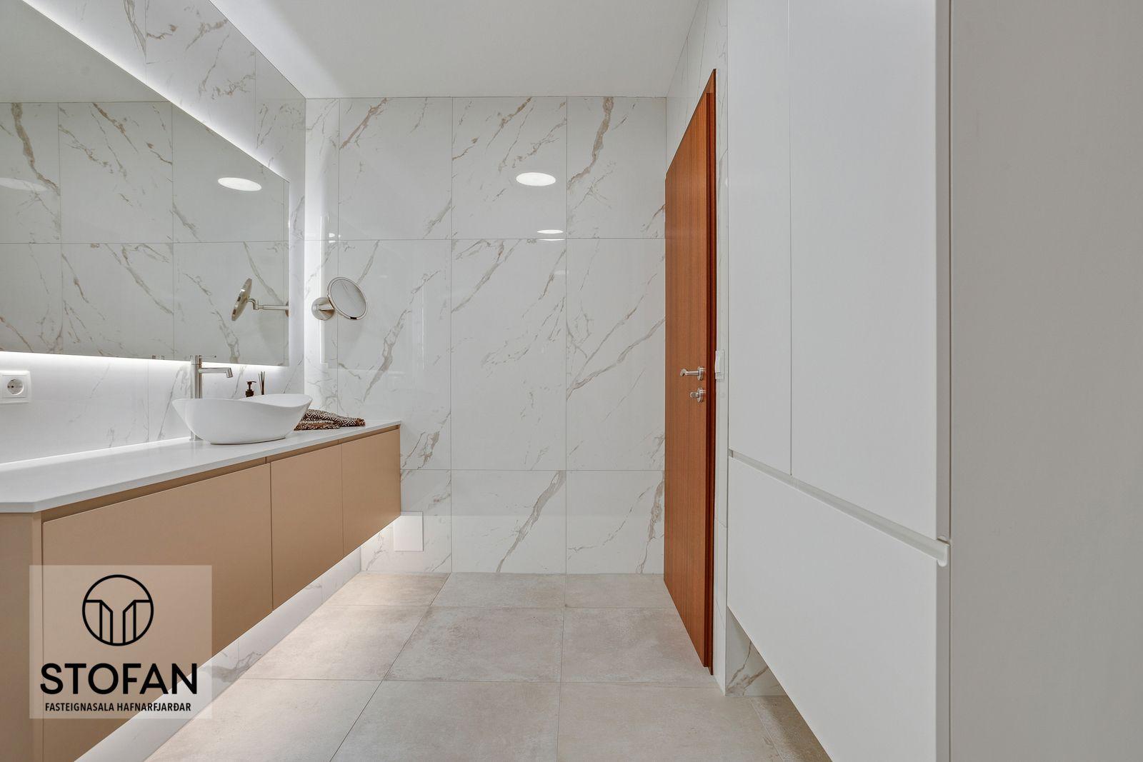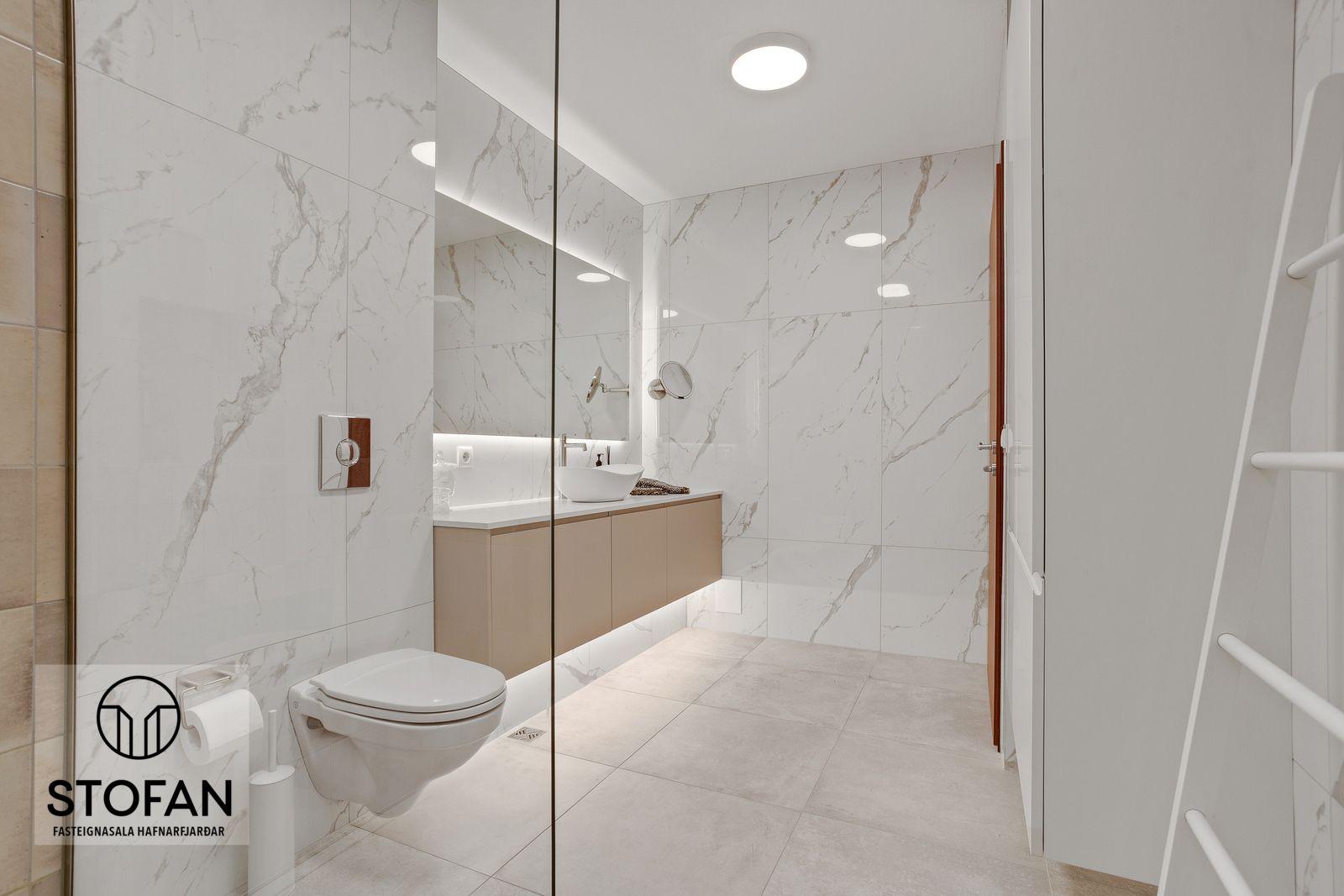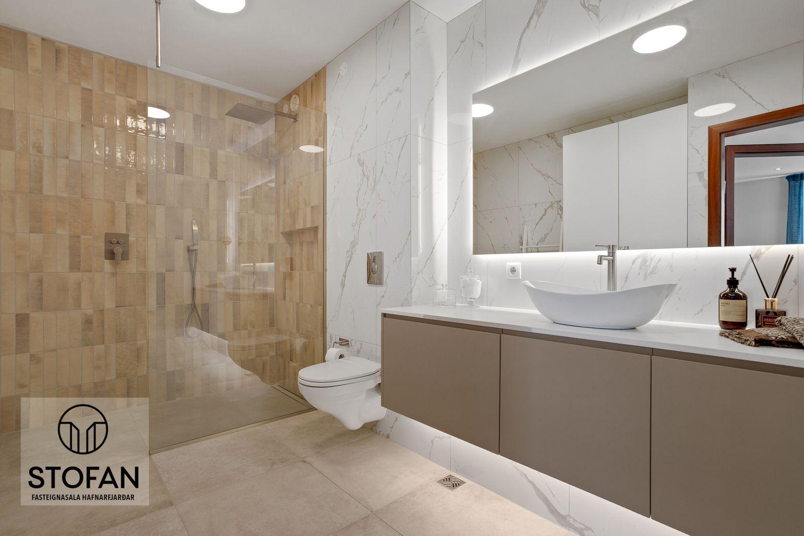 Baðherbergi er fallegt og rúmgott og var nýlega tekið í gegn. Sérsmíðaðar innréttingar og steinn á borðum, flísar á gólfi og veggjum, upphengt salerni, sturta með gleri.