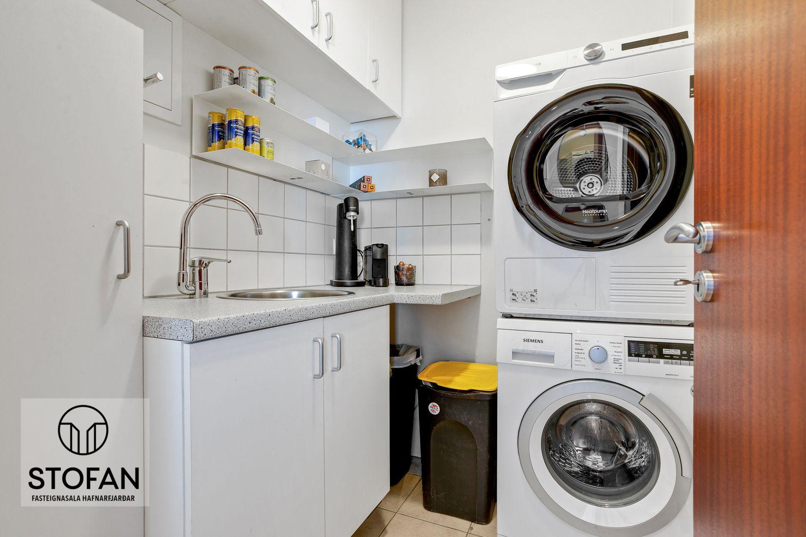 þvottahús með góðri innréttingu og vask, flísar á milli skápa, tengi fyrir þvottavél og þurrkara.