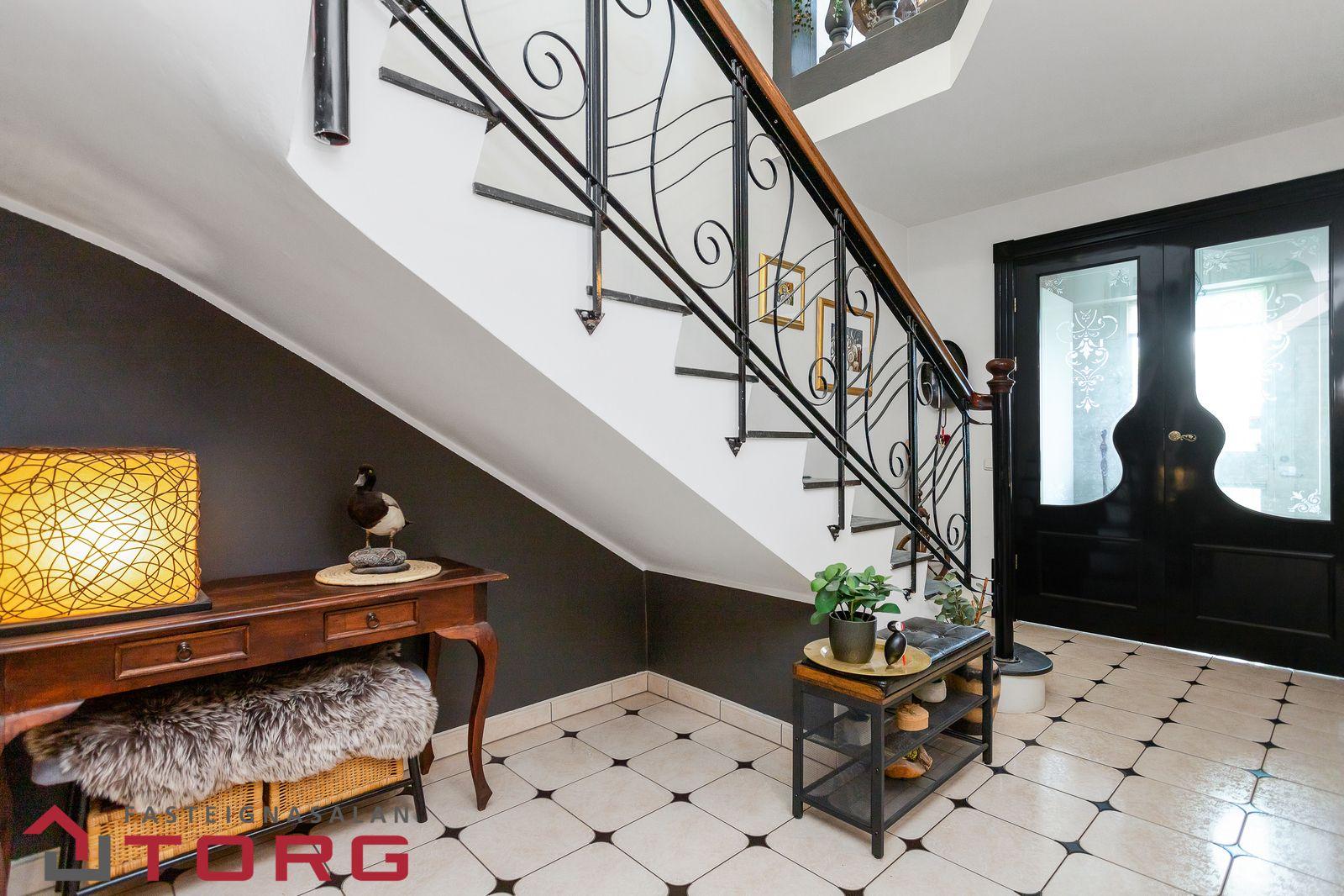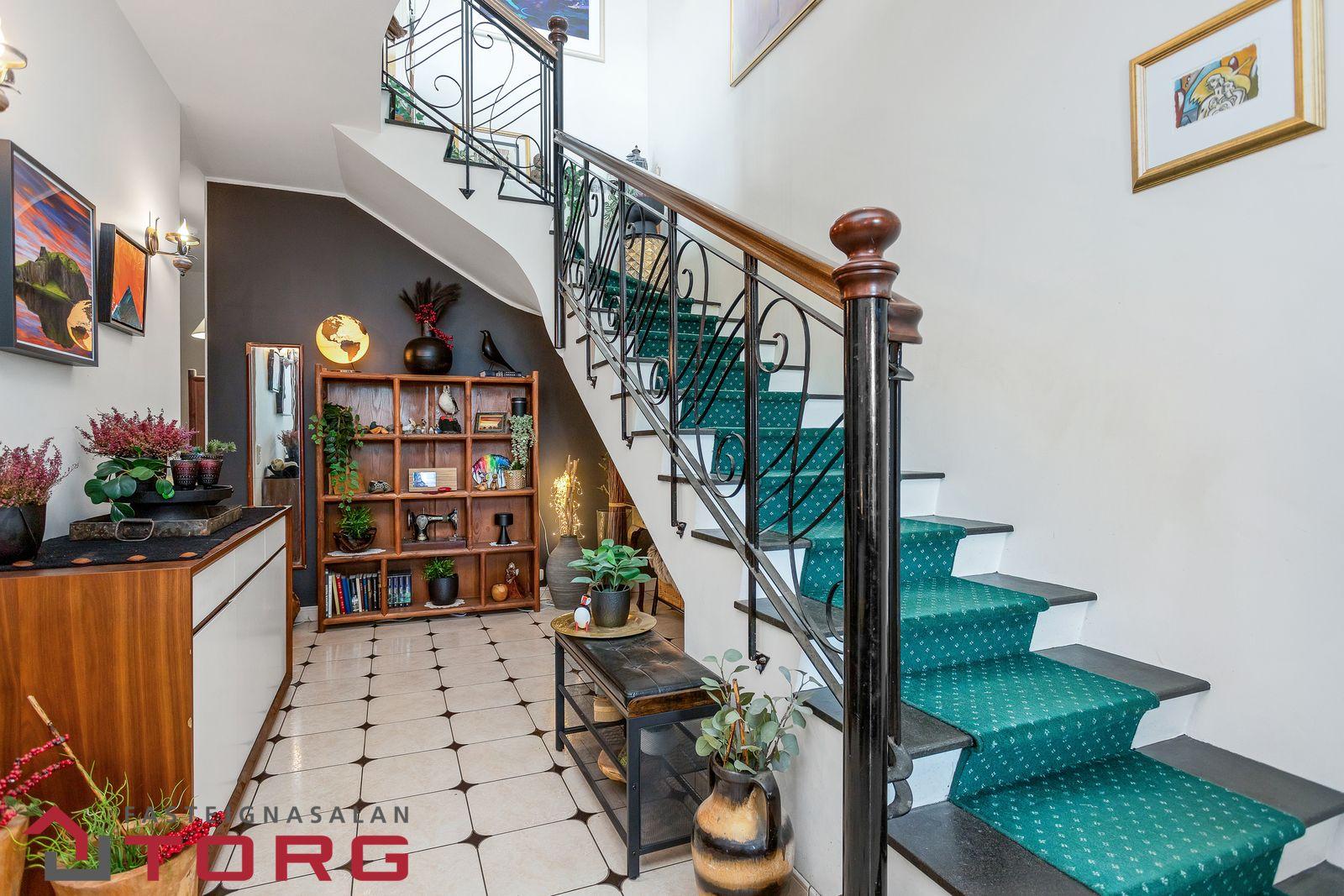 Stigi er upp á efri hæð. Náttúrusteinn á tröppum og teppi.