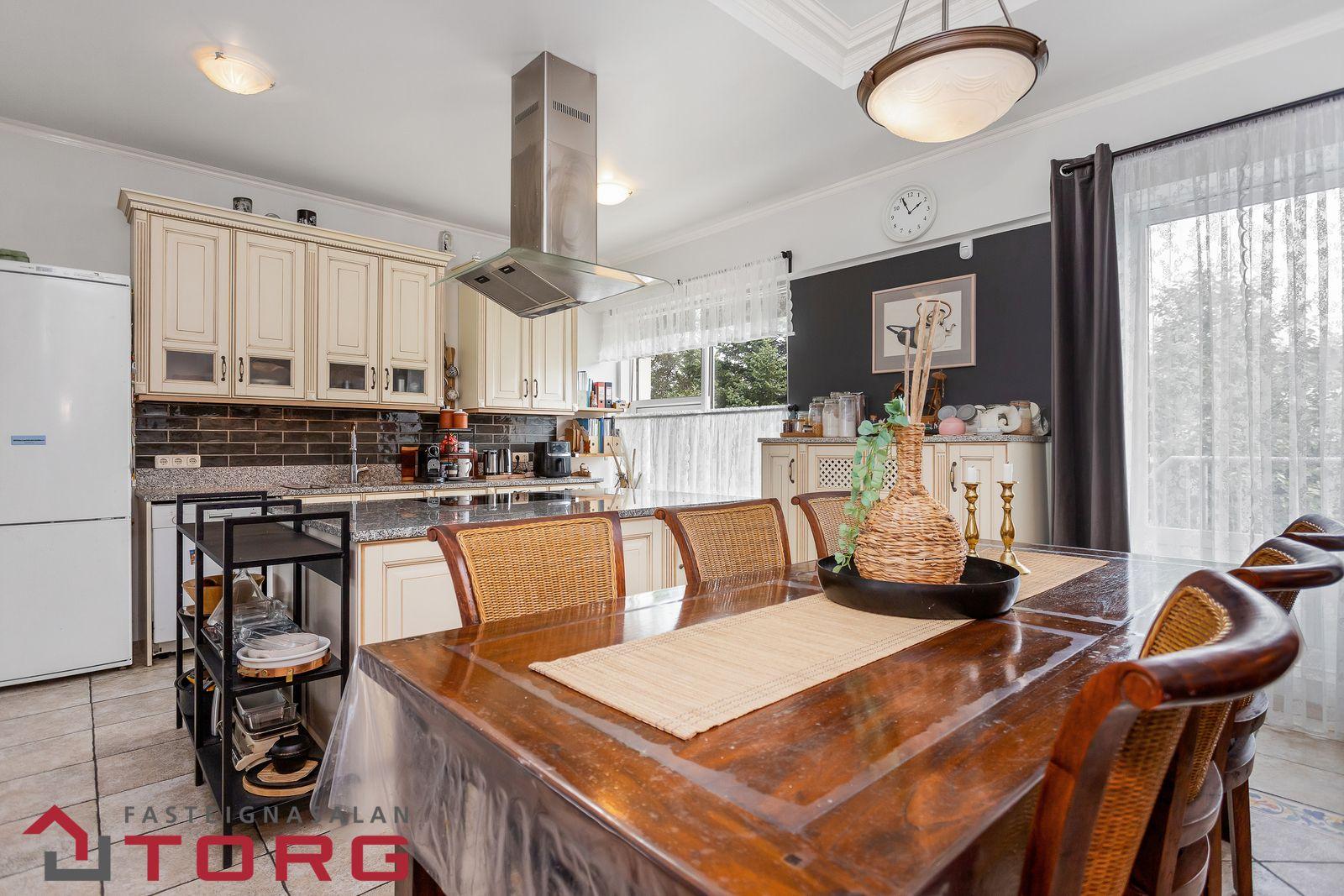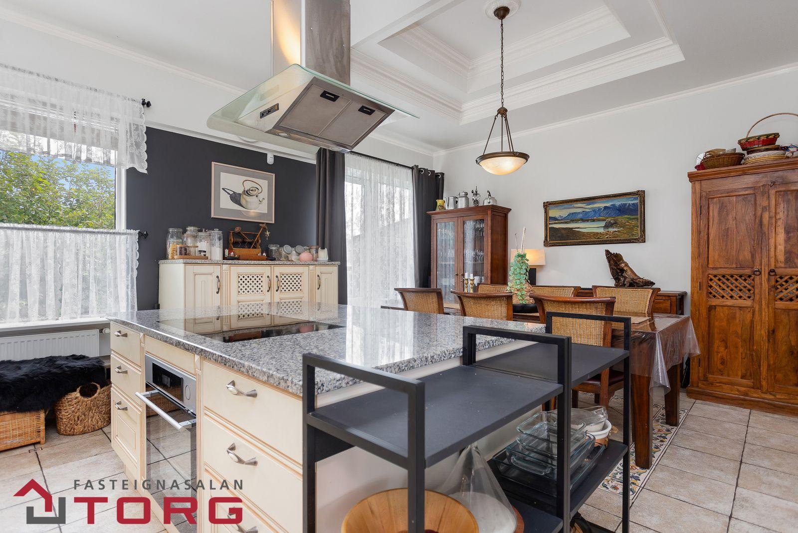 Eldhús og borðstofa eru í skemmtilegu rými með flísum á gólfi, vandaðri innréttingu með miklu skápaplássi og granít borðplötum. Stór eldhúseyja með ofni, helluborði og háfi. Útgengt er í á svalir og bakgarð úr borstofu.