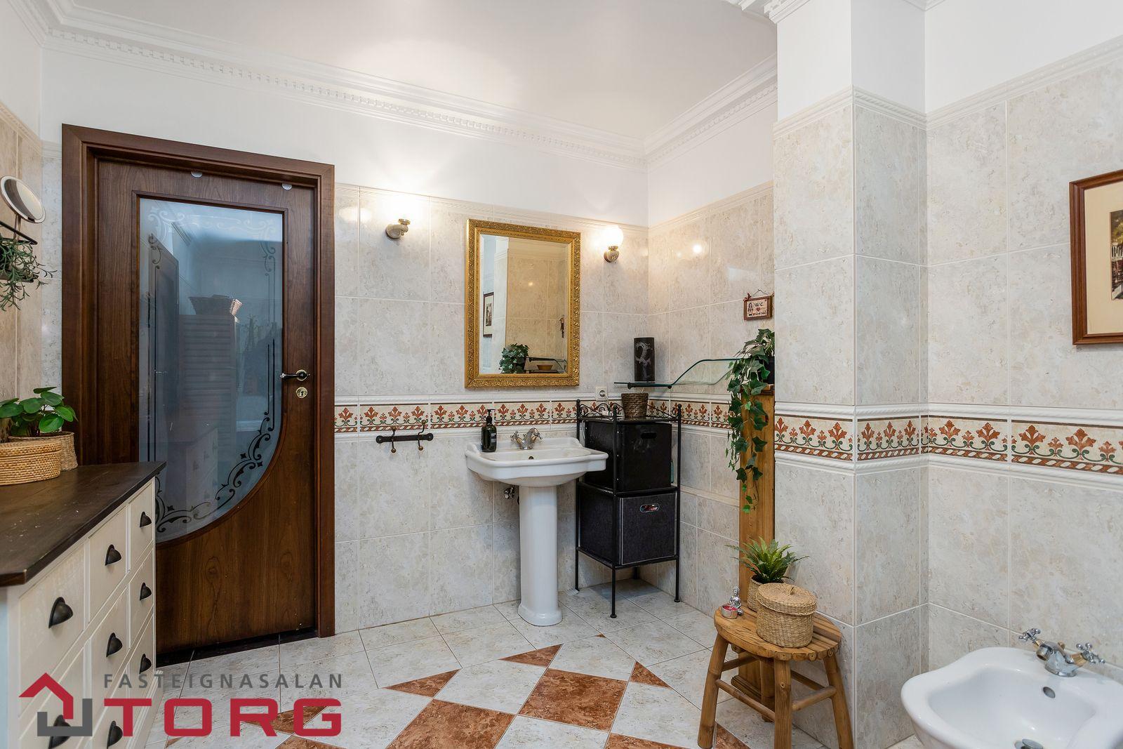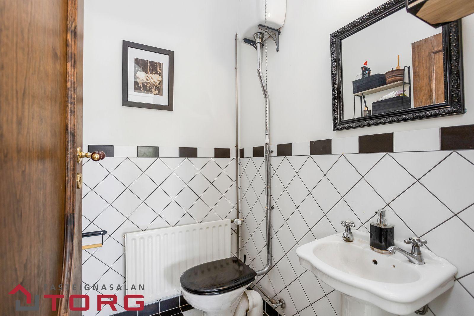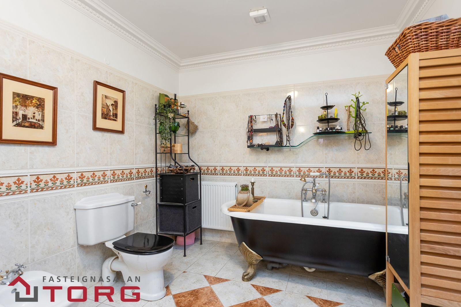 Baðherbergi er glæsilegt, með baðkari og flísalagt í hólf og gólf.