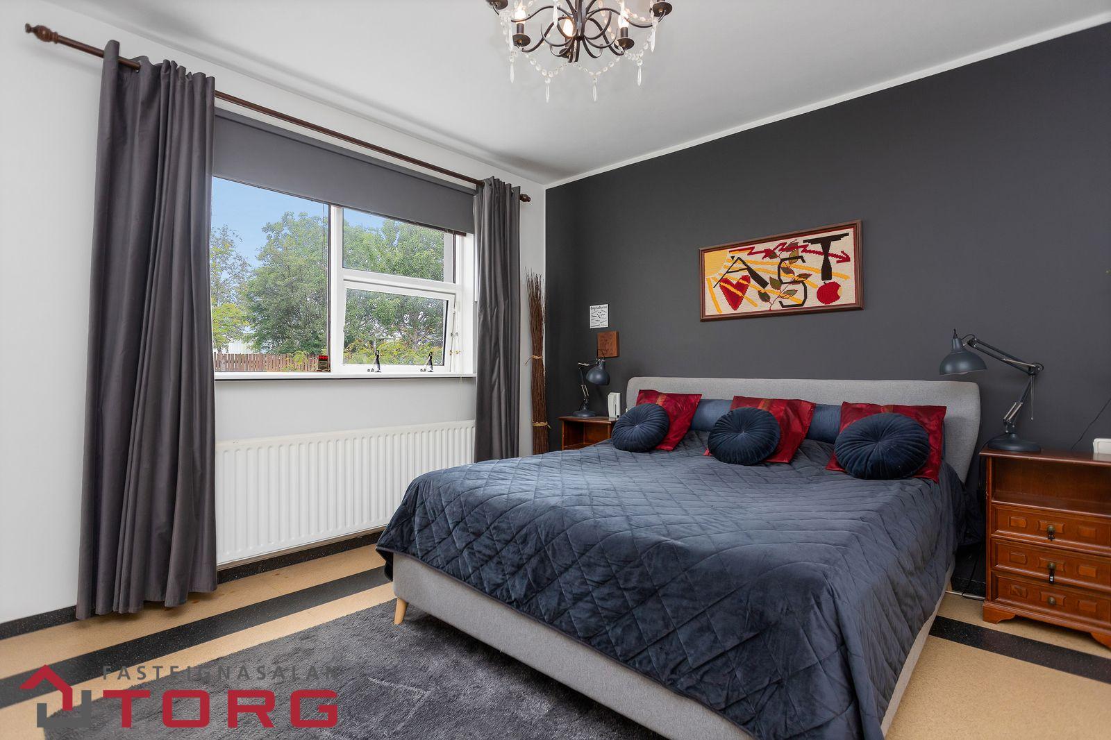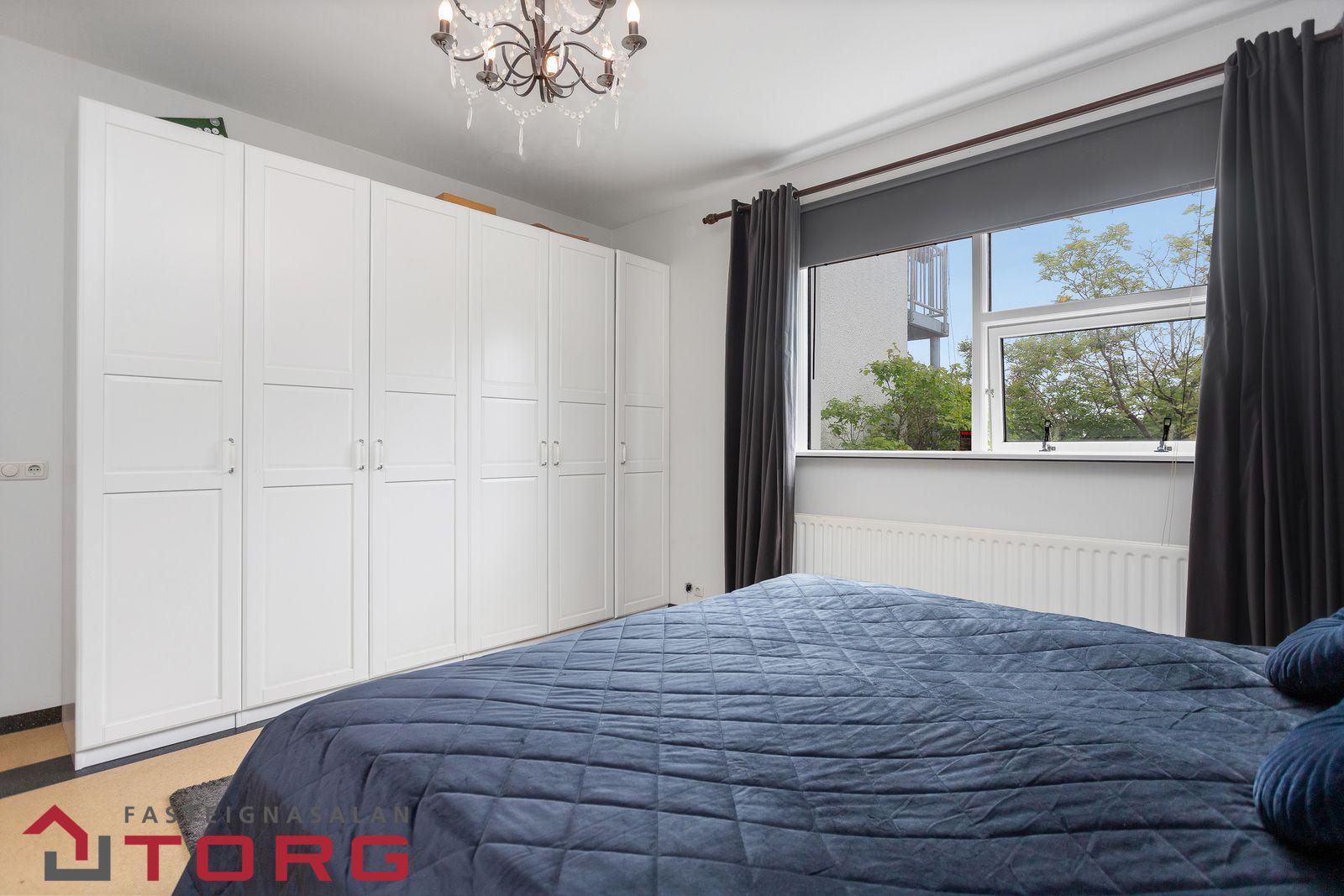 Hjónaherbergi er mjög rúmgott með dúk á gólfi og góðum fataskáp.
