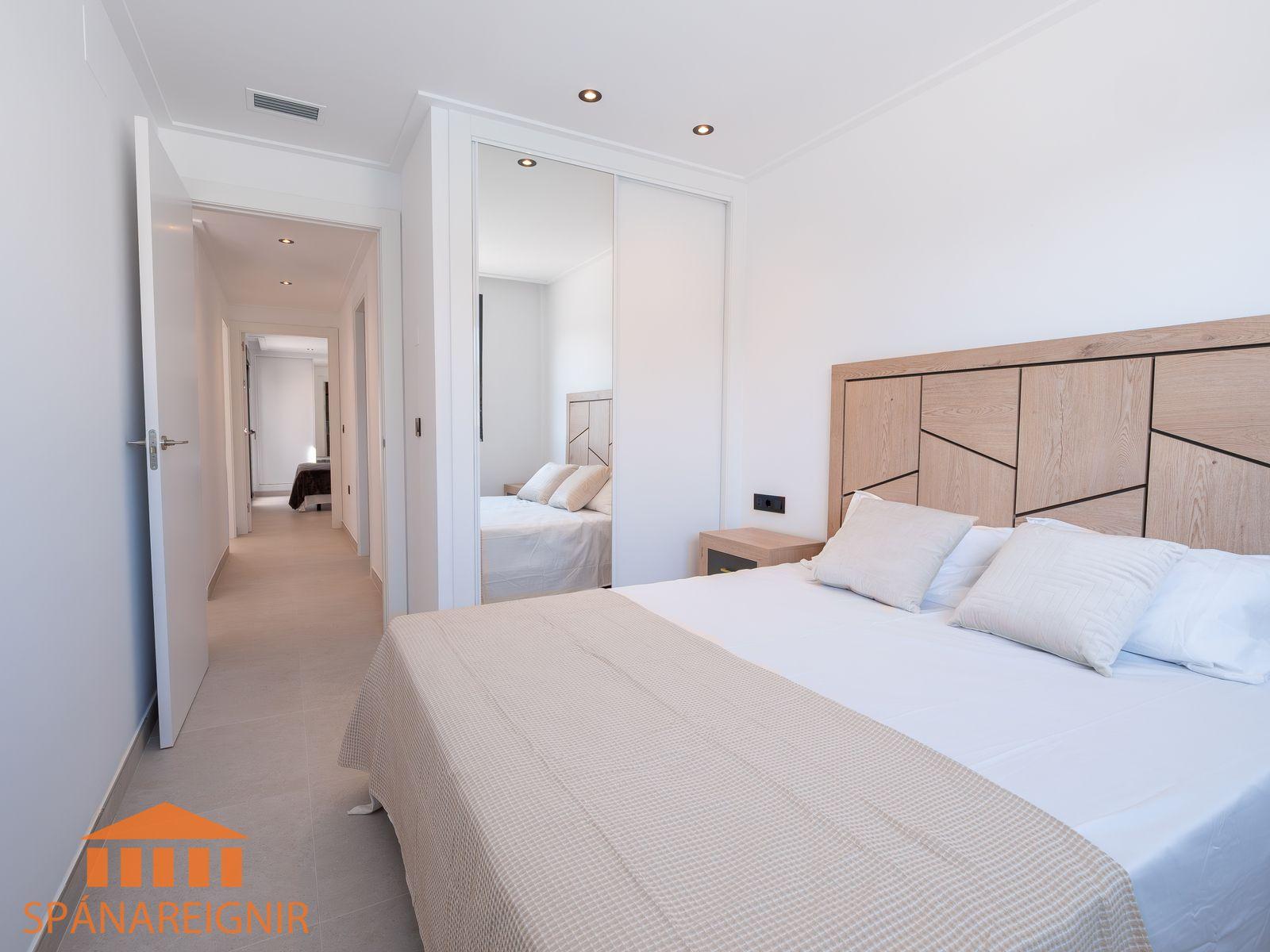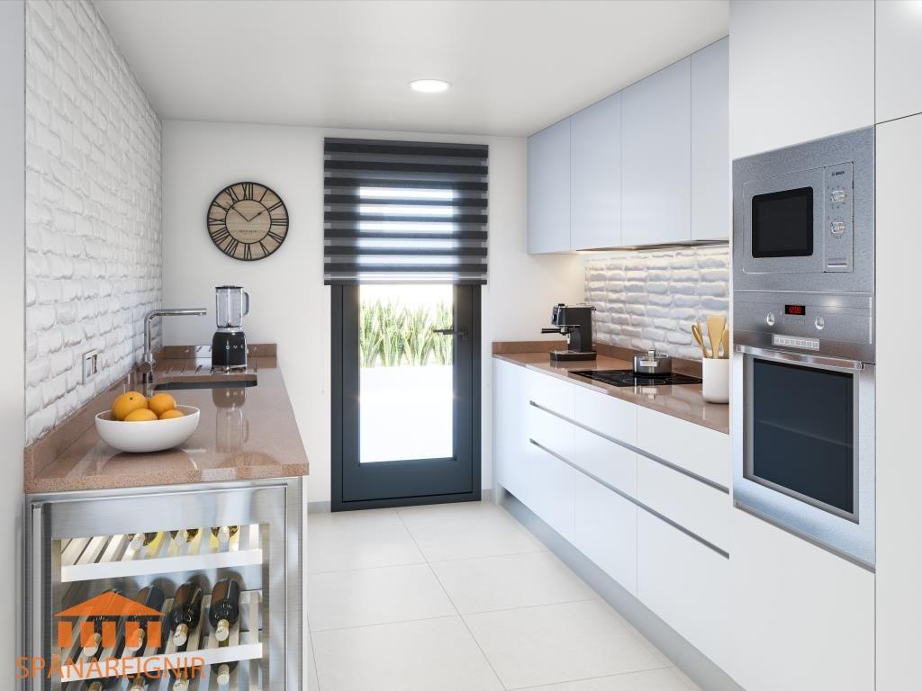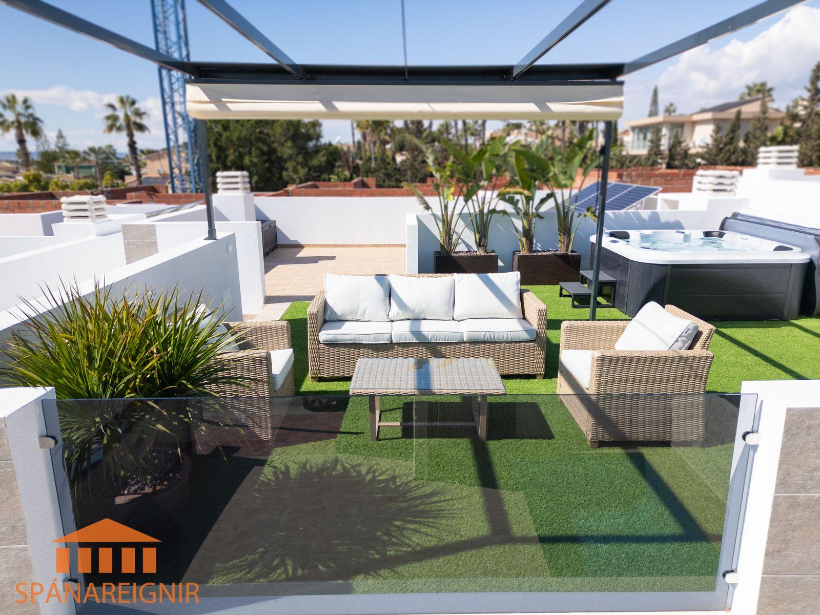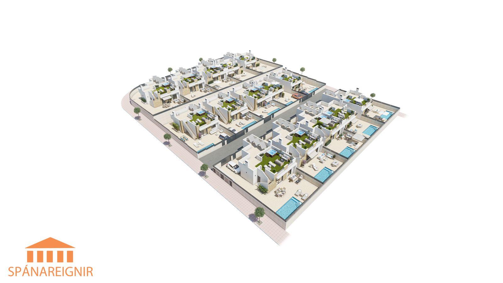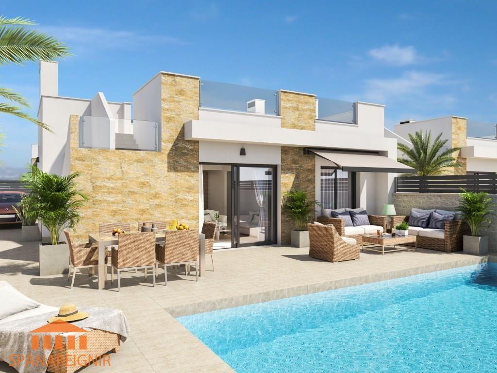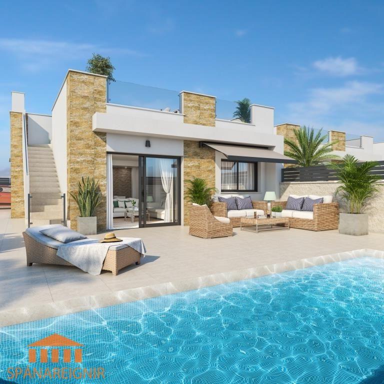Stórglæsileg, björt og vel hönnuð glæný einbýlishús á einni hæð með lokuðum einkagarði og einkasundlaug í LA MARINA, um 20 mín akstur suður af Alicante. Þrjú svefnherbergi, tvö fullbúin baðherbergi, góð stofa, eldhús opið við borðstofu. Flott hönnun. Góð verönd framan við húsið. Stór lokaður einkagarður með einkasundlaug. Góðar þaksvalir með möguleika á heitum potti. Bílastæði inni á lokaðri lóð.