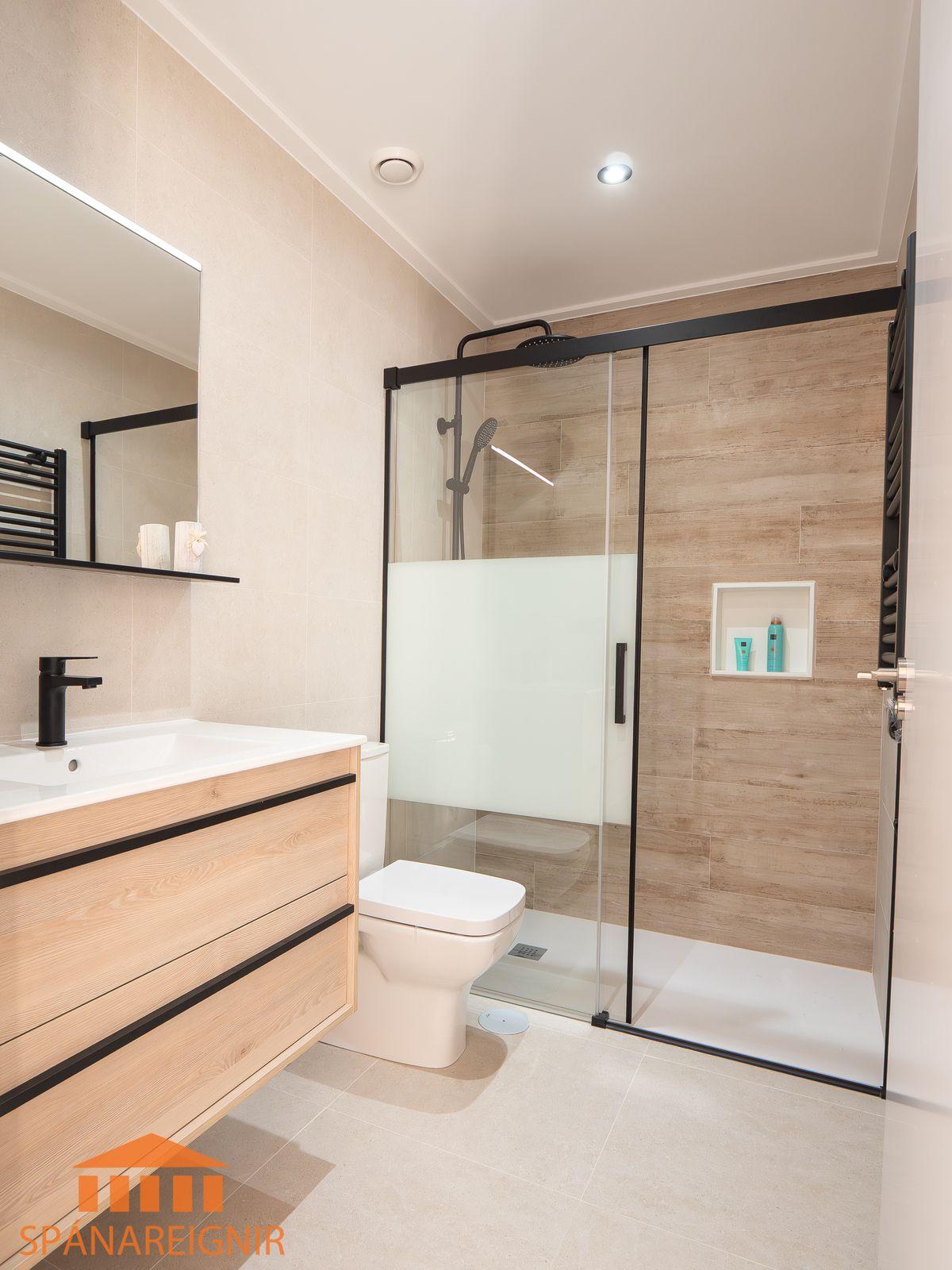 Fullbúin baðherbergi með sturtugleri og speglum.