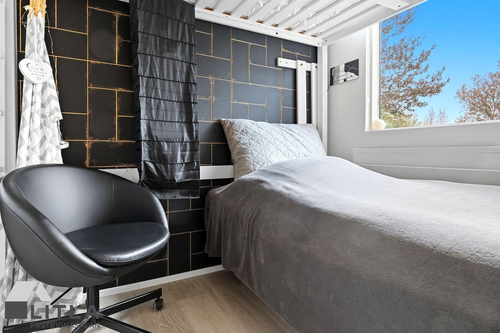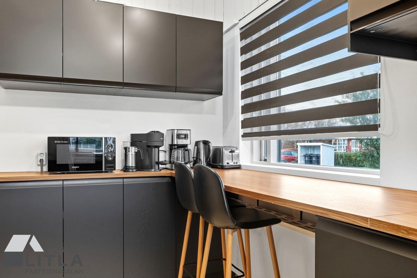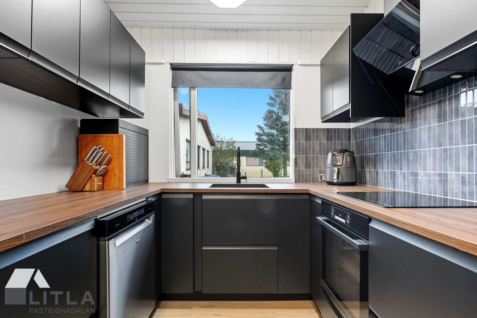 Eldhús er með nýlegri svartri innréttingu, setusvæði og harðparket á gólfi