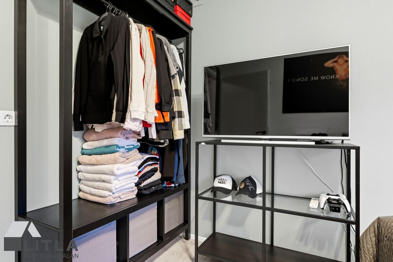 Þrjú svefnherbergi eru með harðparketi á gólfi, fataskápur í stærsta herberginu
