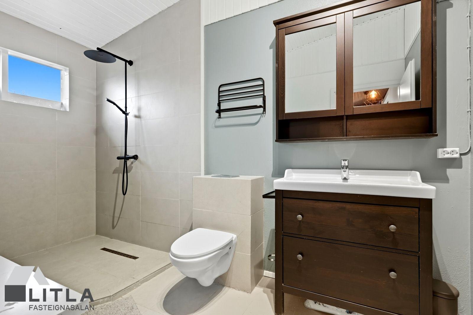 Baðherbergi er stórt með flísum á gólfi og sturturými, upphengdu salerni, handklæðaofn og innréttingu