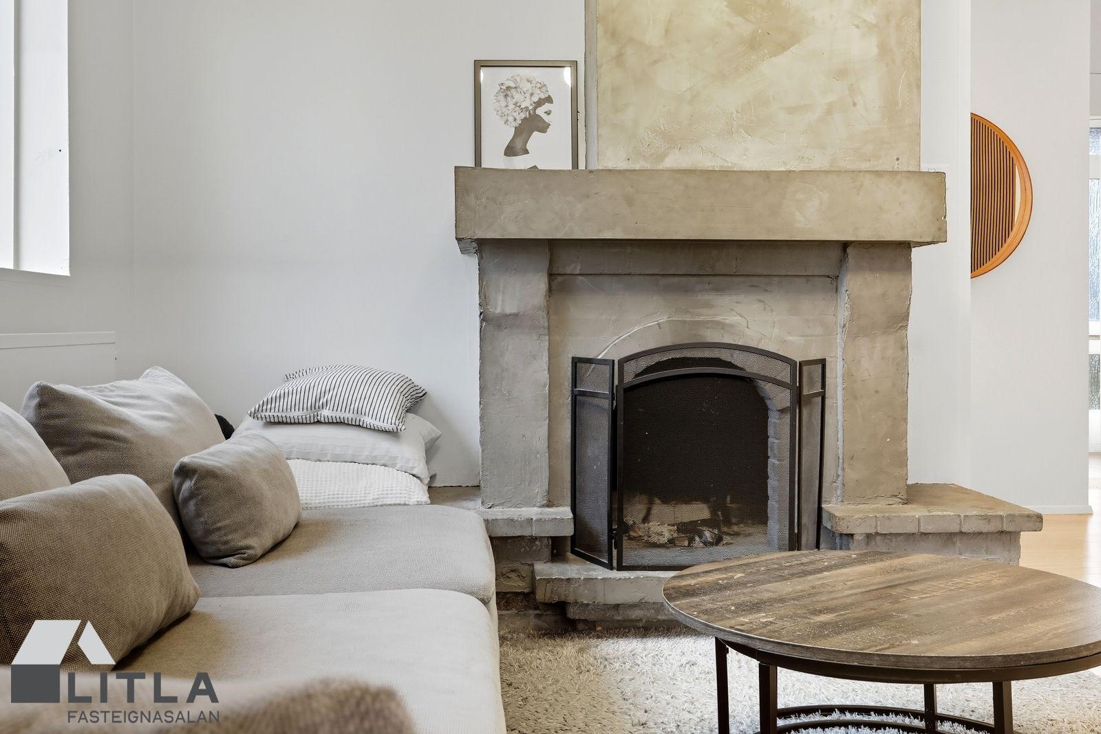 Stofa er björt með stóran arin, harðparket á gólfi og hurð út í garð