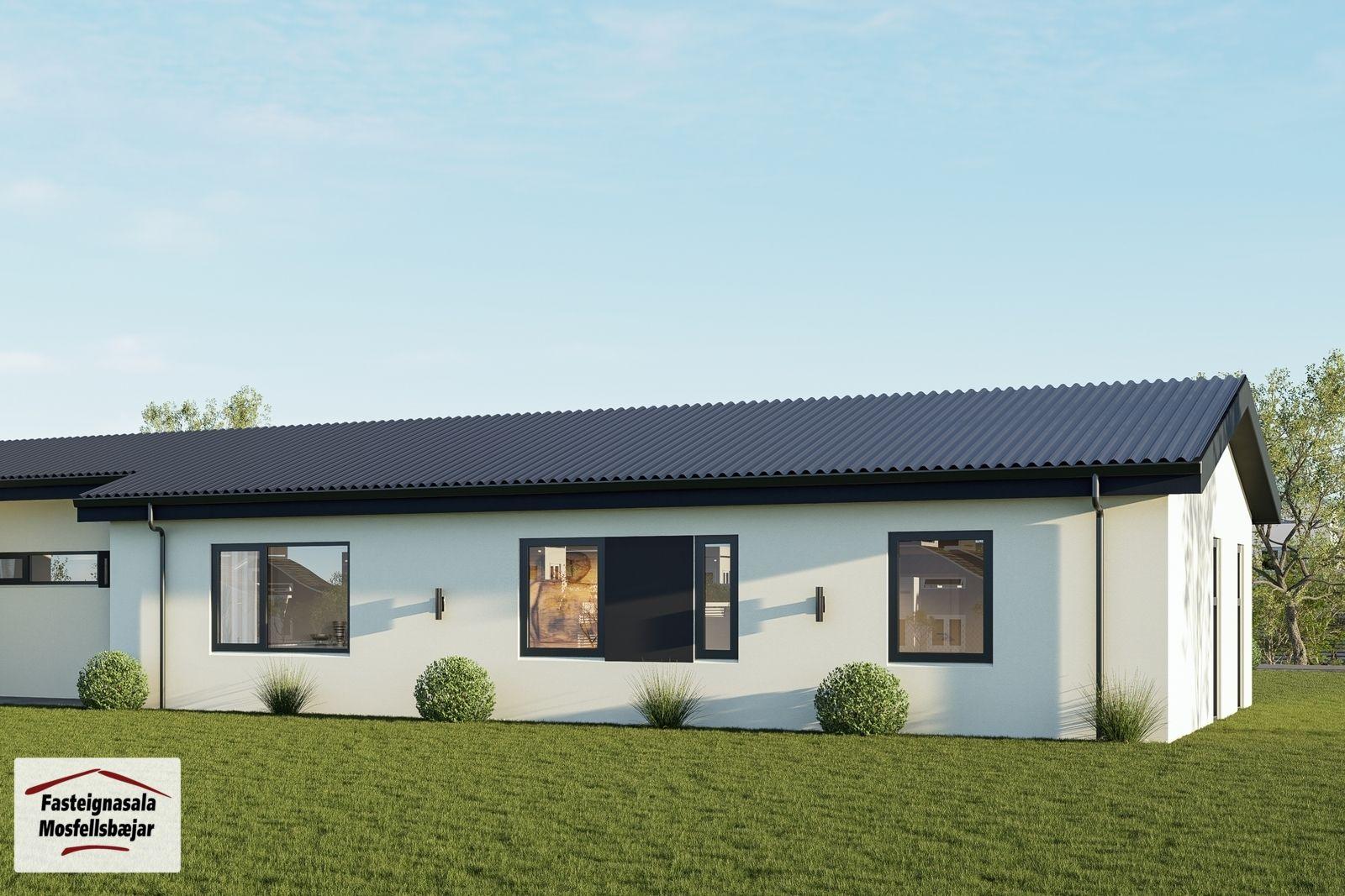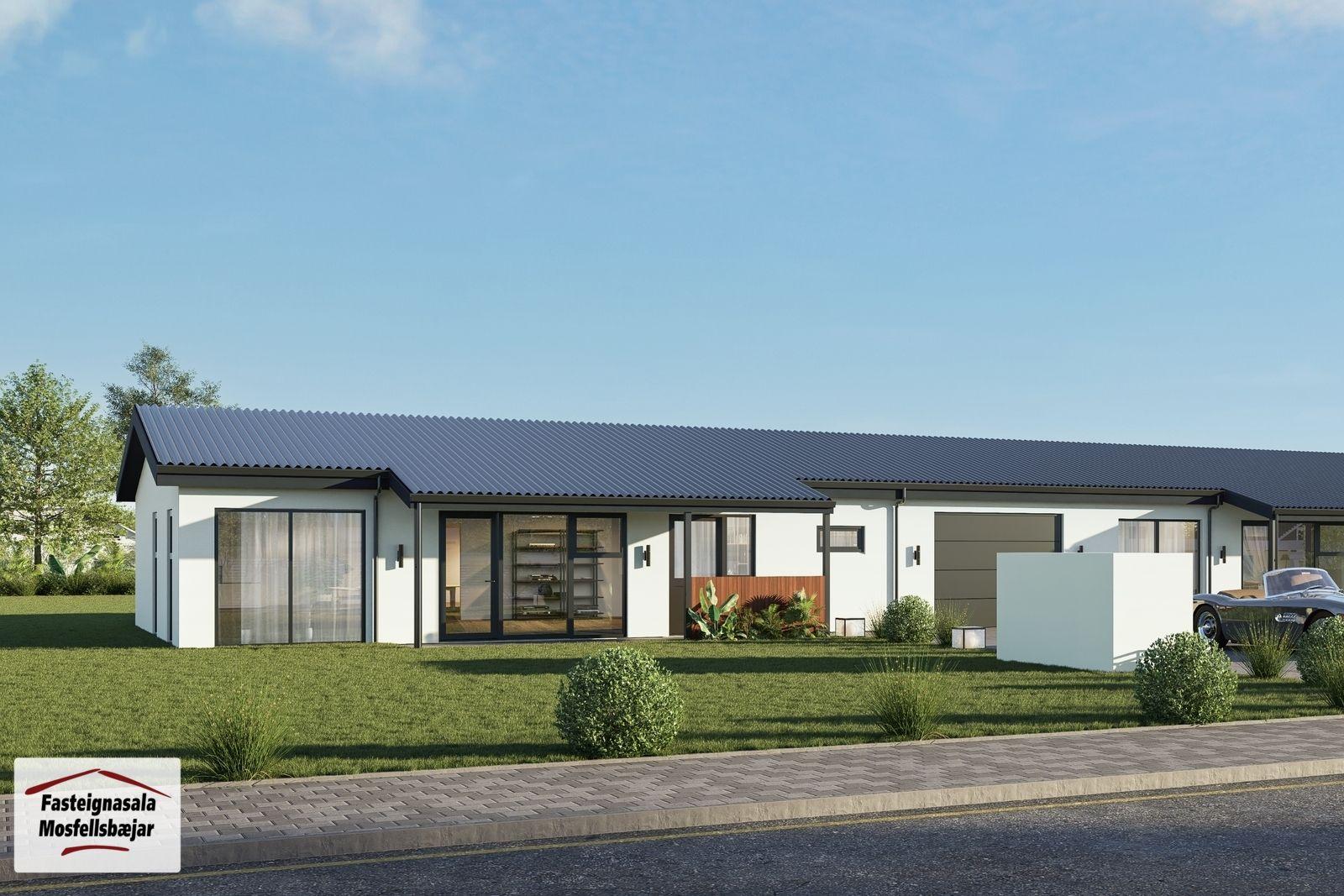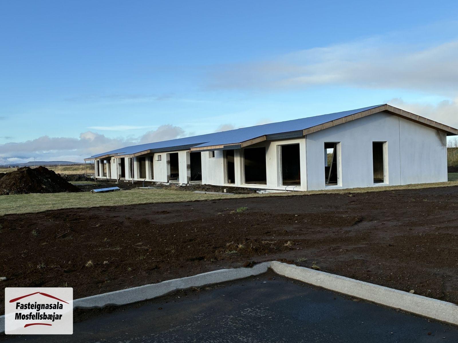 Smelltu hér til að fá söluyfirlit sent strax.Skilalýsing er eftirfarandi:Utanhúss: Raðhús á einni hæð með bílskúr byggt úr forsteyptum einingum frá Steypustöðinni.
