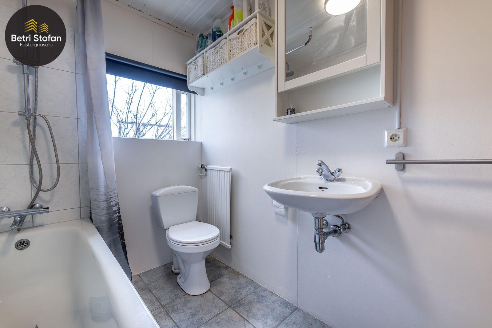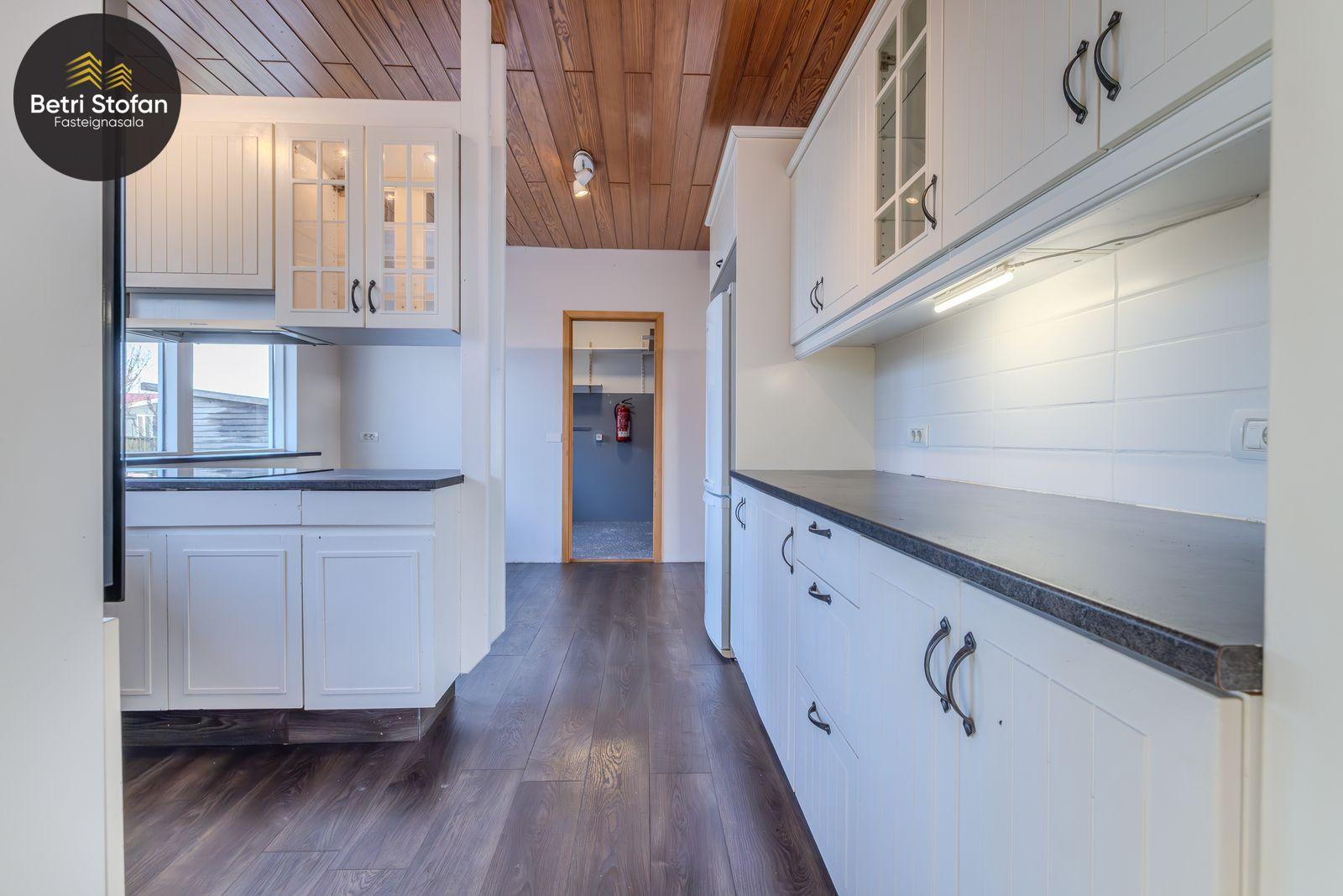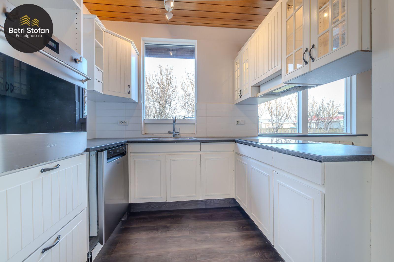 Eldhús: Rúmgott eldhús, gengið í innaf stofu. Ljós eldhúsinnrétting með góða skápaplássi og borðkrók.