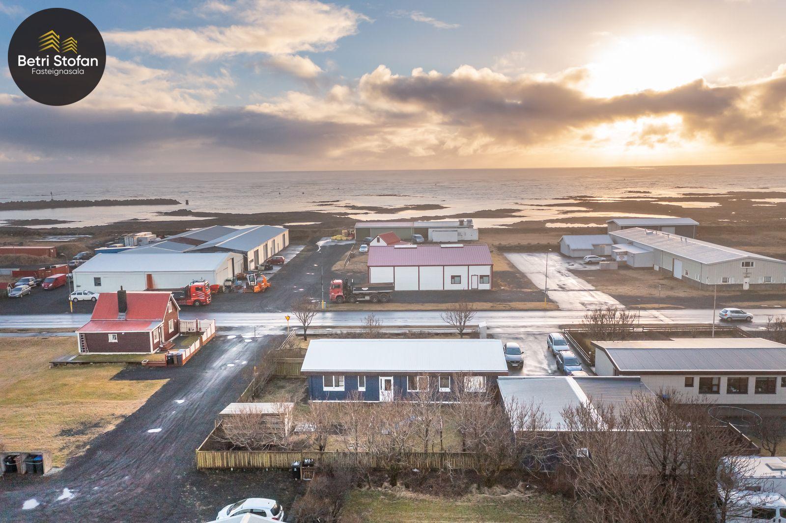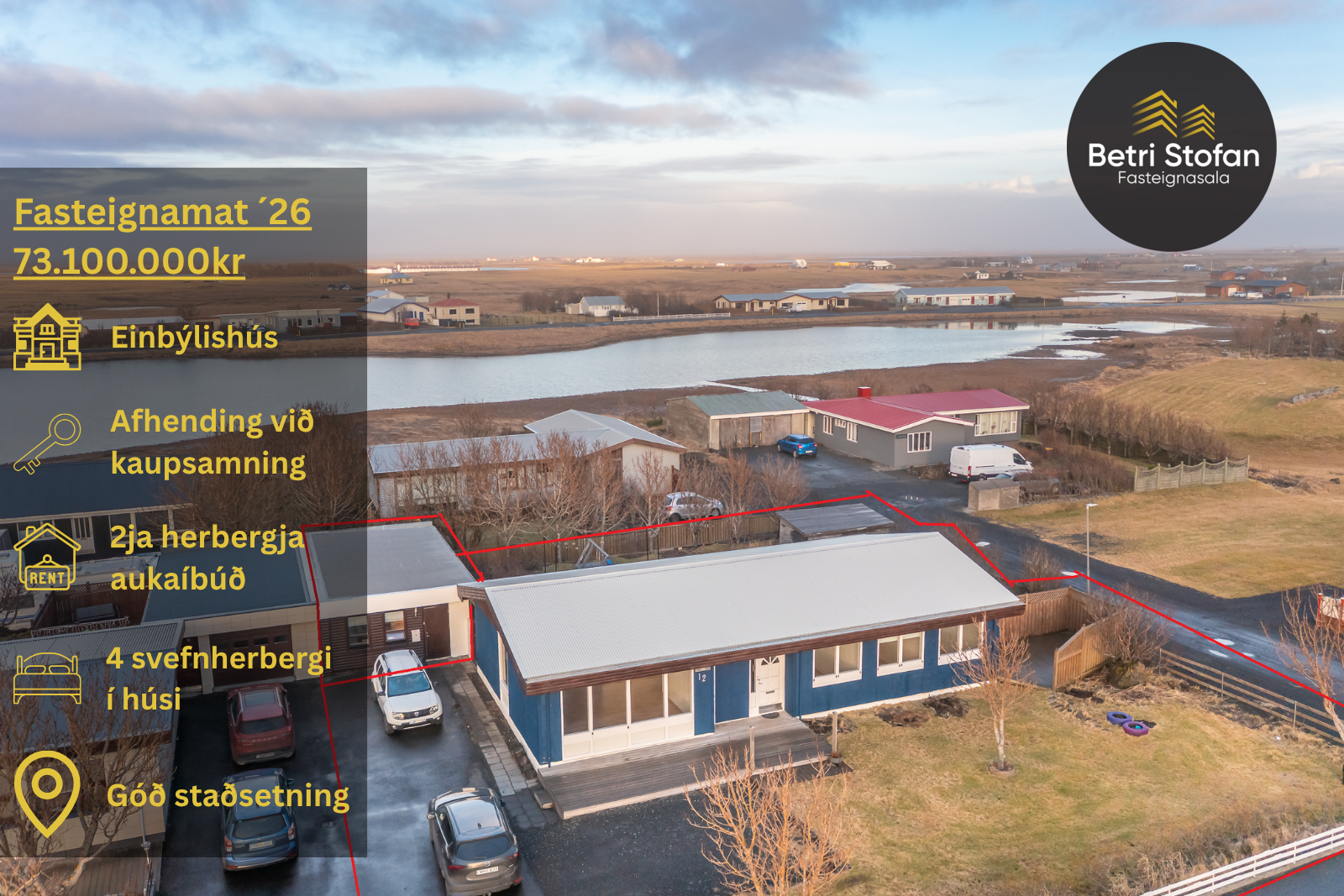Betri Stofan Fasteignasala og Hreiðar Levý lögg. fasteignasali kynna 190,3fm, 5 herbergja steinsteypt einbýlishús á einni hæð með 50fm bílskúr sem búið er að breyta í 2ja herbergja aukaíbúð að Eyrarbraut 12, 825 Stokkseyri, nánar tiltekið eign merkt 01-01, fastanúmer 219-9595 ásamt öllu því sem eigninni fylgir, þar með talið tilheyrandi lóðar og sameignarréttindi. Góð aðkoma er að húsinu á steypt bílaplan. Fallegur afgirtur garður í kringum húsið með viðarpalli fyrir framan hús og á austurgafli hússins. Húsið skiptist í forstofu, rúmgóða stofu, eldhús með borðkrók, 4 svefnherbergi, baðherbergi með sturtu og baði, gestasalerni ásamt rúmgóðu þvottahúsi með útgengi út í bakgarð. 50fm bílskúr sem var standsettur sem 2ja herbergja íbúð árið 2018. Eignin er laus til afhendingar við kaupsamning.