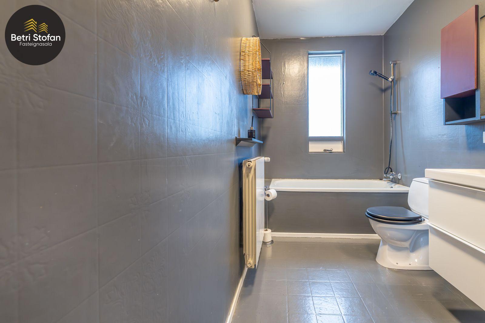 Baðherbergi: Rúmgott með baði og sturtu. Flísar á gólfi og á vegg í sturtu. Dúkur á veggjum.